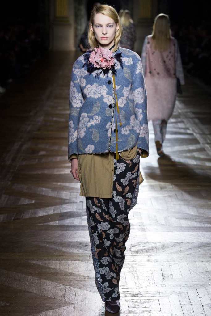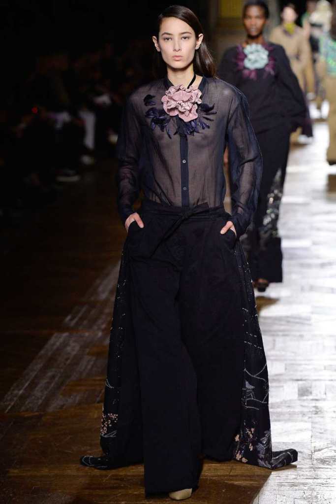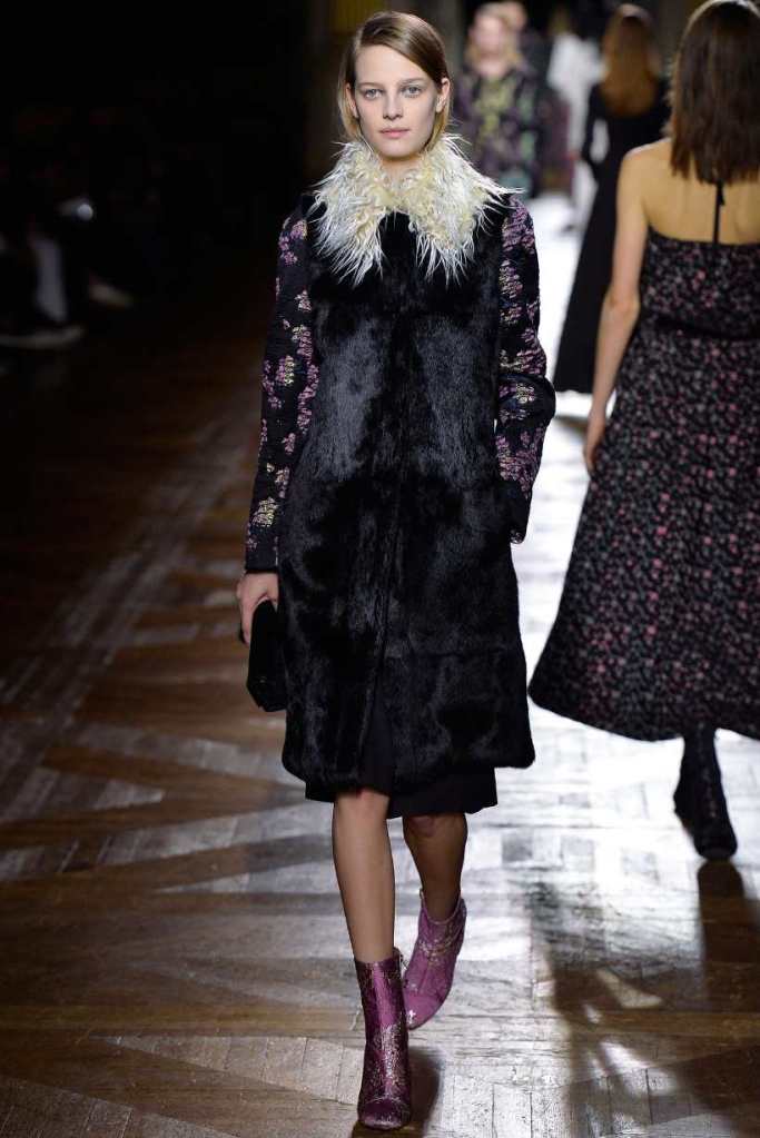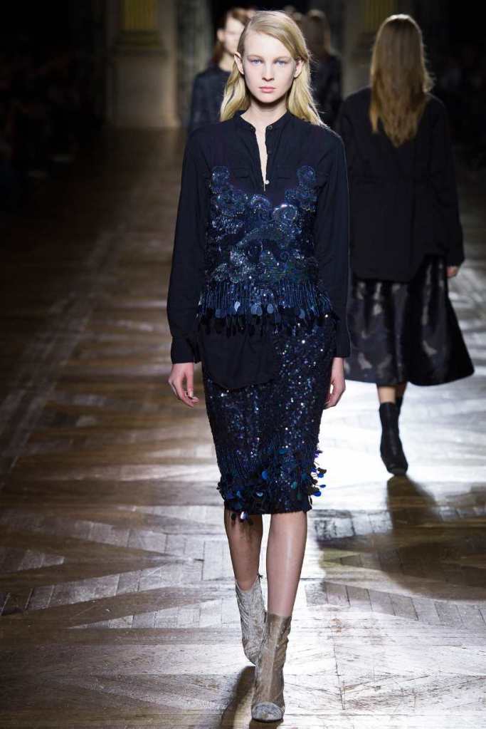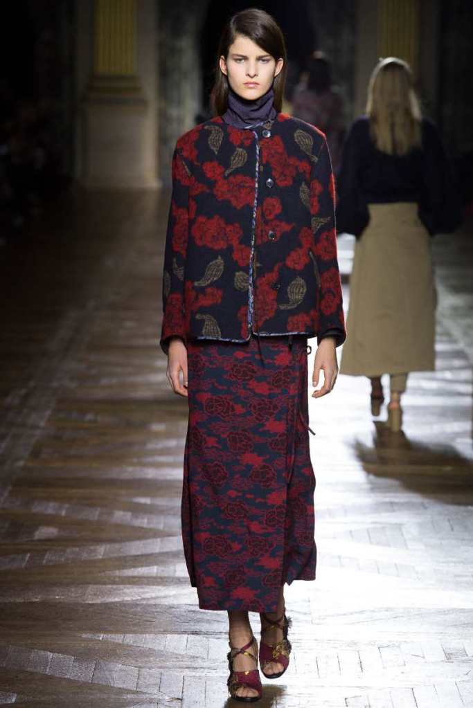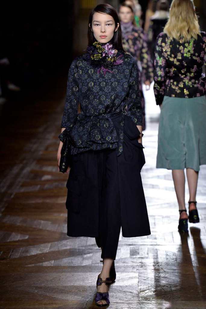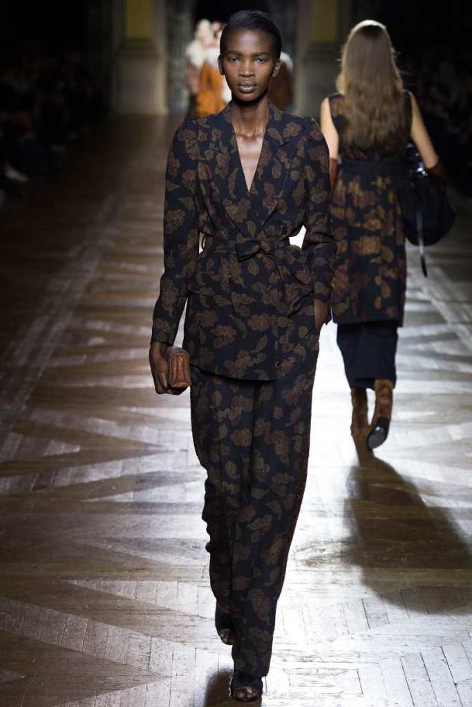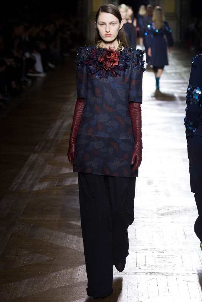 Luxe Bohemia at its finest, with gilding, brocade, and sequins elevating glamour while chinos and baggy shorts grounded the looks. The rich brocades, khakis, and faux furs created an opulent ambiance, while roomy silhouettes comforted the feminine form. With grounded glamour as its motto, the collection exuded eclectic warmth, layering surprising elements in signature style. The Orientalia influence harkened back to Van Noten’s early triumphs, yet he deftly remodeled the past with sheer power and empowerment.