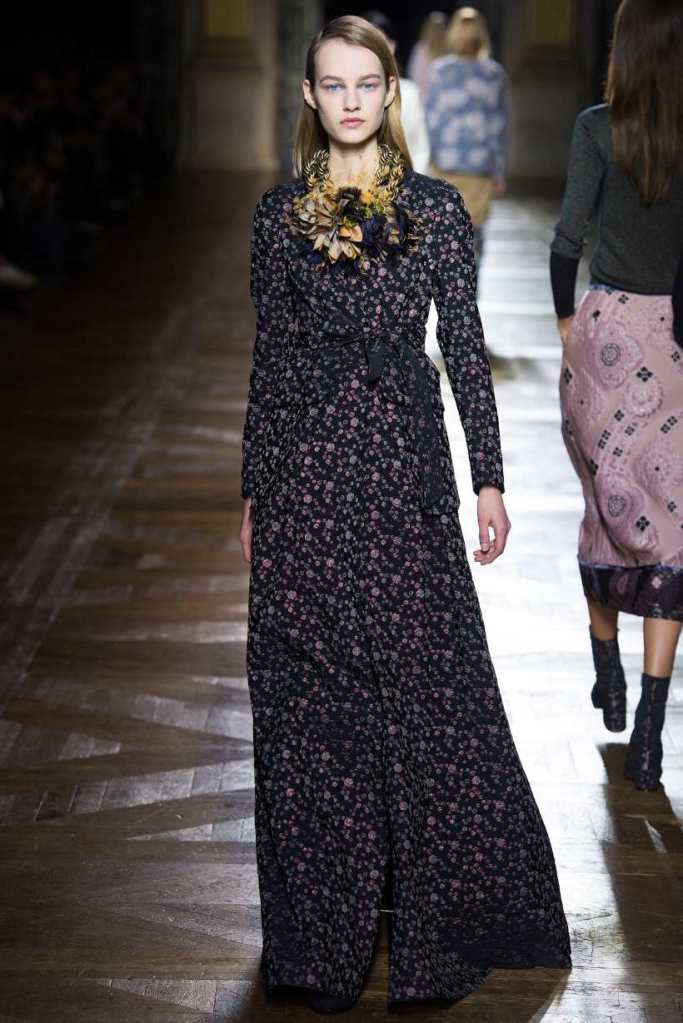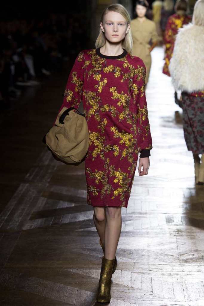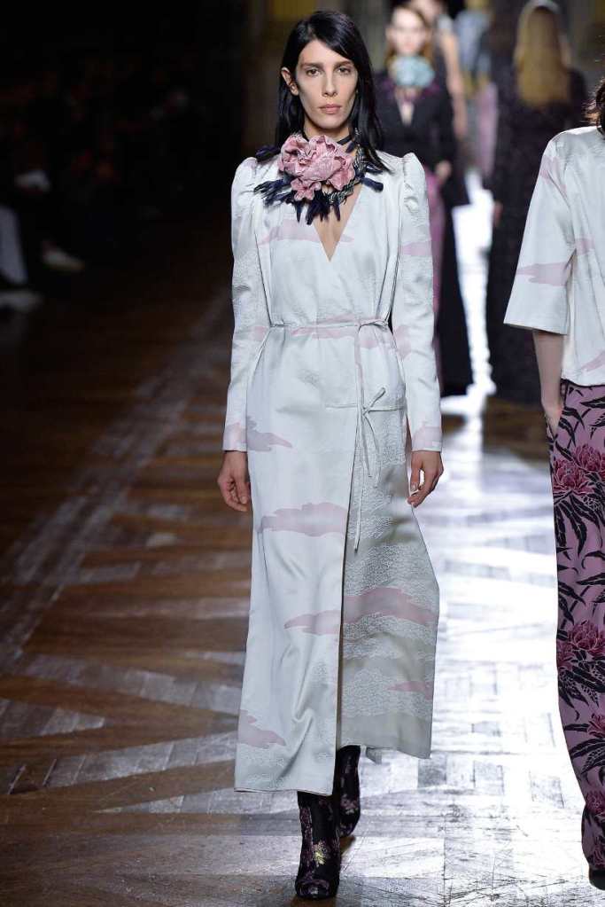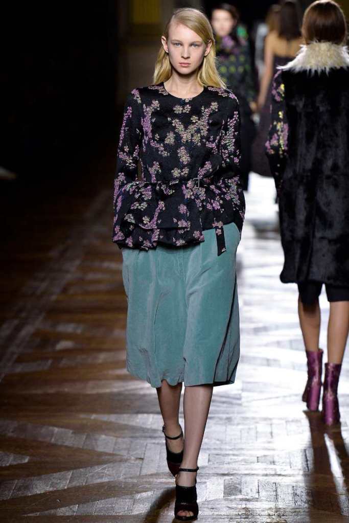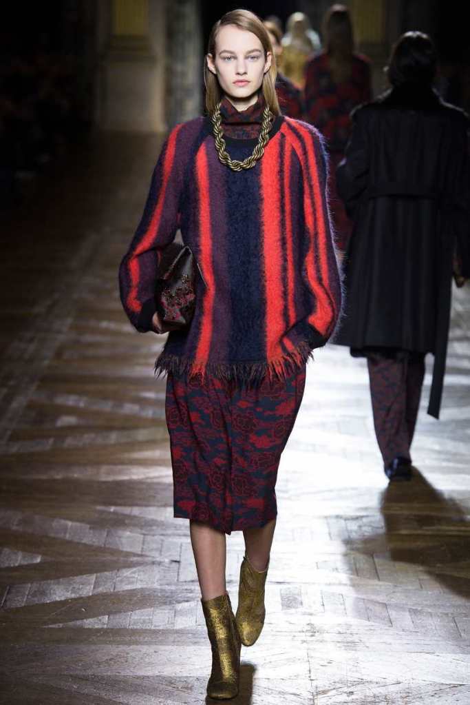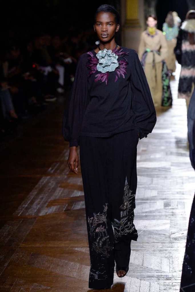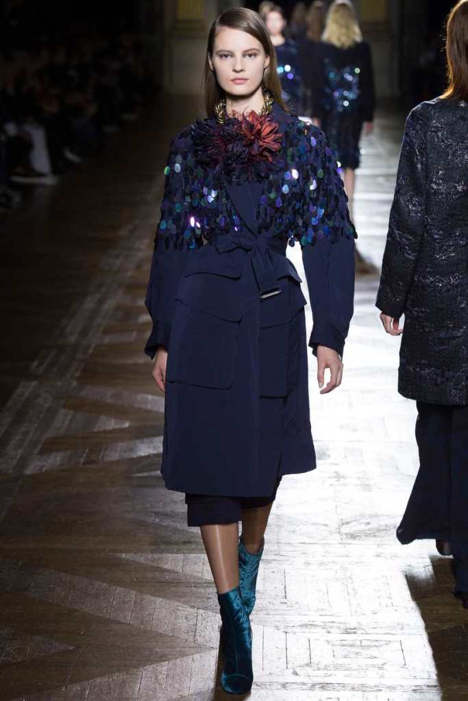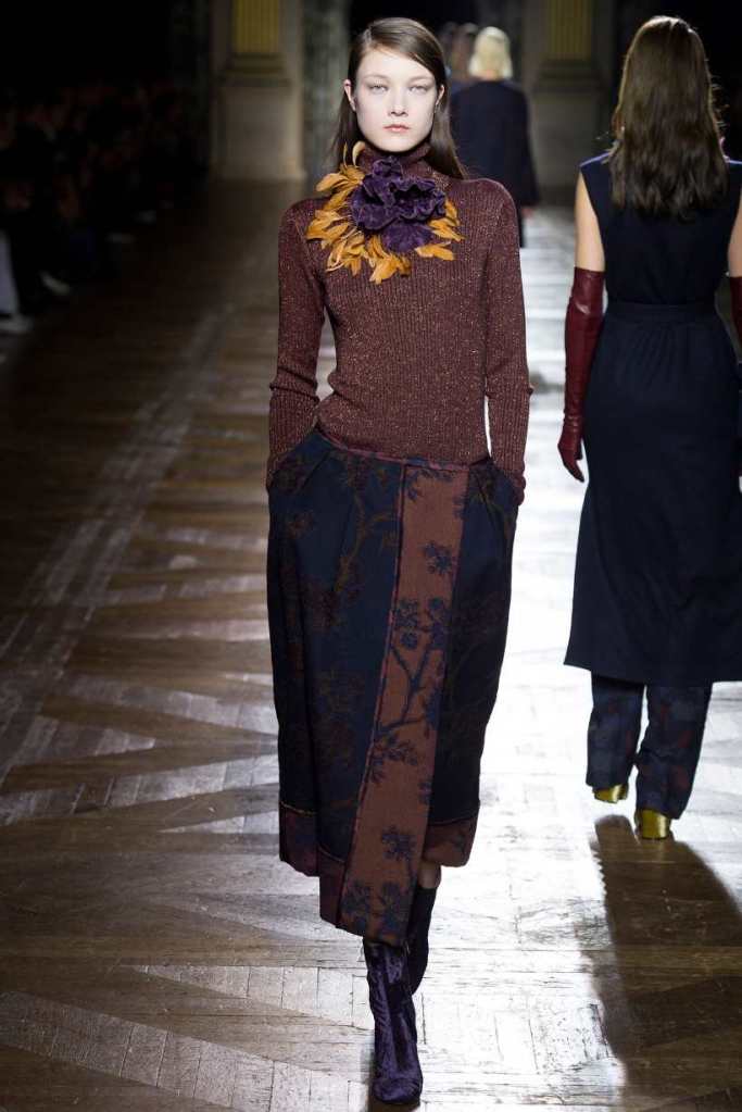 Luxe Bohemia at its finest, with gilding, brocade, and sequins elevating glamour while chinos and baggy shorts grounded the looks. The rich brocades, khakis, and faux furs created an opulent ambiance, while roomy silhouettes comforted the feminine form. With grounded glamour as its motto, the collection exuded eclectic warmth, layering surprising elements in signature style. The Orientalia influence harkened back to Van Noten’s early triumphs, yet he deftly remodeled the past with sheer power and empowerment.