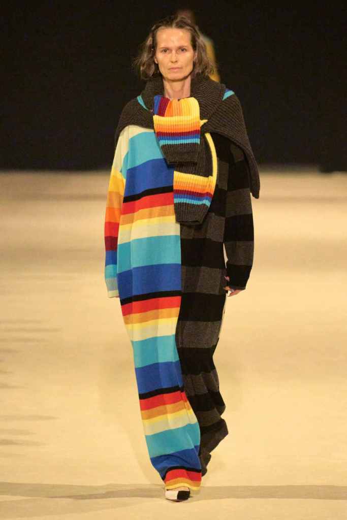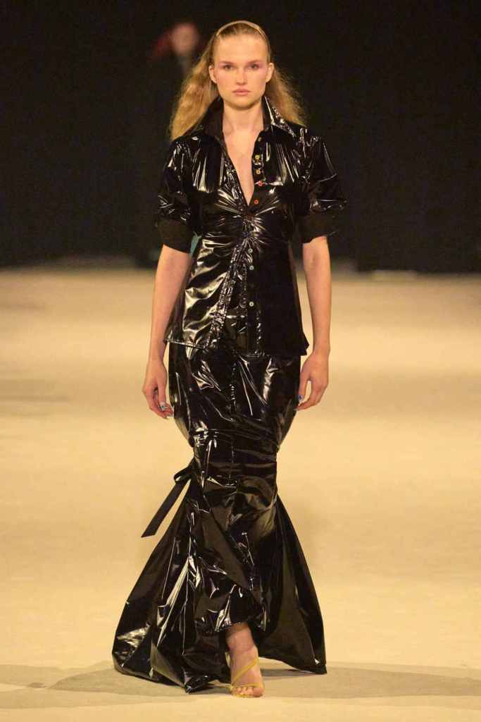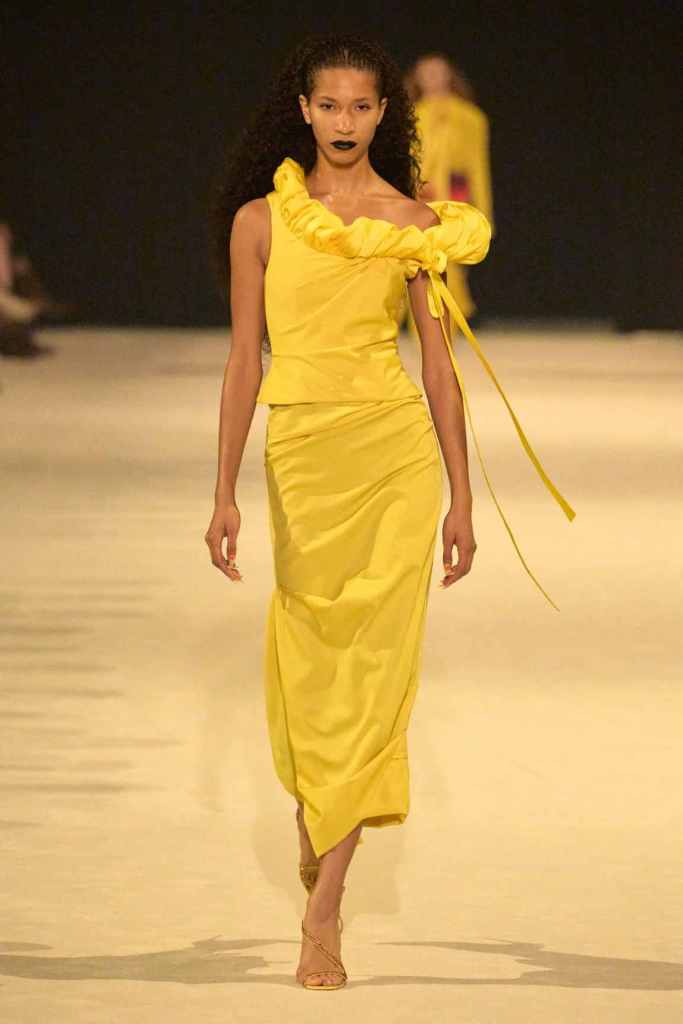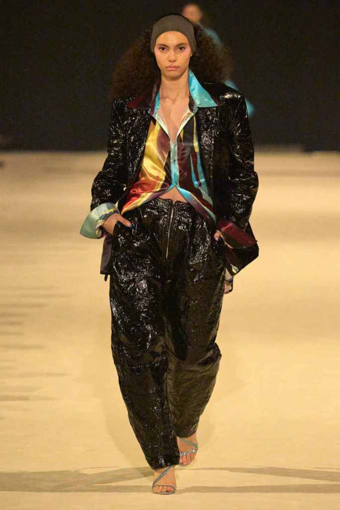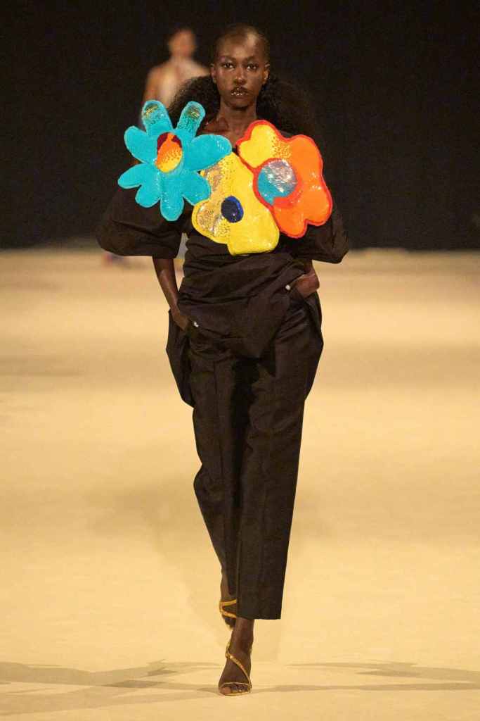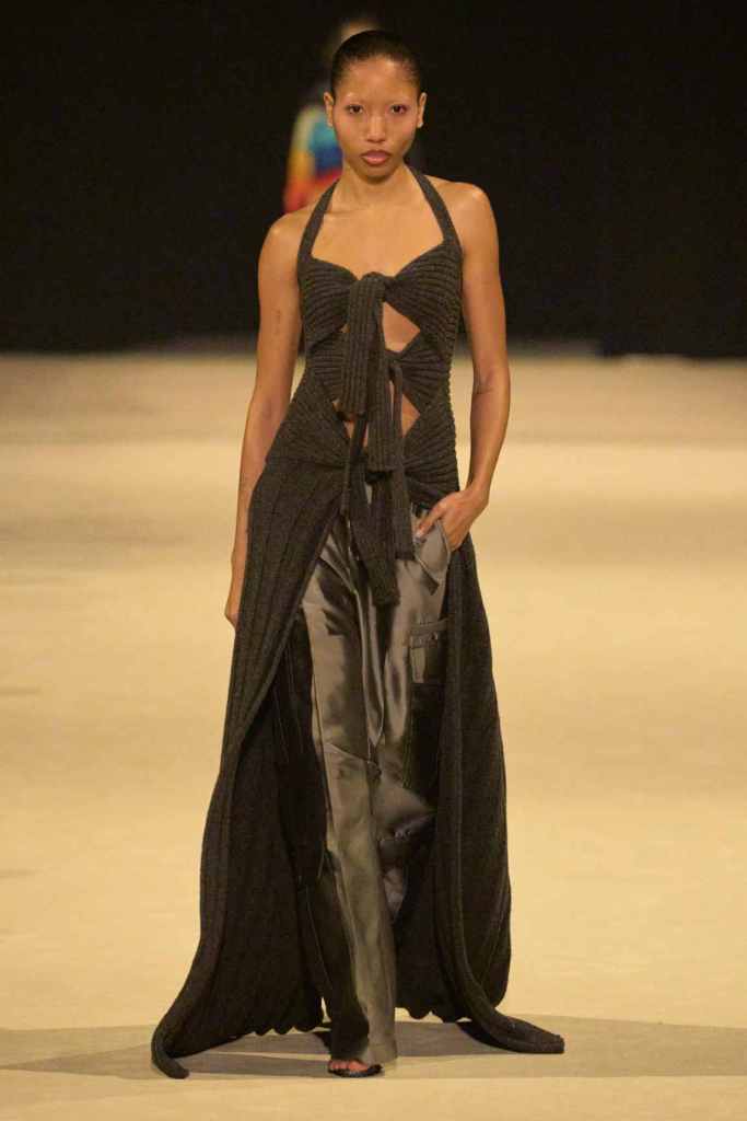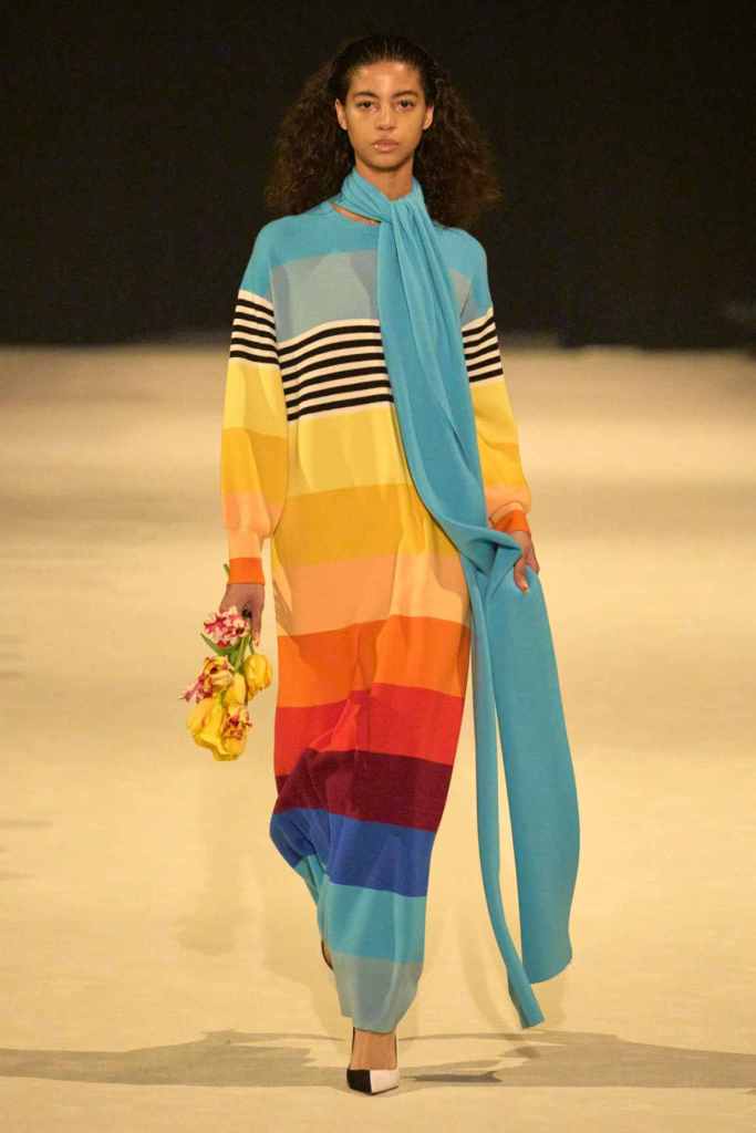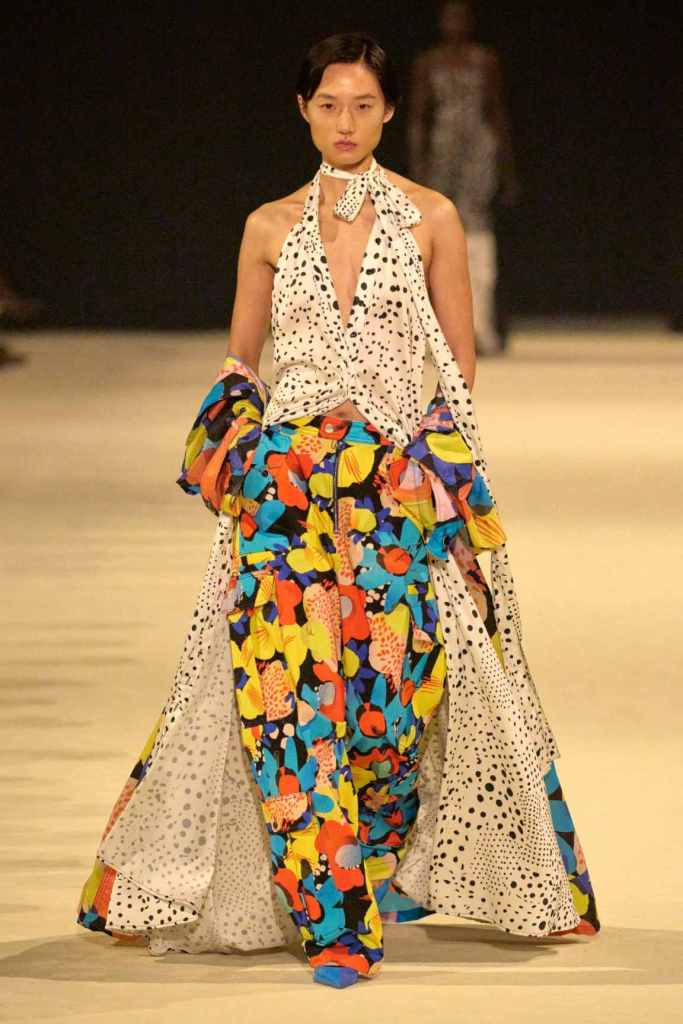 With his signature rainbow stripes and bold polka dots, Rogers takes us on a whimsical journey filled with calming colors and avant-garde silhouettes. Each garment is meticulously crafted, showcasing his mastery of color, texture, and fit. From elegant ball skirts to draped tops, every garment is 100% CJR finesse & theater. From puffy black skirts to glossy finishes and rainbow buttons, Rogers effortlessly combines elements to create a visual feast for the eyes. The styling game is strong too, with shaggy knits and oversized sweater dresses stealing the show. Christopher John Rogers continues to push fashion forward with his brazen individuality. The combination of simplicity and emotions collide to create an uplifting energy.
