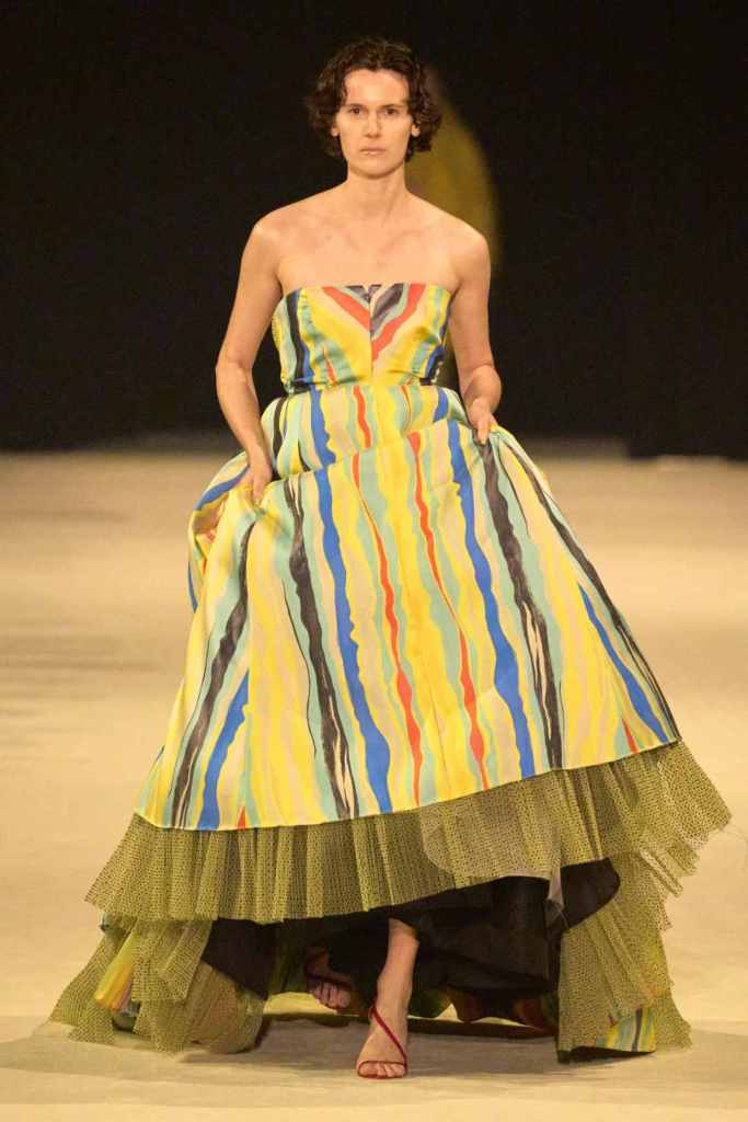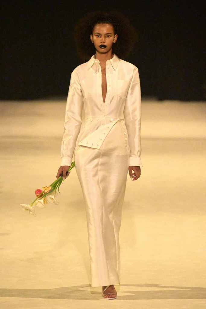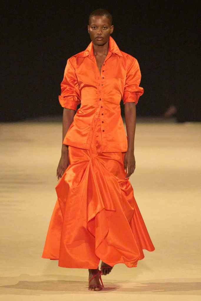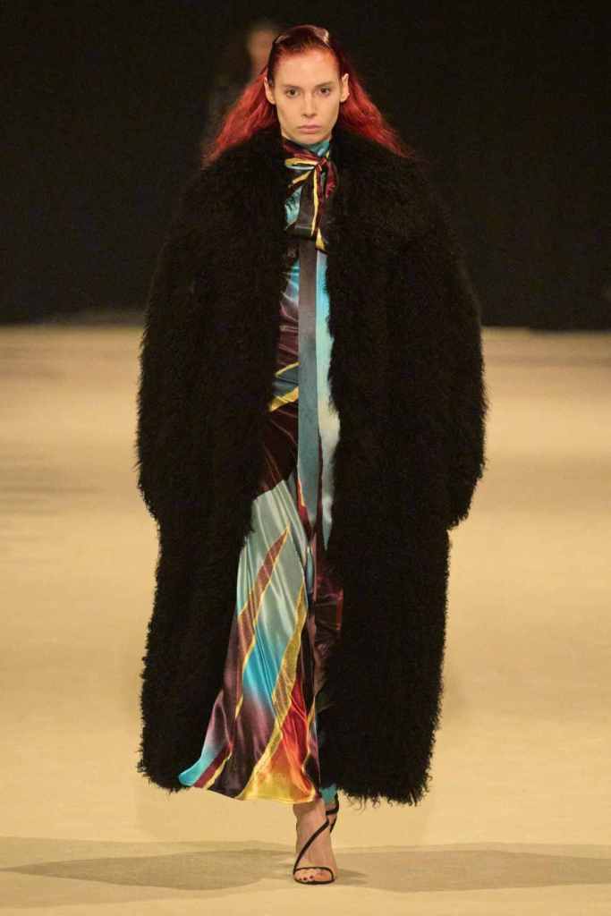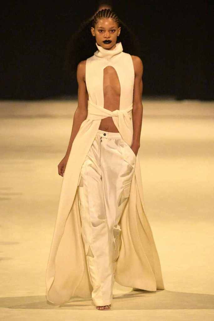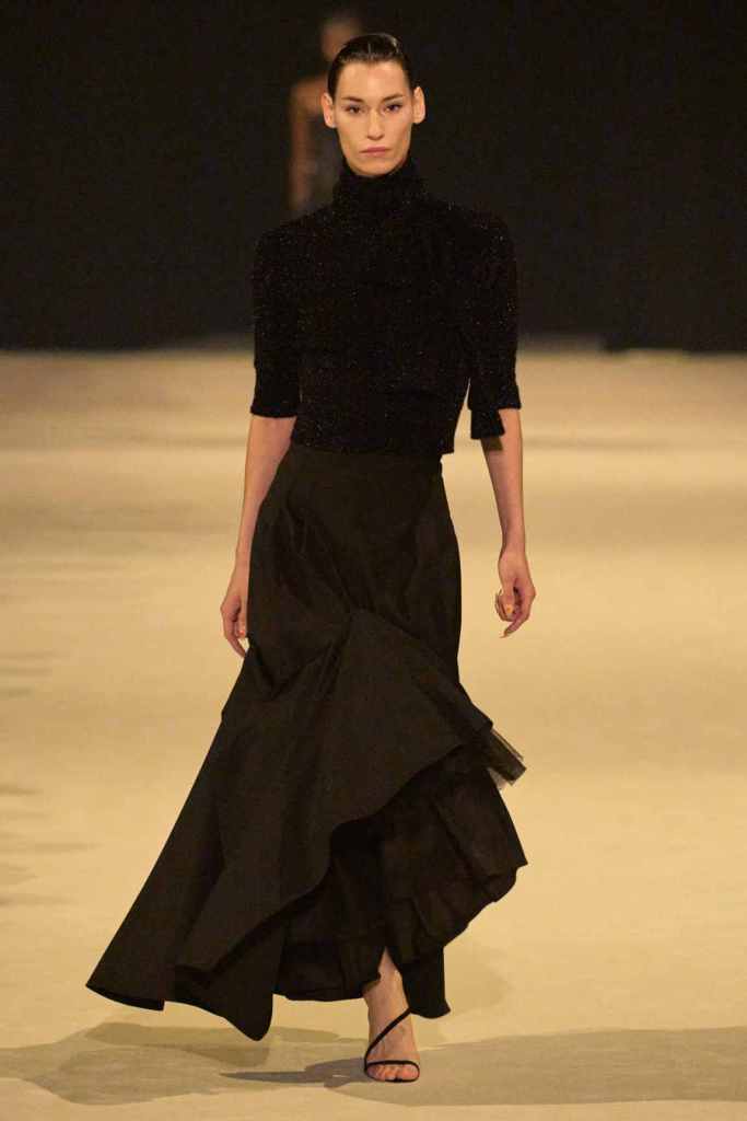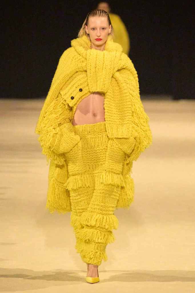 With his signature rainbow stripes and bold polka dots, Rogers takes us on a whimsical journey filled with calming colors and avant-garde silhouettes. Each garment is meticulously crafted, showcasing his mastery of color, texture, and fit. From elegant ball skirts to draped tops, every garment is 100% CJR finesse & theater. From puffy black skirts to glossy finishes and rainbow buttons, Rogers effortlessly combines elements to create a visual feast for the eyes. The styling game is strong too, with shaggy knits and oversized sweater dresses stealing the show. Christopher John Rogers continues to push fashion forward with his brazen individuality. The combination of simplicity and emotions collide to create an uplifting energy.
