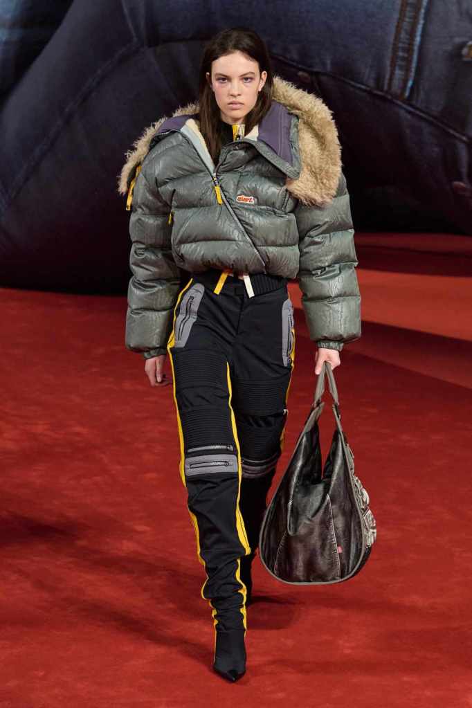 Glenn Martens is actually killing it. He has brought a fresh and avant-garde approach to denim, showcasing innovative interpretations. His collection featured oversized fur coats, mini skirts, layered trenches, and upgraded basics, all with a unique twist. One particularly notable element was the belt-like mini skirts, which added a dangerously hot and unforgettable touch. The use of distressed denim in unexpected places, along with metallic monochrome co-ords and trompe l’oeil moments, were also among the favorites of the collection. Martens has really turned around the Diesel design aesthetic for good.