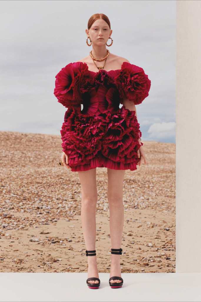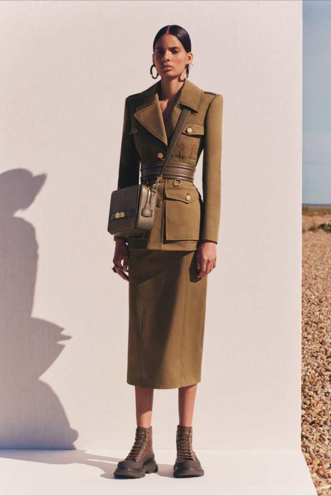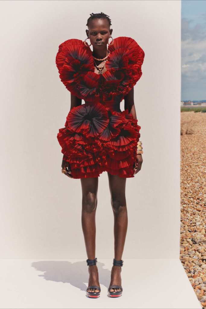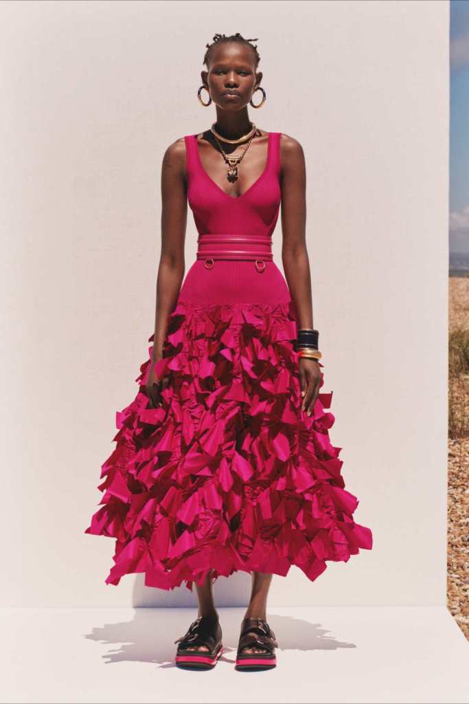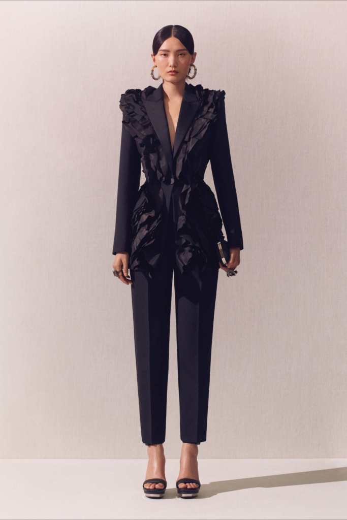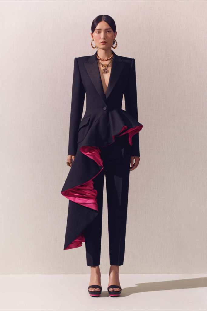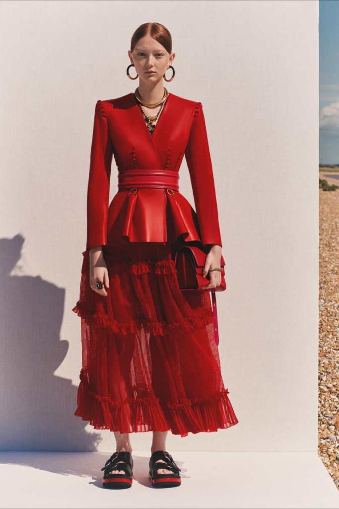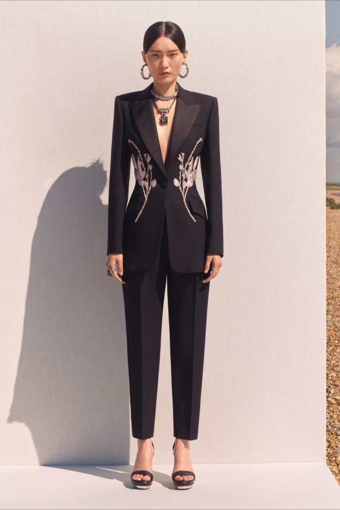 Drawing inspiration from vintage aesthetics and vibrant flora, the designs featured an array of textures and styles. Bougainvillea pink hues bloomed across the collection, adorning sheer tiered skirts, ruffle tops, and taffeta skirts. Complementing these intricate details, Sarah Burton introduced tailored pieces, such as military suits, laser-cut leather skirt suits, and tuxedo jackets, embroidered with silver herbs.