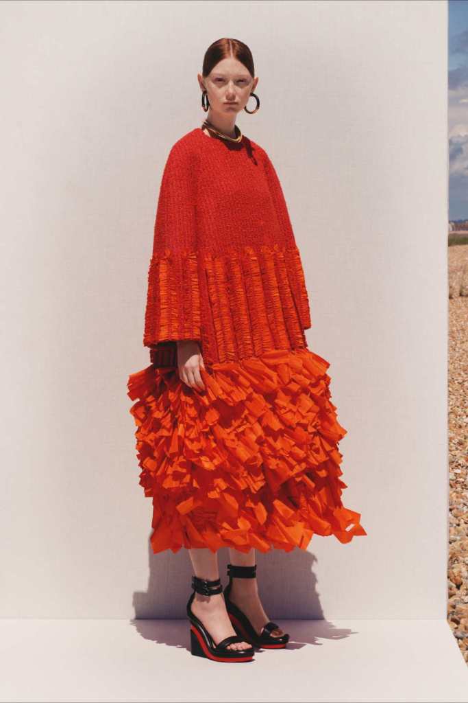 Their collection features dresses and coats that transform from rib-knit bodies into vibrant eruptions of taffeta strips, exuding confidence while celebrating nature’s abundant tapestry. The floral designs, inspired by endangered and extinct flowers, were meticulously illustrated based on specimens from the Royal Botanic Gardens at Kew. This collection not only showcases Burton’s emphasis on British tailoring heritage.