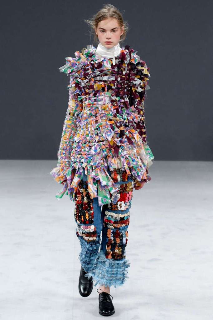 Intricately woven, meticulously crafted, this Viktor & Rolf collection is a symphony of textures and forms. The artistry of embroidery is the highlight, showcasing lush and intricate blends of repurposed buttons, beads, and crystals. These embellishments harmoniously merge with the fabric, creating a tapestry of opulence and elegance, while exuding an organic allure that captivates the senses.