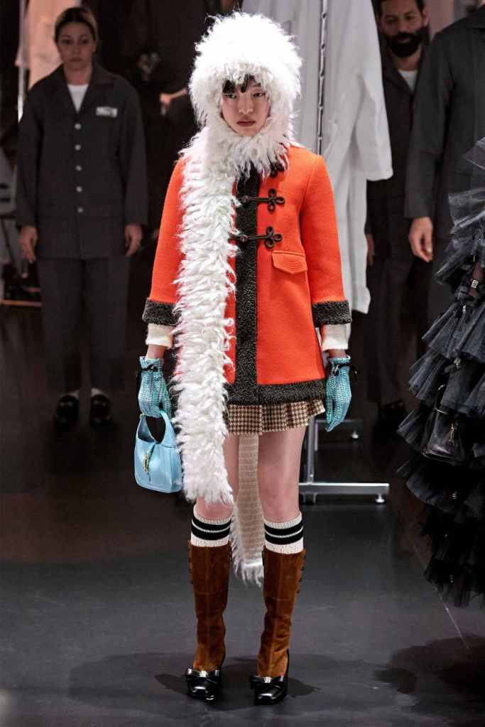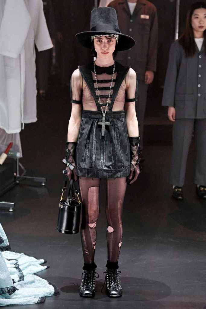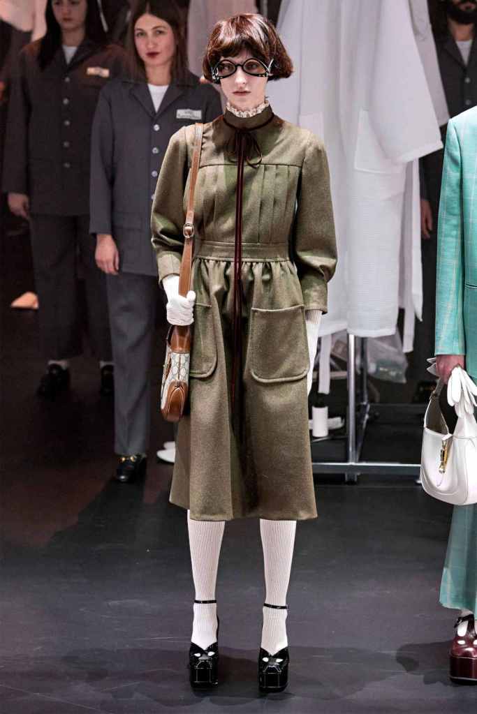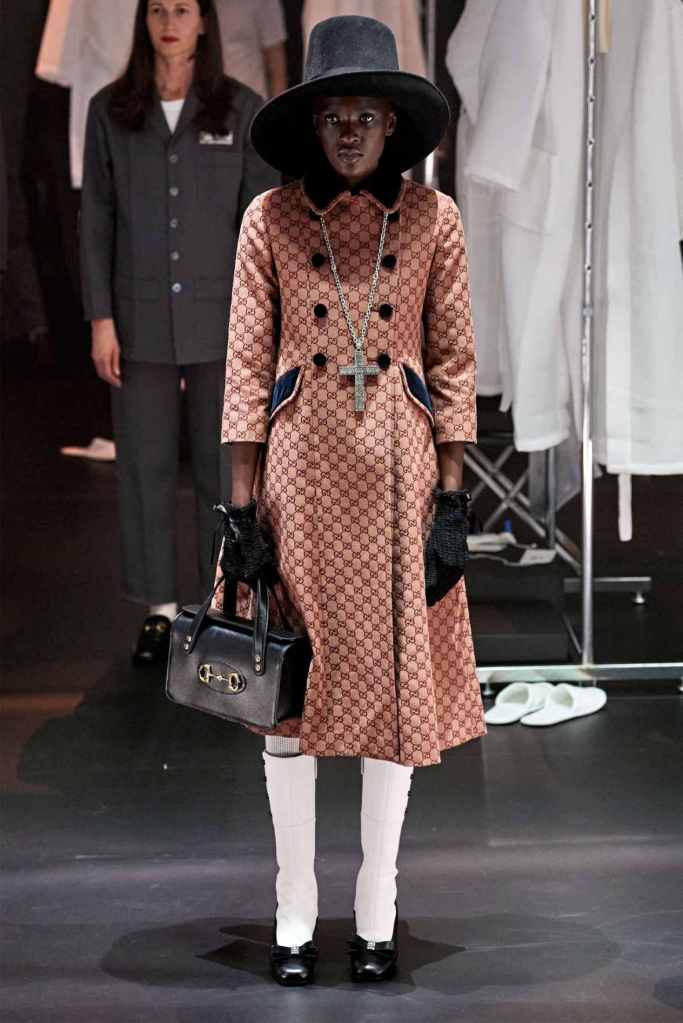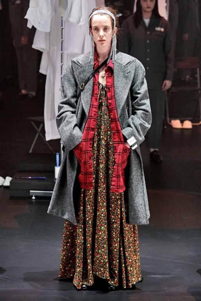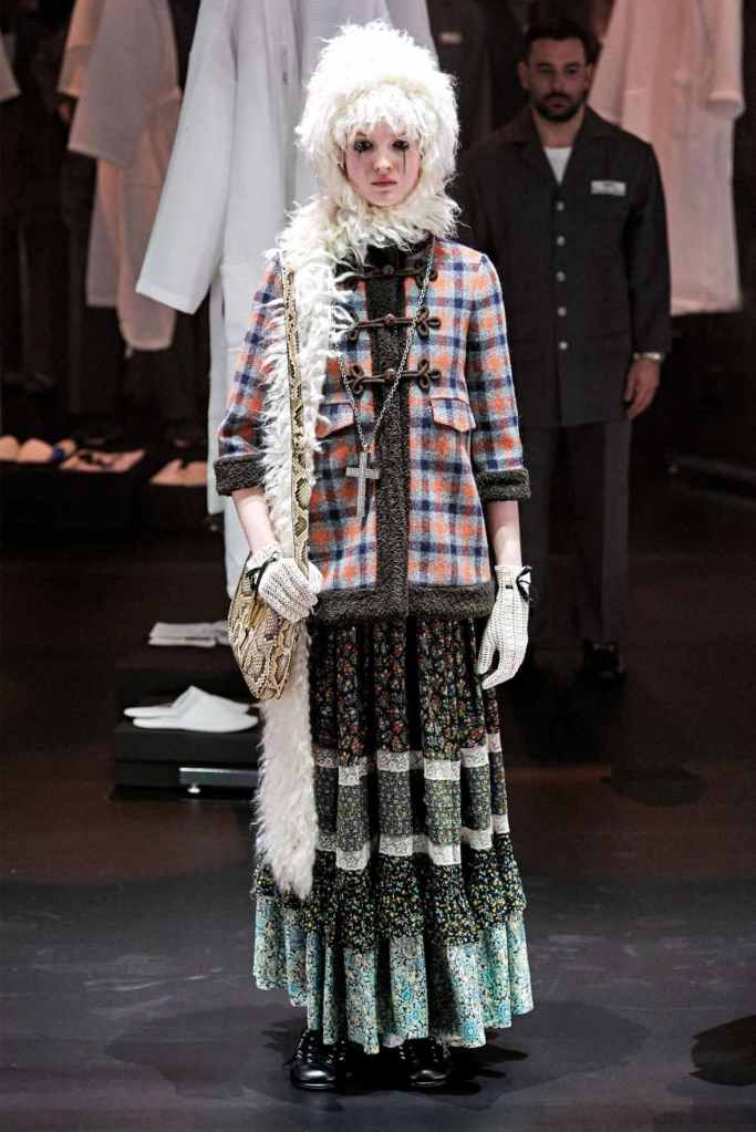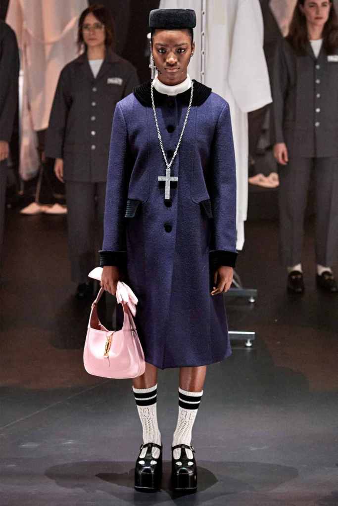 A carousel of Victorian elegance meets modern rebellion, This collection pushes boundaries and breaks conventions. Alessandro Michele brought the hidden chaos and bustling backstage energy to the runway. With an ability to blend contrasting elements seamlessly, he constructs mesmerizing worlds that exist on the delicate border between whimsy and edgy. Clothes looked like they invited us to revel in our distinctiveness. With every ensemble, he reminded us that style is not confined to the boundaries of conformity, but rather a powerful means of self-expression. Some standout pieces included floral suits, leather harnesses, baby doll dresses, tiered tulle skirts, schoolgirl separates, Pilgrim-inspired accessories and Georgian gowns.