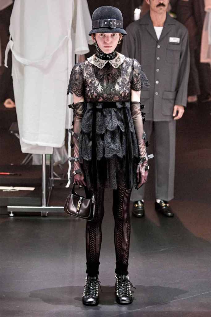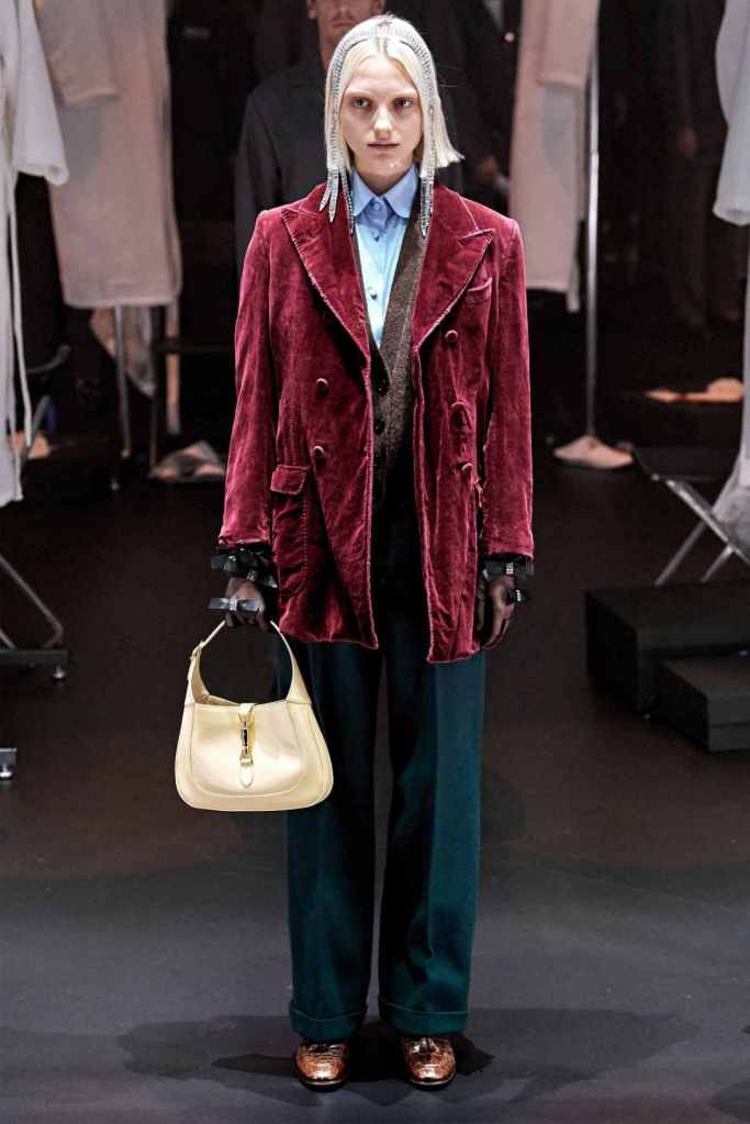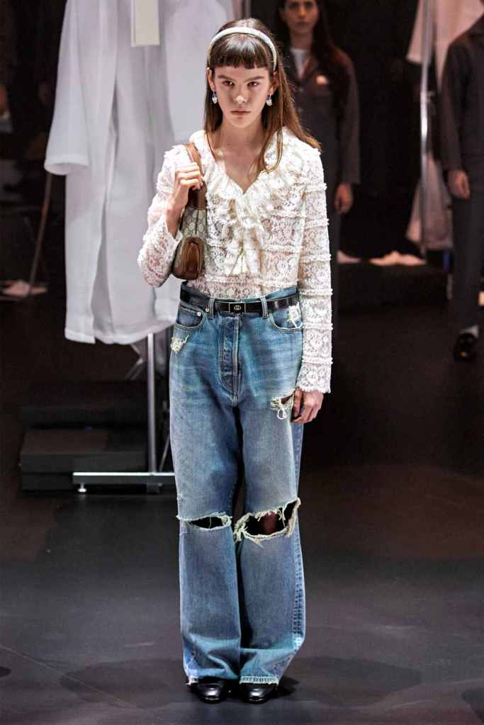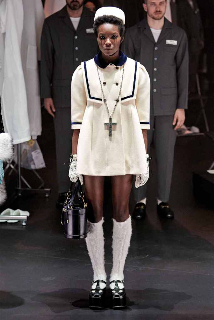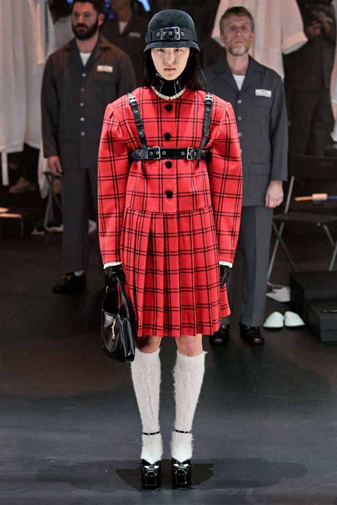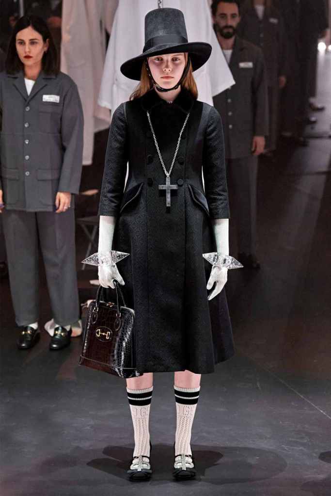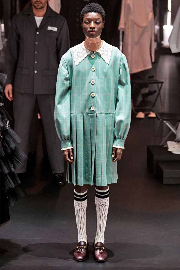 A carousel of Victorian elegance meets modern rebellion, This collection pushes boundaries and breaks conventions. Alessandro Michele brought the hidden chaos and bustling backstage energy to the runway. With an ability to blend contrasting elements seamlessly, he constructs mesmerizing worlds that exist on the delicate border between whimsy and edgy. Clothes looked like they invited us to revel in our distinctiveness. With every ensemble, he reminded us that style is not confined to the boundaries of conformity, but rather a powerful means of self-expression. Some standout pieces included floral suits, leather harnesses, baby doll dresses, tiered tulle skirts, schoolgirl separates, Pilgrim-inspired accessories and Georgian gowns.