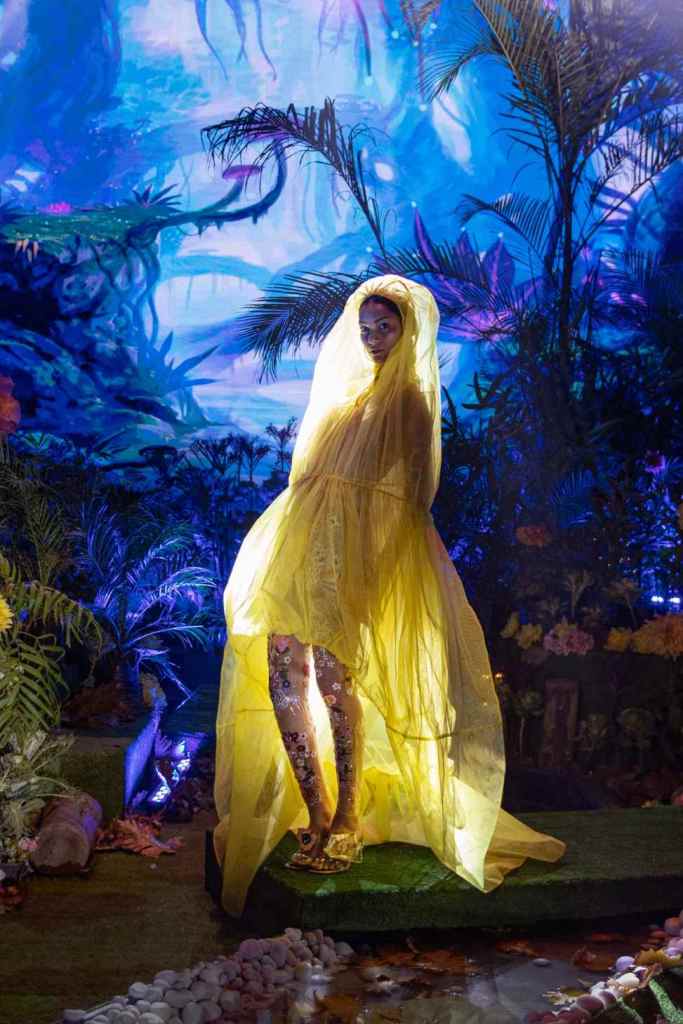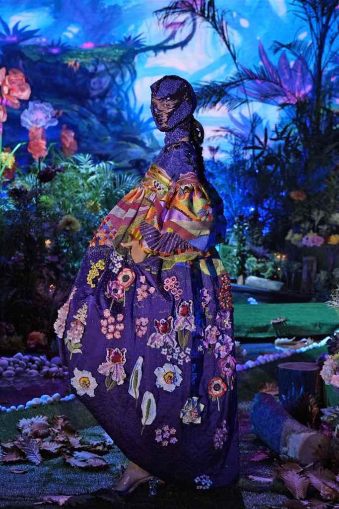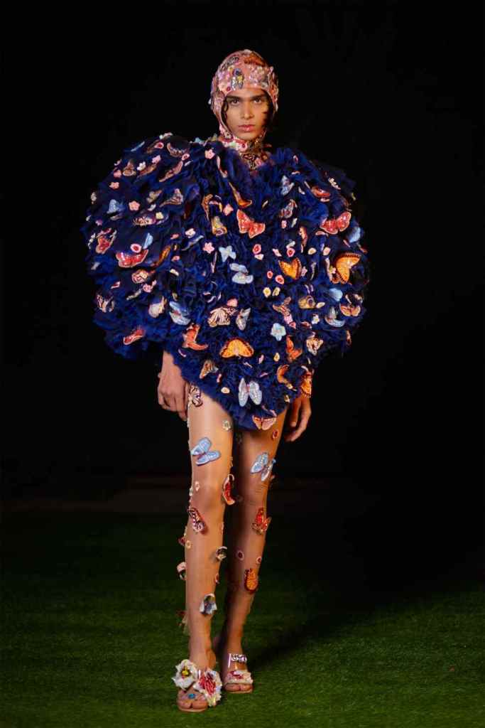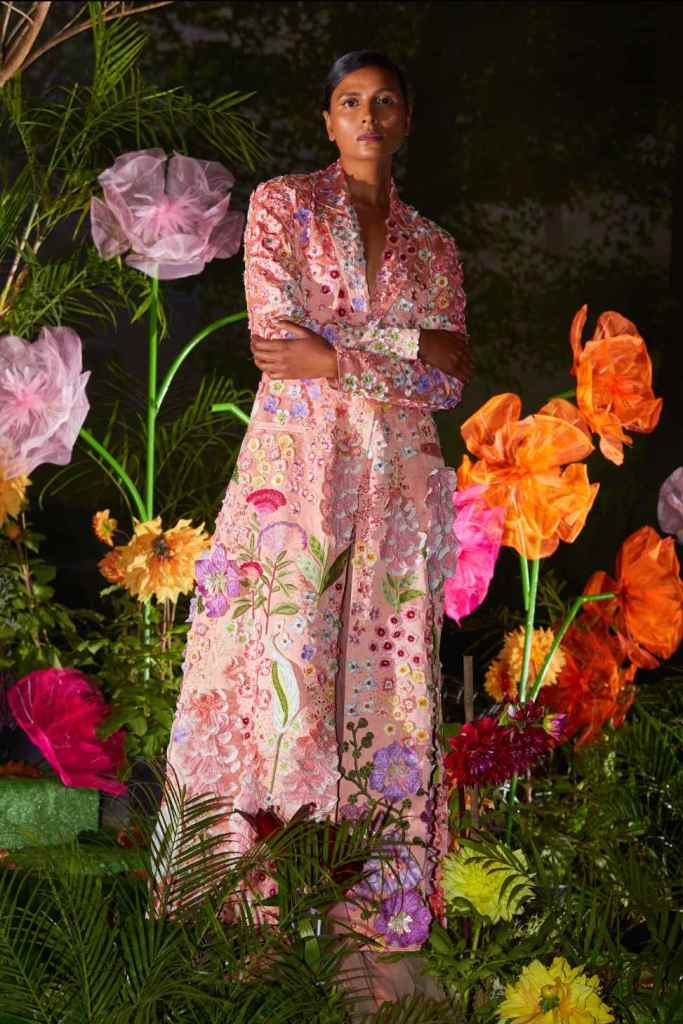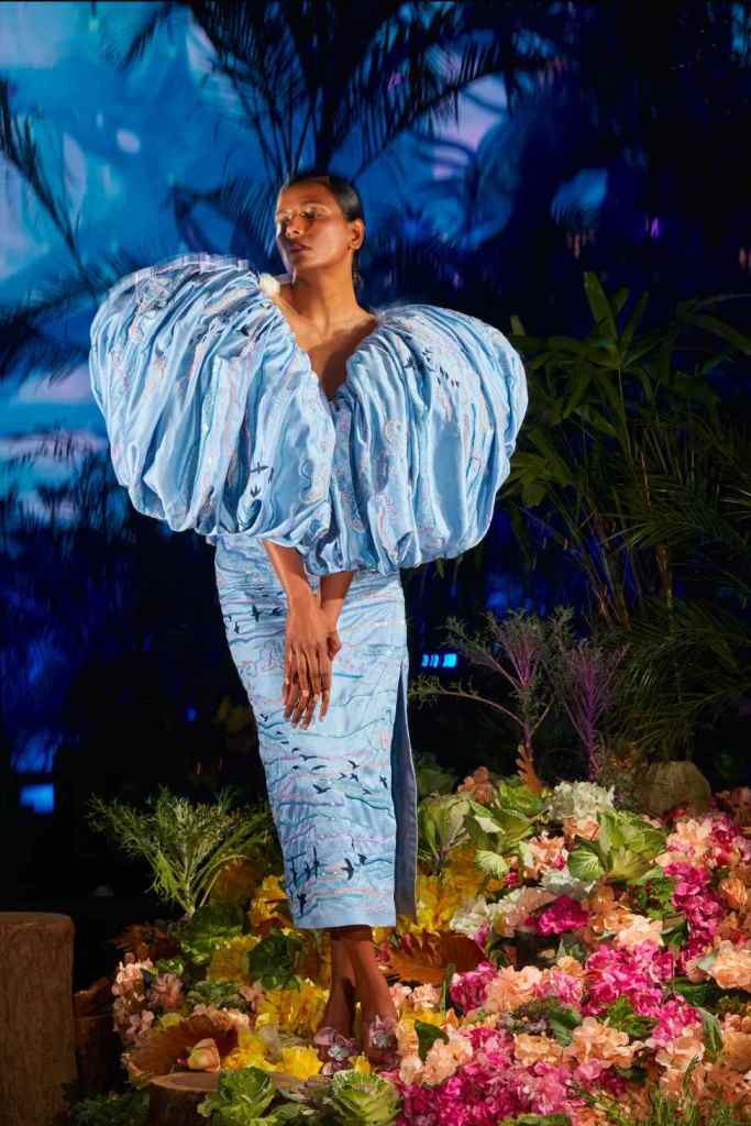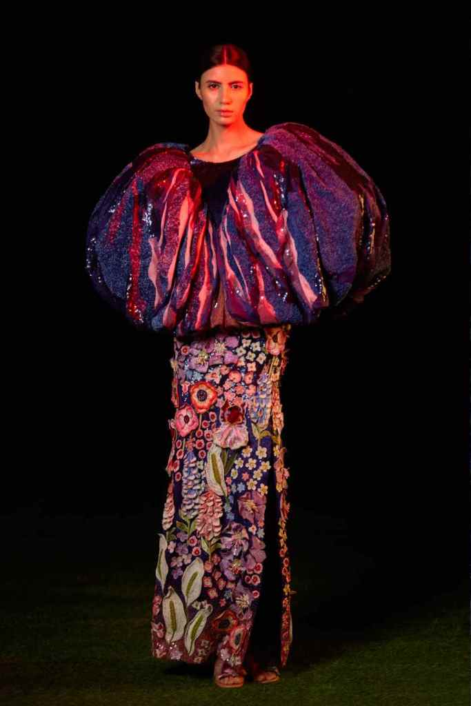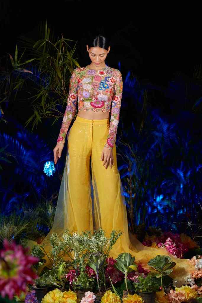 Rahul Mishra transports us to a fantasy land with this ‘Enchanted’ collection. Absolutely dreamy clothes are further amplified by striking photos. Filled with floral and butterfly motifs this collection is a demonstration of the exquisite craftsmanship that the brand is built upon. Flouncy gowns, sheer anarkalis and trimmed tulle skirts were some strong points. Floral dresses take up a new meaning here; colorful delicate petals elevate the dresses. The juxtaposition of fine embroidery and kaleidoscopic colors creates an enchanting tapestry, unveiling a realm of wonder. With fine embroidery and kaleidoscopic colors, this collection is truly Magical Couture.