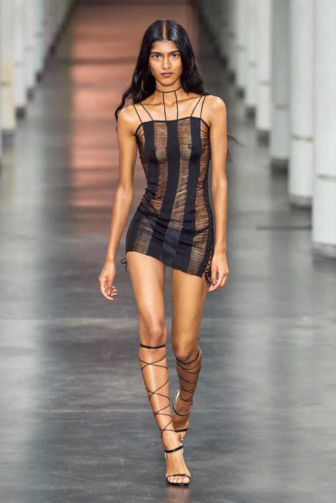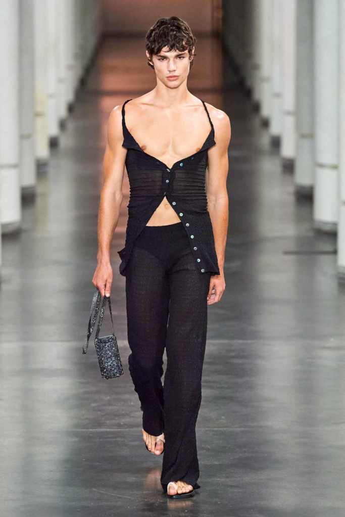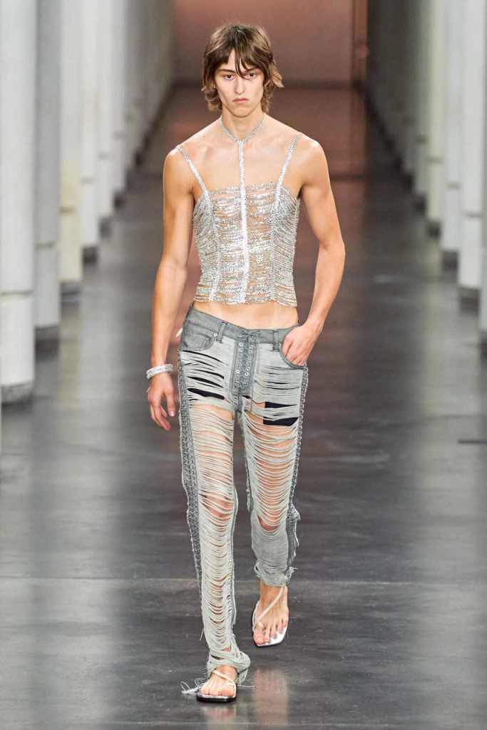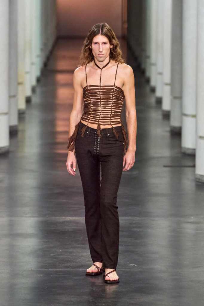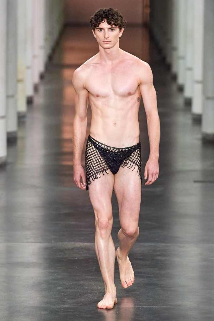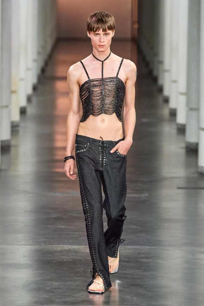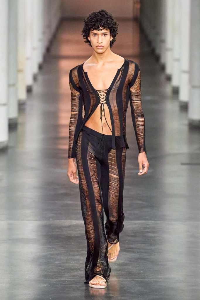 Ludovic de Saint Sernin sets the runway on fire, literally. From braided leather dresses to shimmery sheer dresses, he leaves no doubt that the point is to showcase the body. The French pioneer of sex-positive fashion unveiled a collection pulsating with sensuality. In collaboration with Pornhub, this provocative show pushed boundaries even more. Saint Sernin blurs the lines of intimate wear and outerwear, showcasing elasticated-waist pants, asymmetrical hems, micro bralettes, and ruched minidresses that cling and reveal. Fiery Hot Clothes – Love to see it!