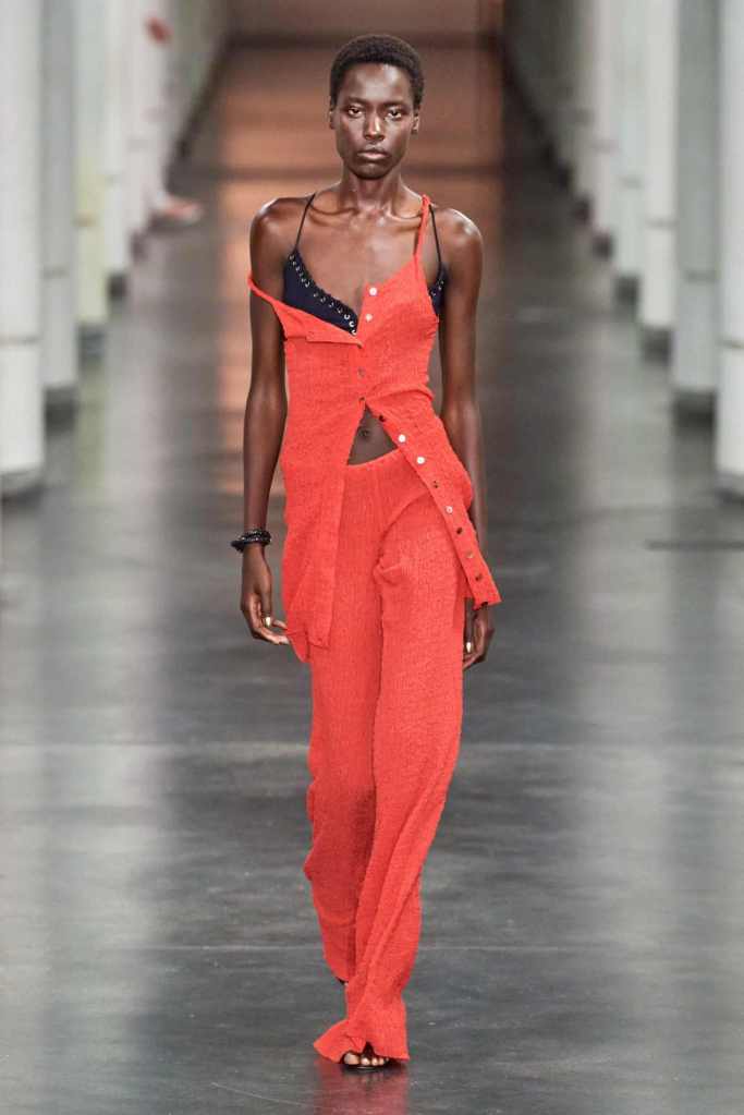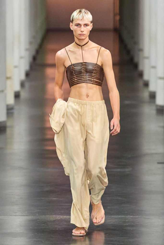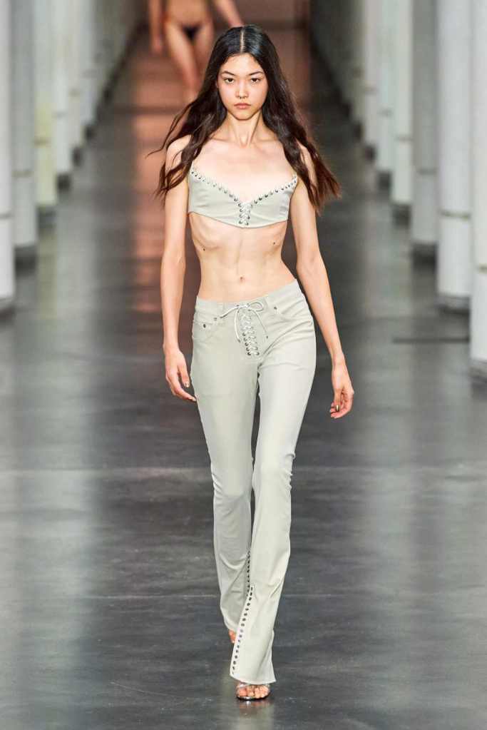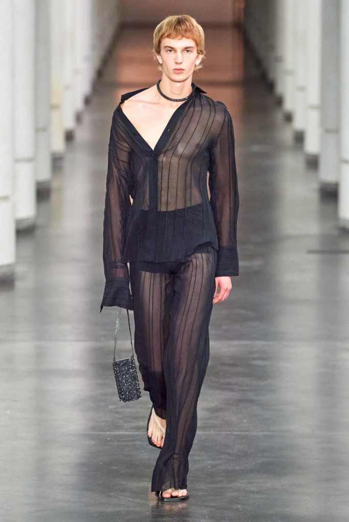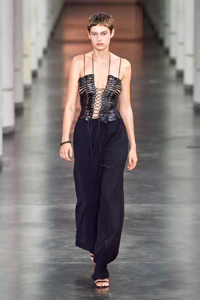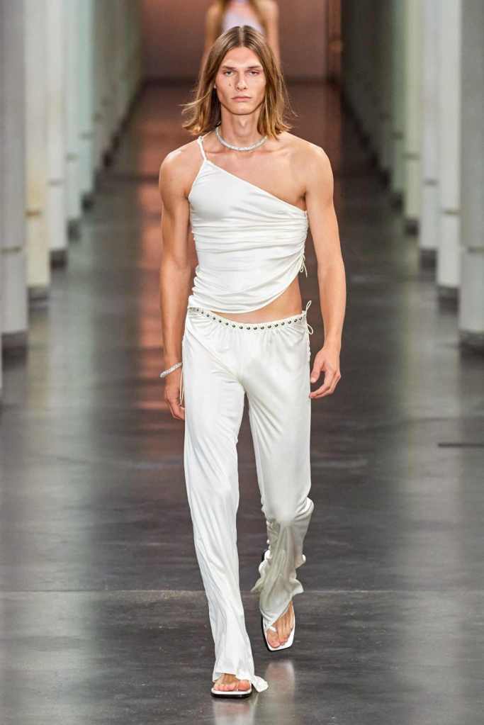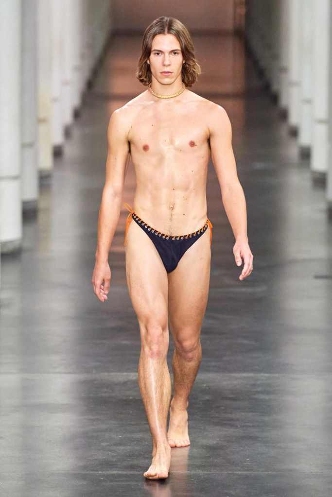 Ludovic de Saint Sernin sets the runway on fire, literally. From braided leather dresses to shimmery sheer dresses, he leaves no doubt that the point is to showcase the body. The French pioneer of sex-positive fashion unveiled a collection pulsating with sensuality. In collaboration with Pornhub, this provocative show pushed boundaries even more. Saint Sernin blurs the lines of intimate wear and outerwear, showcasing elasticated-waist pants, asymmetrical hems, micro bralettes, and ruched minidresses that cling and reveal. Fiery Hot Clothes – Love to see it!