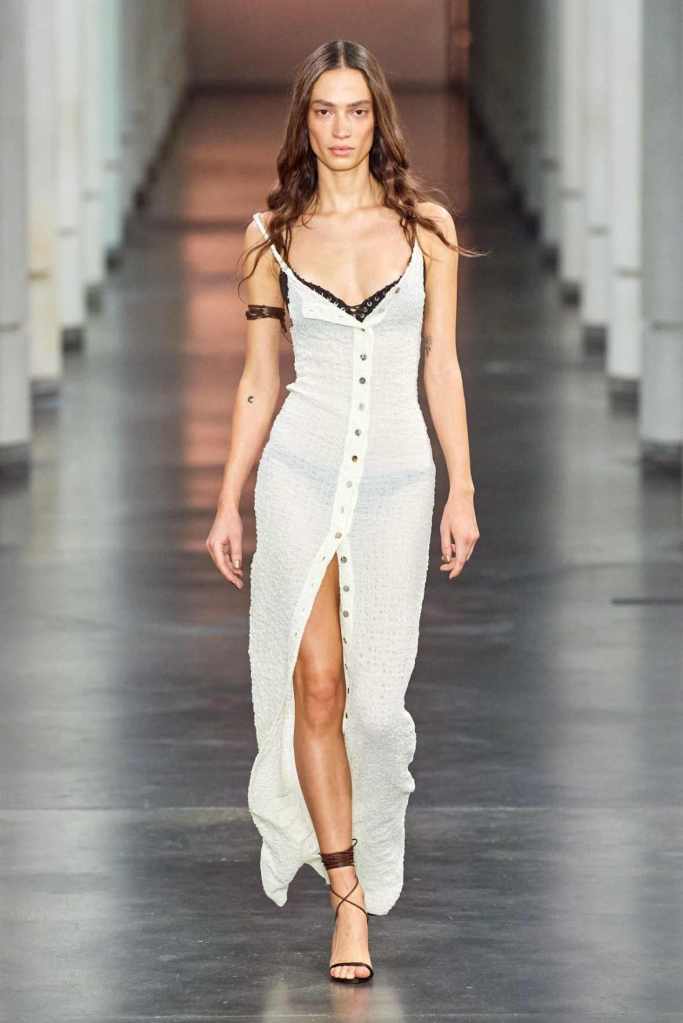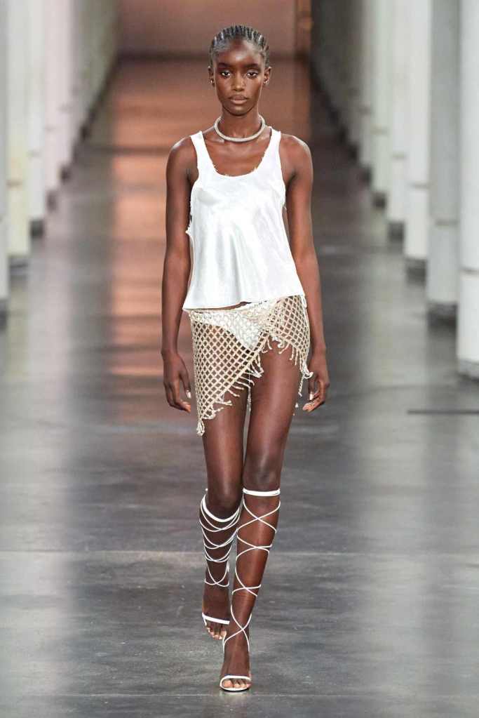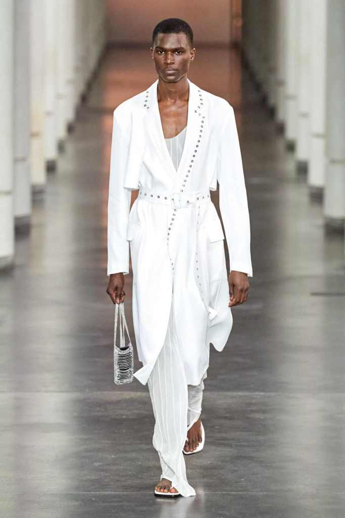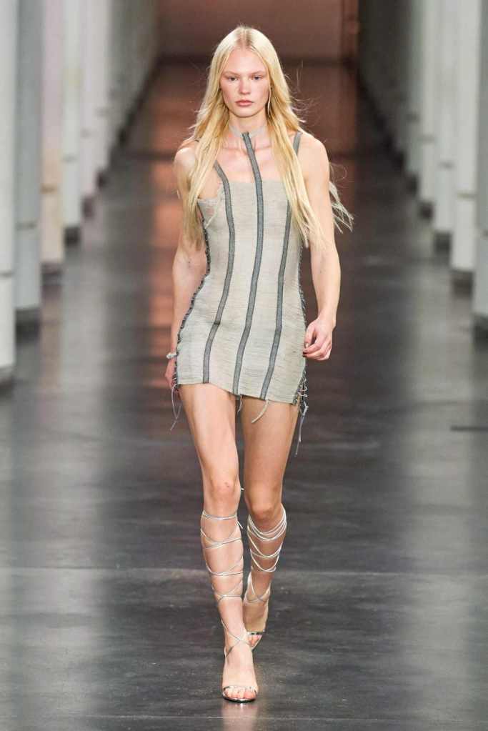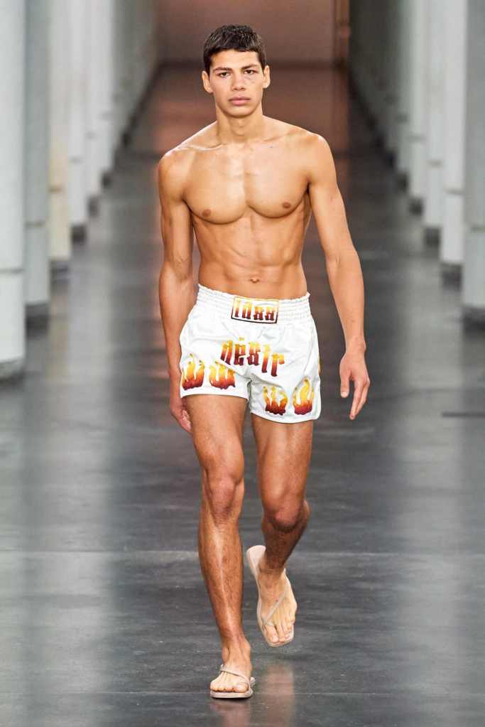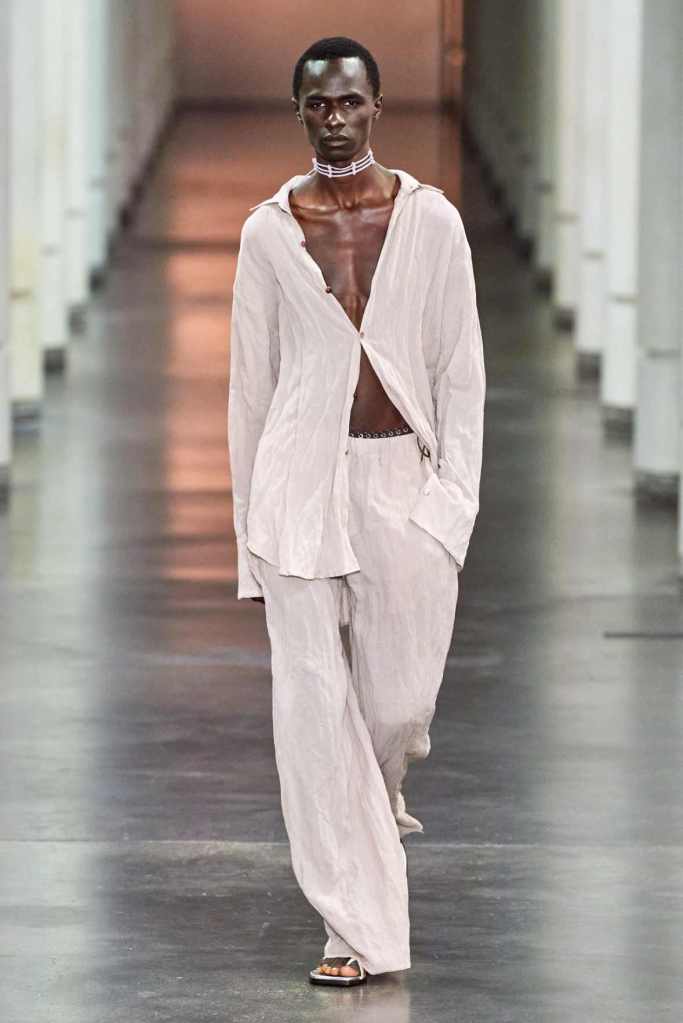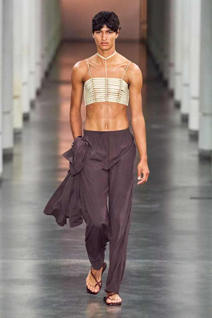 Ludovic de Saint Sernin sets the runway on fire, literally. From braided leather dresses to shimmery sheer dresses, he leaves no doubt that the point is to showcase the body. The French pioneer of sex-positive fashion unveiled a collection pulsating with sensuality. In collaboration with Pornhub, this provocative show pushed boundaries even more. Saint Sernin blurs the lines of intimate wear and outerwear, showcasing elasticated-waist pants, asymmetrical hems, micro bralettes, and ruched minidresses that cling and reveal. Fiery Hot Clothes – Love to see it!