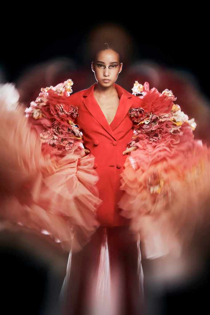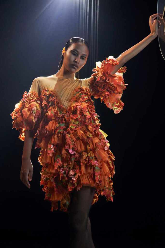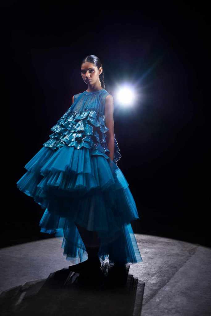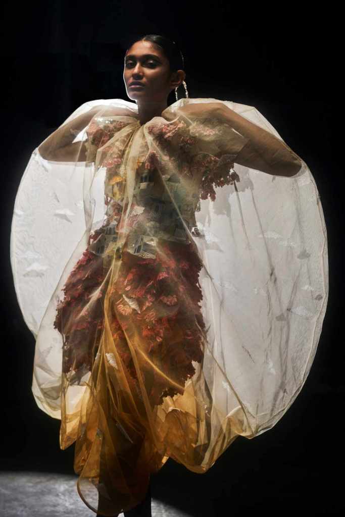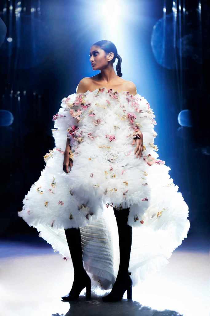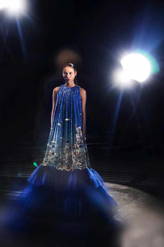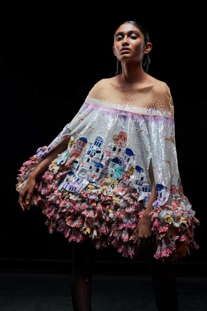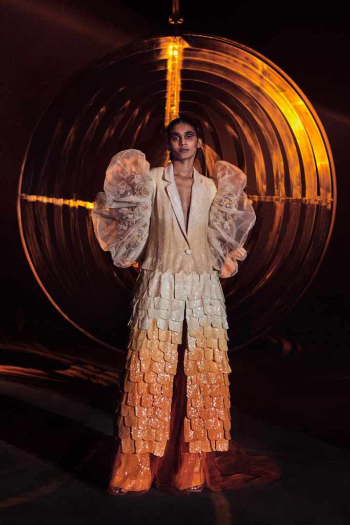 The collection drew its inspiration from the breathtaking Santorini, a stunning island known for its beauty. It incorporated elements from nature, such as earth, water, fire, wind, and space, blending them with the motifs found on the island. The craftsmanship of the collection was truly exceptional, particularly highlighted by the intricate 3D embroidery that adorned the pieces. Mishra named this collection “Shape of Air,” showcasing his iconic and timeless styles alongside some subtle experimentation that demonstrated growth and evolution in his work.