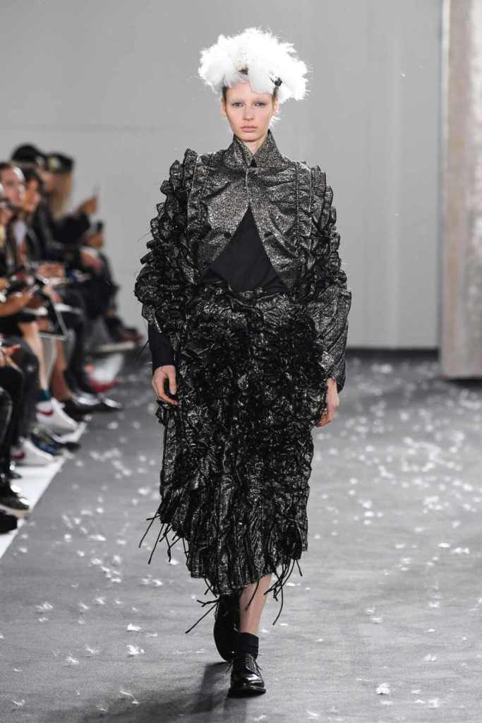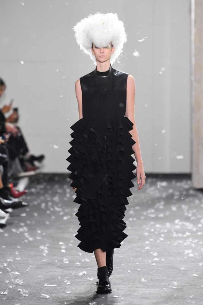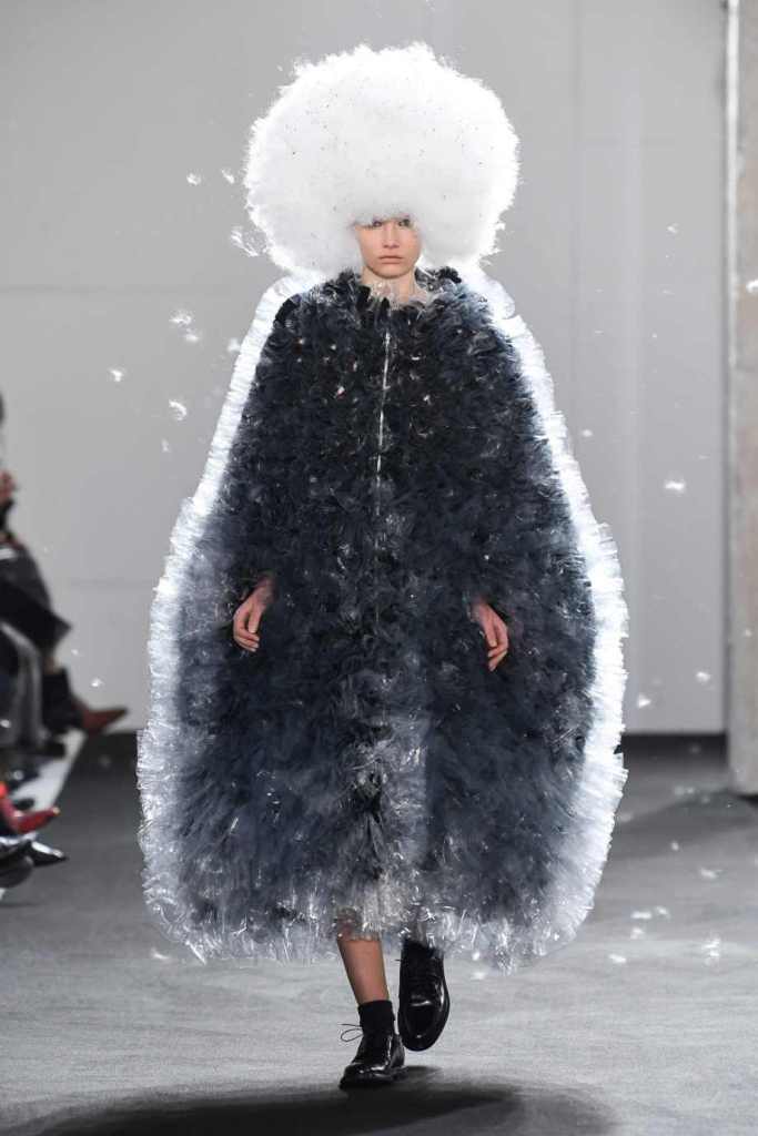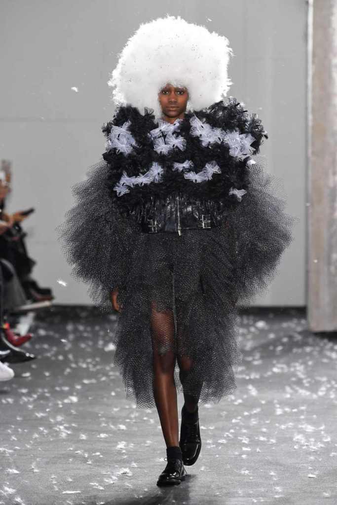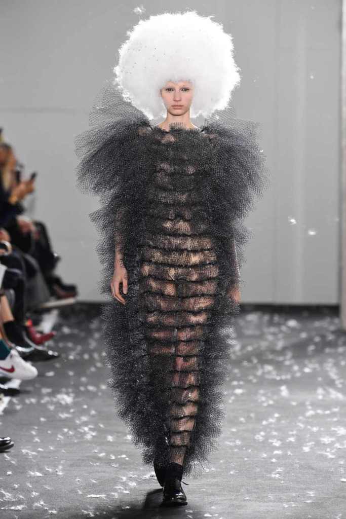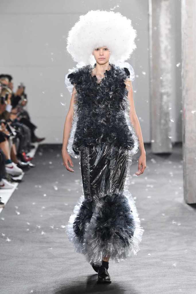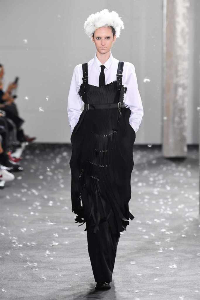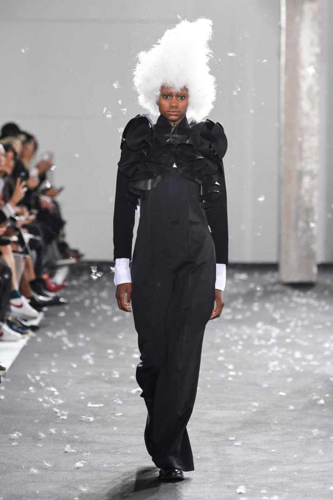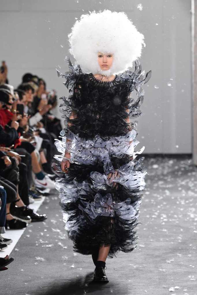 Inspired by Henri Lefebvre’s concepts of détournement and the production of space, Ninomiya’s designs redefine the boundaries of style. The show unfolded with foamy headpieces resembling tufted seedpods, transforming models into ethereal beings. Ninomiya’s designs reflect the essence of blackness and the rebellious spirit of the perfect archetype. The final part of the show presented voluminous dresses that drew inspiration from fluffy dandelions, gently enfolding the models’ bodies in a cozy embrace.