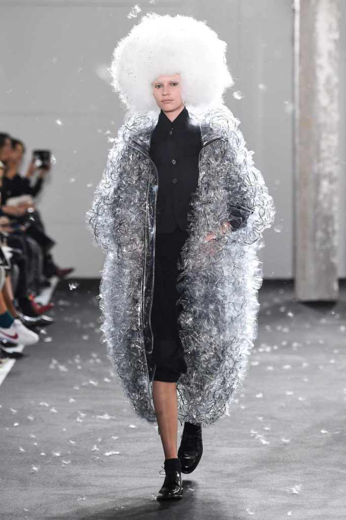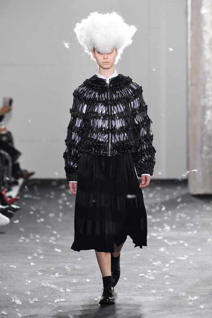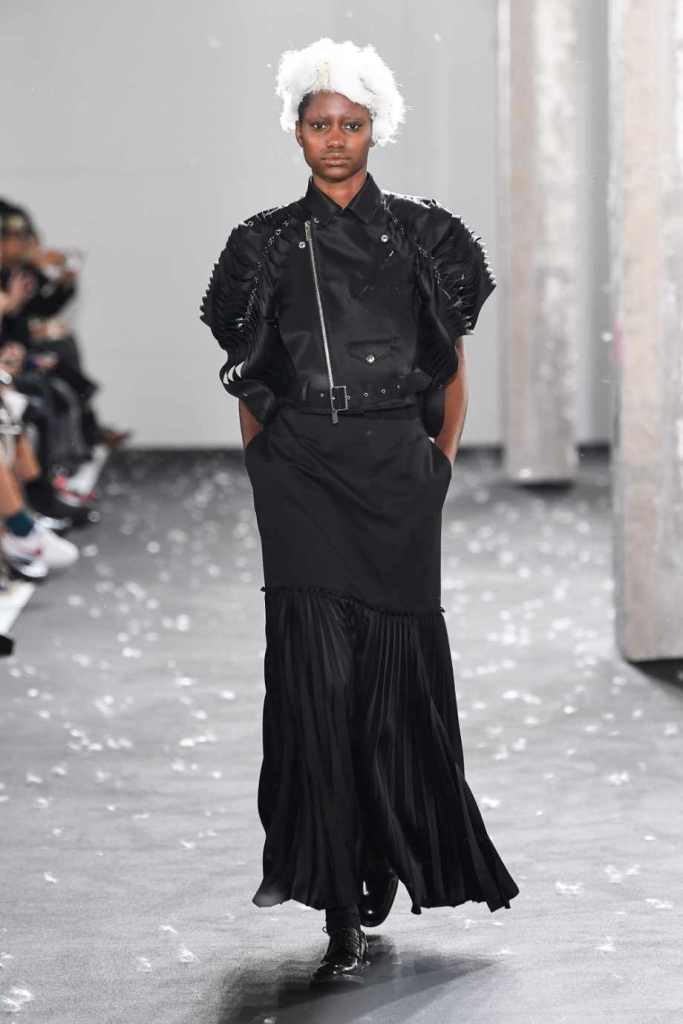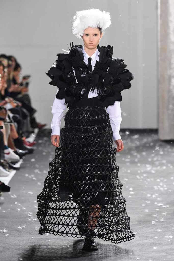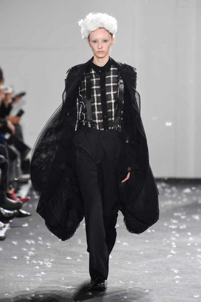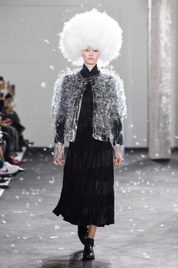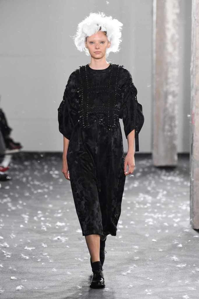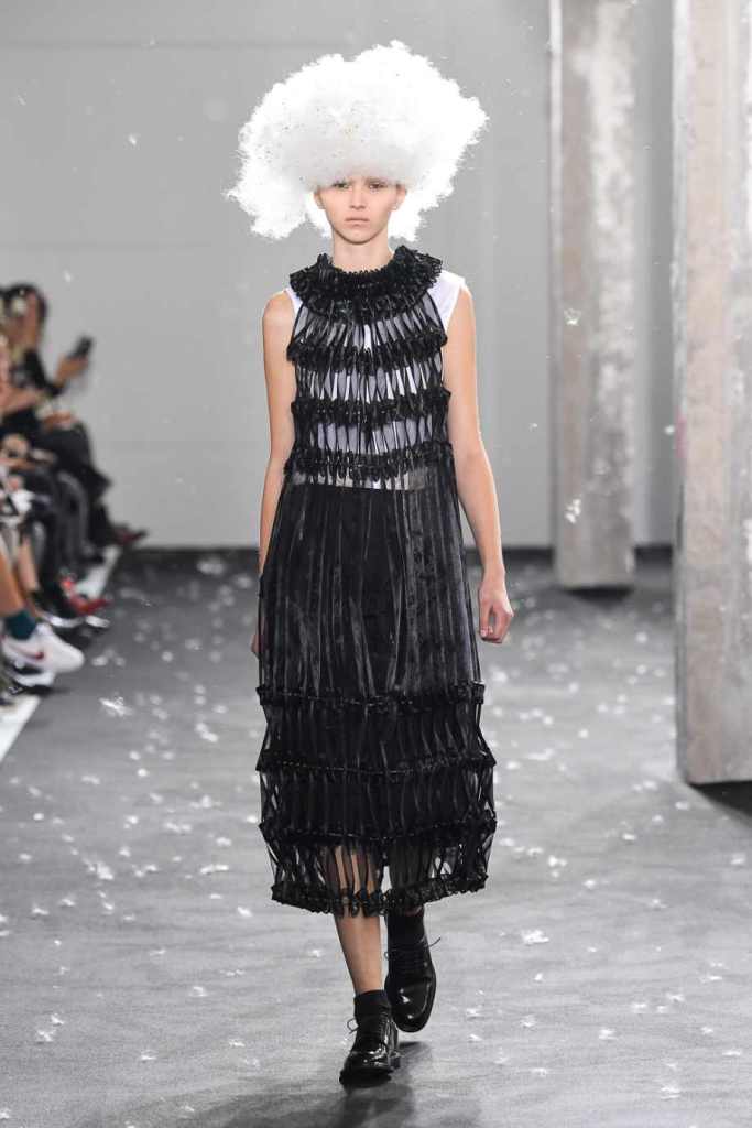 Inspired by Henri Lefebvre’s concepts of détournement and the production of space, Ninomiya’s designs redefine the boundaries of style. The show unfolded with foamy headpieces resembling tufted seedpods, transforming models into ethereal beings. Ninomiya’s designs reflect the essence of blackness and the rebellious spirit of the perfect archetype. The final part of the show presented voluminous dresses that drew inspiration from fluffy dandelions, gently enfolding the models’ bodies in a cozy embrace.