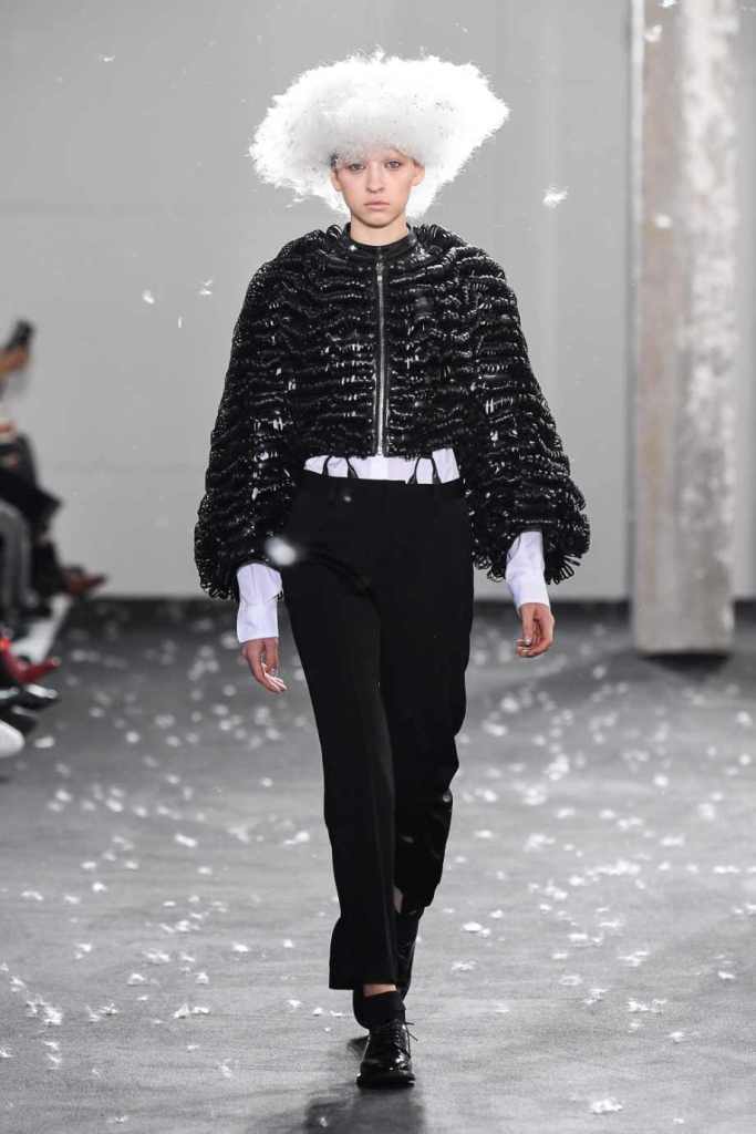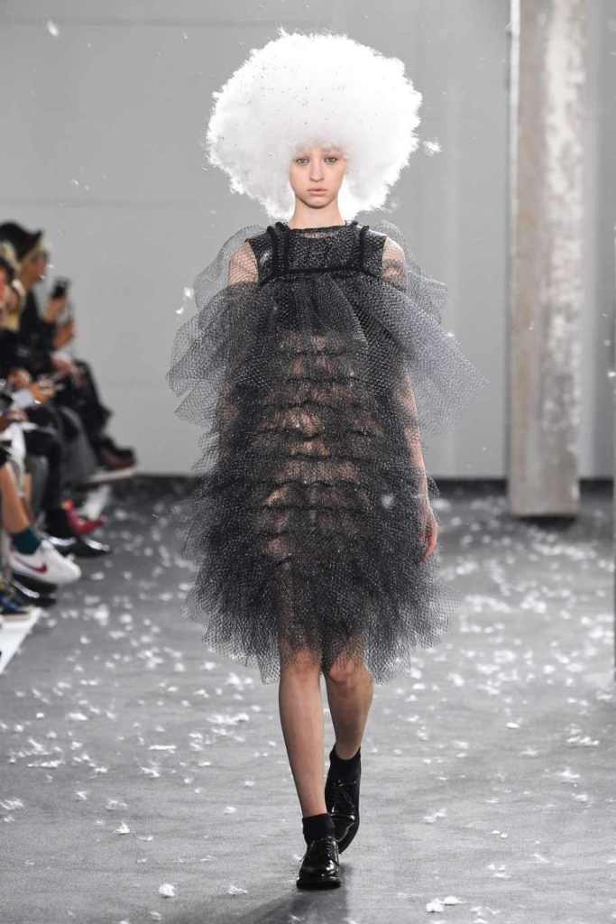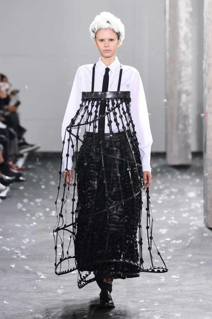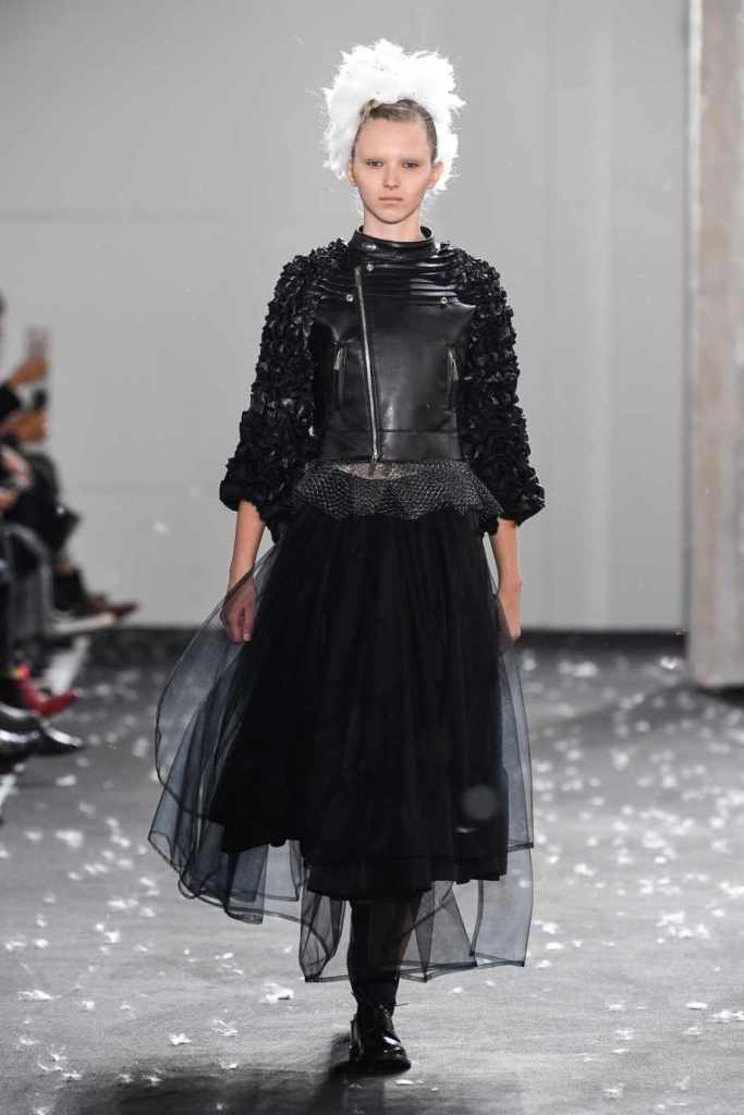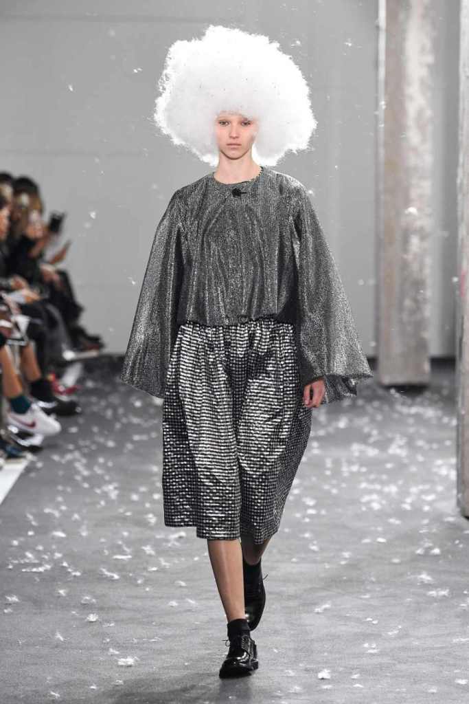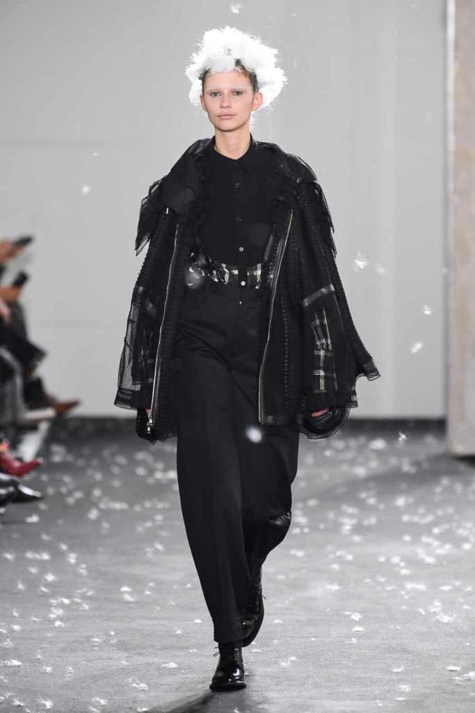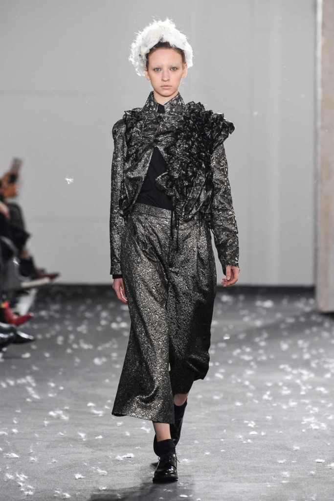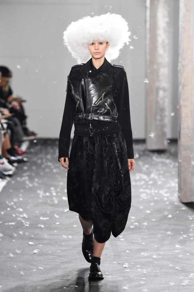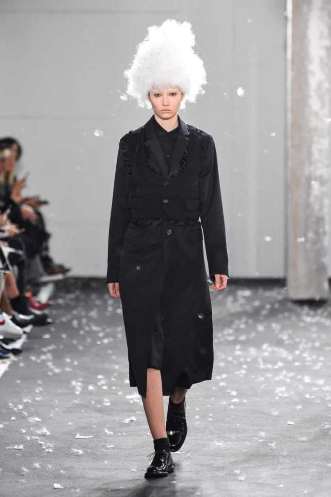 Inspired by Henri Lefebvre’s concepts of détournement and the production of space, Ninomiya’s designs redefine the boundaries of style. The show unfolded with foamy headpieces resembling tufted seedpods, transforming models into ethereal beings. Ninomiya’s designs reflect the essence of blackness and the rebellious spirit of the perfect archetype. The final part of the show presented voluminous dresses that drew inspiration from fluffy dandelions, gently enfolding the models’ bodies in a cozy embrace.
