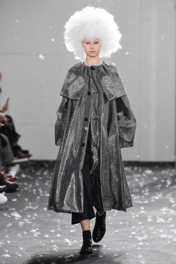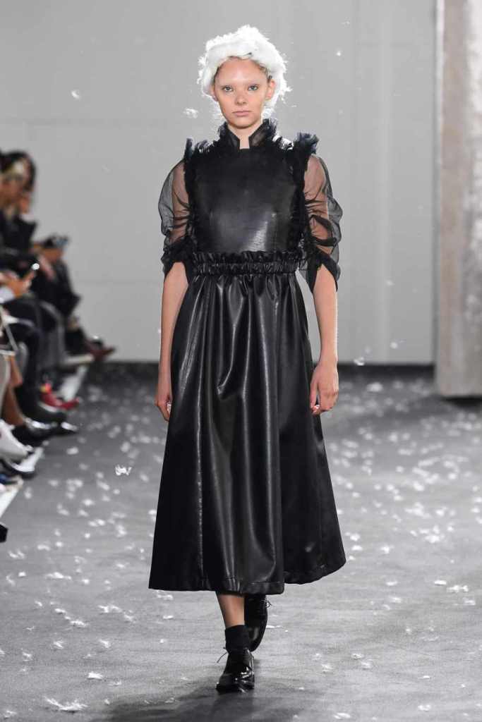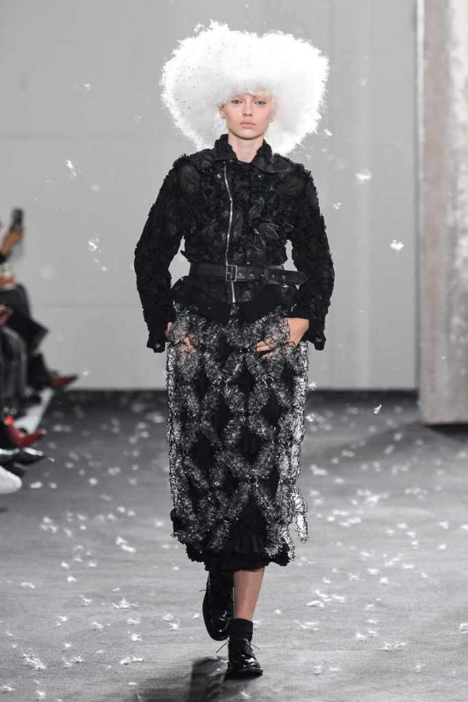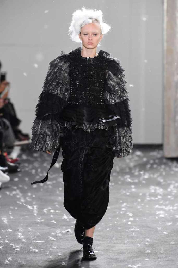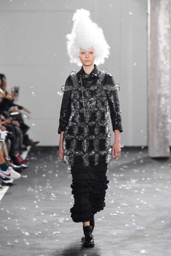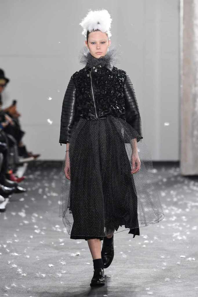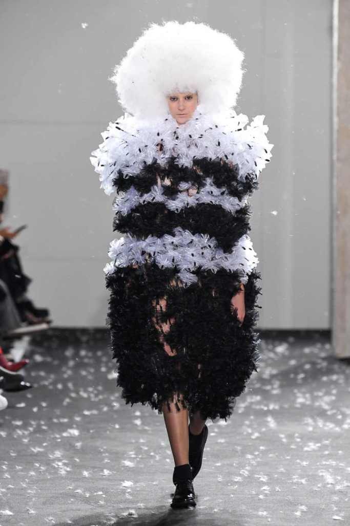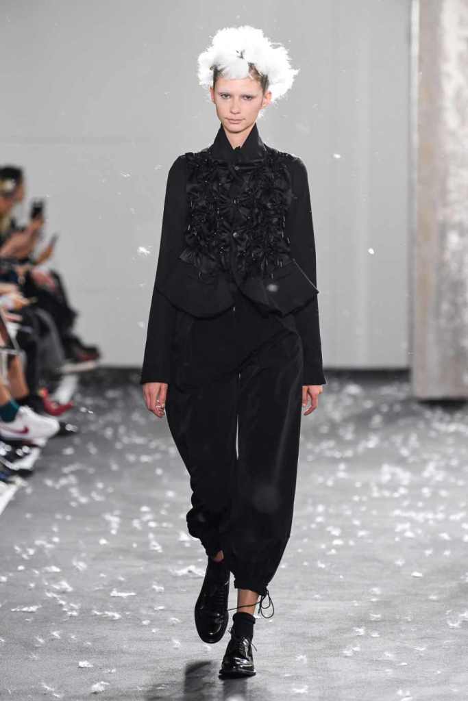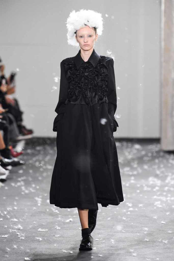 Inspired by Henri Lefebvre’s concepts of détournement and the production of space, Ninomiya’s designs redefine the boundaries of style. The show unfolded with foamy headpieces resembling tufted seedpods, transforming models into ethereal beings. Ninomiya’s designs reflect the essence of blackness and the rebellious spirit of the perfect archetype. The final part of the show presented voluminous dresses that drew inspiration from fluffy dandelions, gently enfolding the models’ bodies in a cozy embrace.