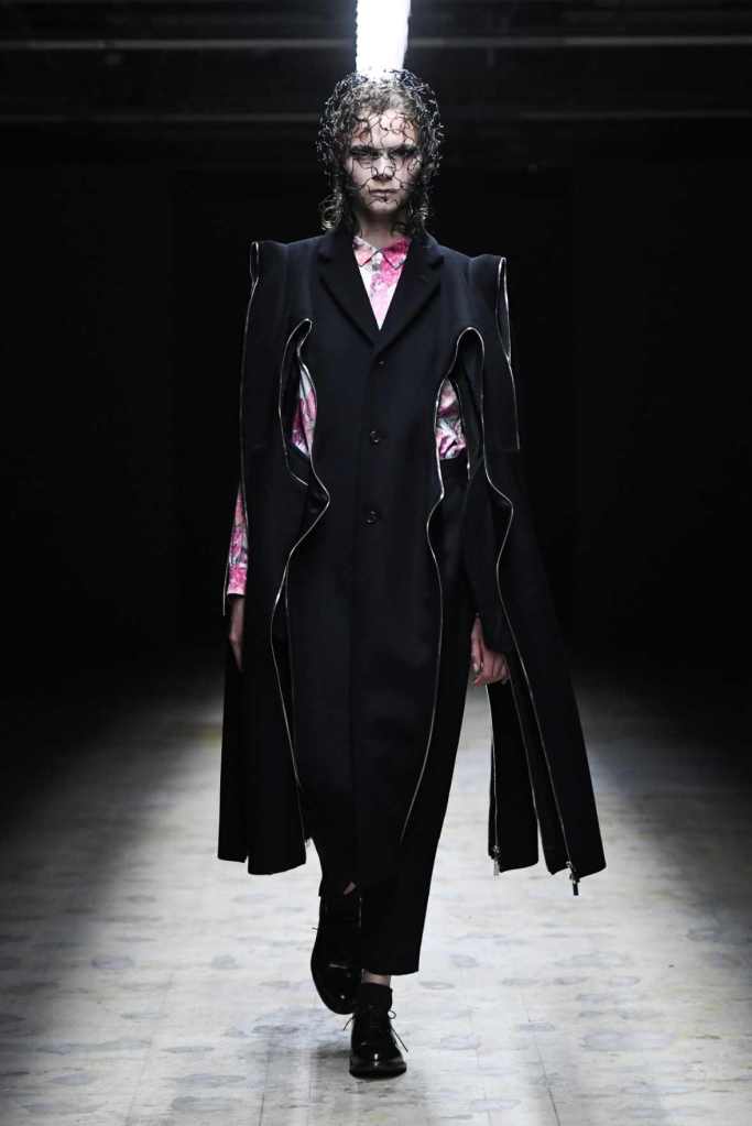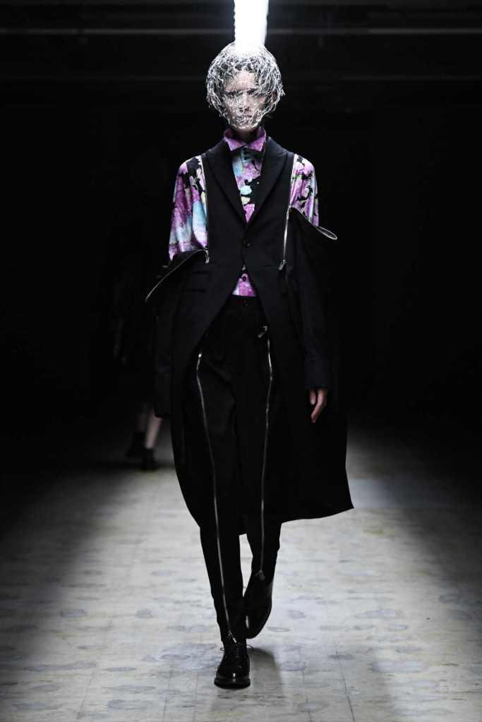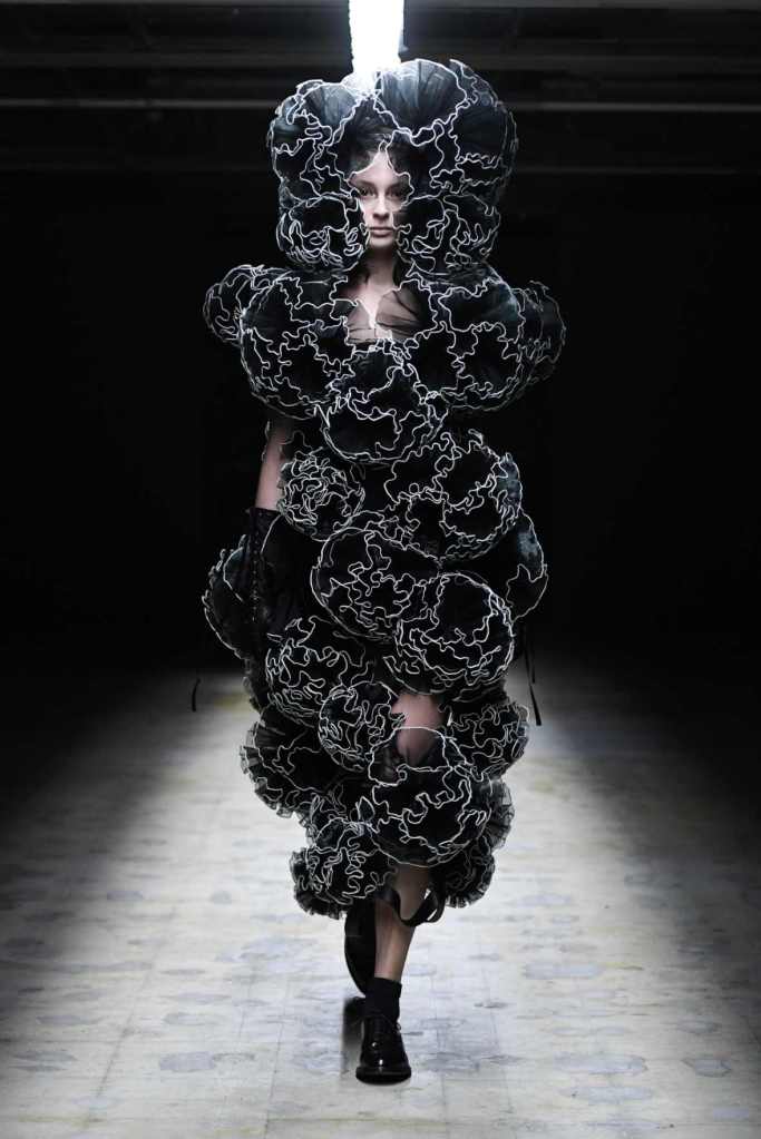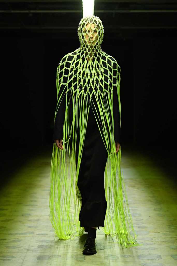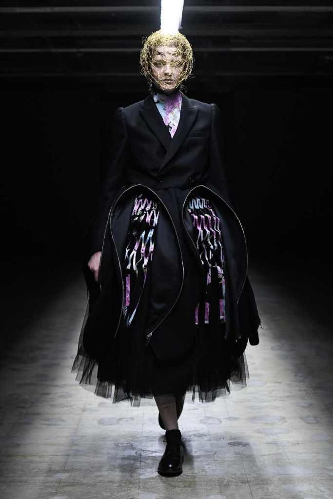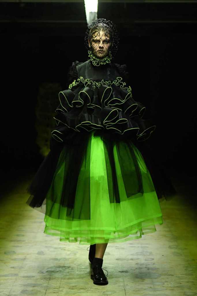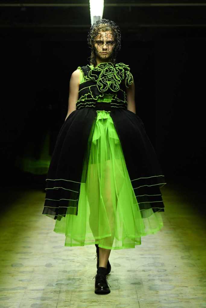 Noir Kei Ninomiya explores phosphorescent materials to elevate his iconic black palette. The designer expertly employs a diverse range of textures to enhance the dimensionality of his iconic black ensembles, beautifully offset by vibrant pops of neon. Ninomiya’s avant-garde techniques transform simple looks into extravagant creations, weaving a cohesive collection that tells a unique story with each garment. The collection features quilted panels, floral shirting, black tailored pieces, long zippers, tulle petticoats, and a standout dress adorned with spikes. Daring, avant-garde, and enigmatic!