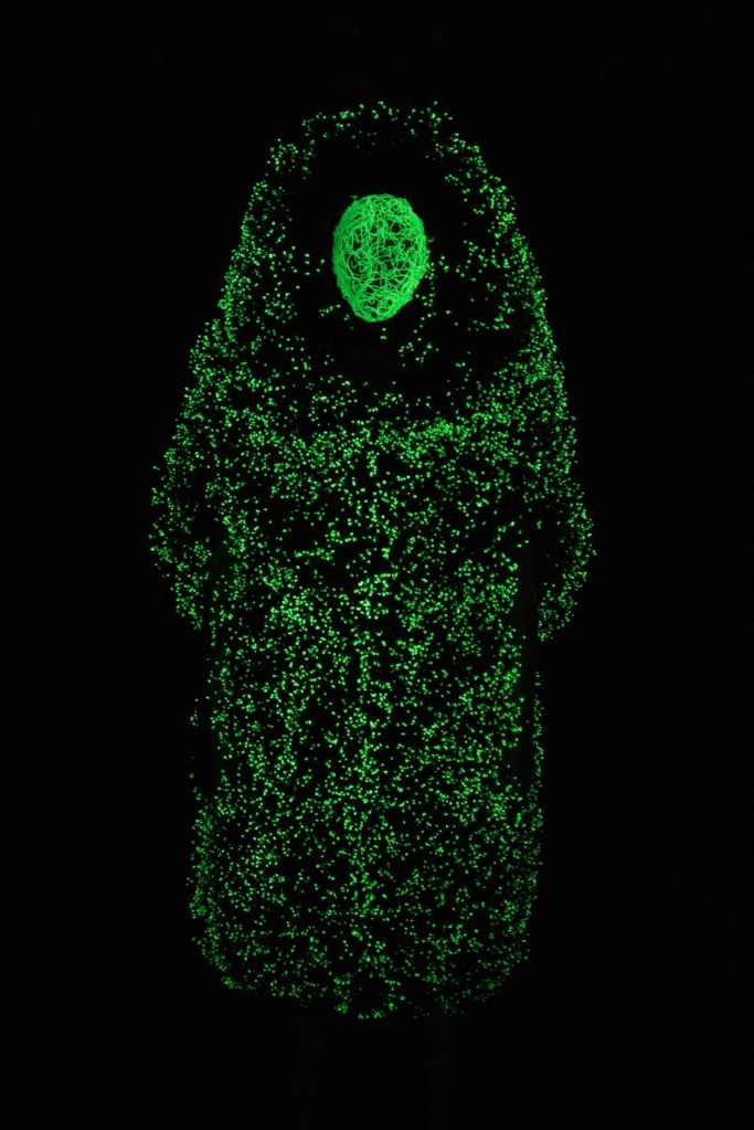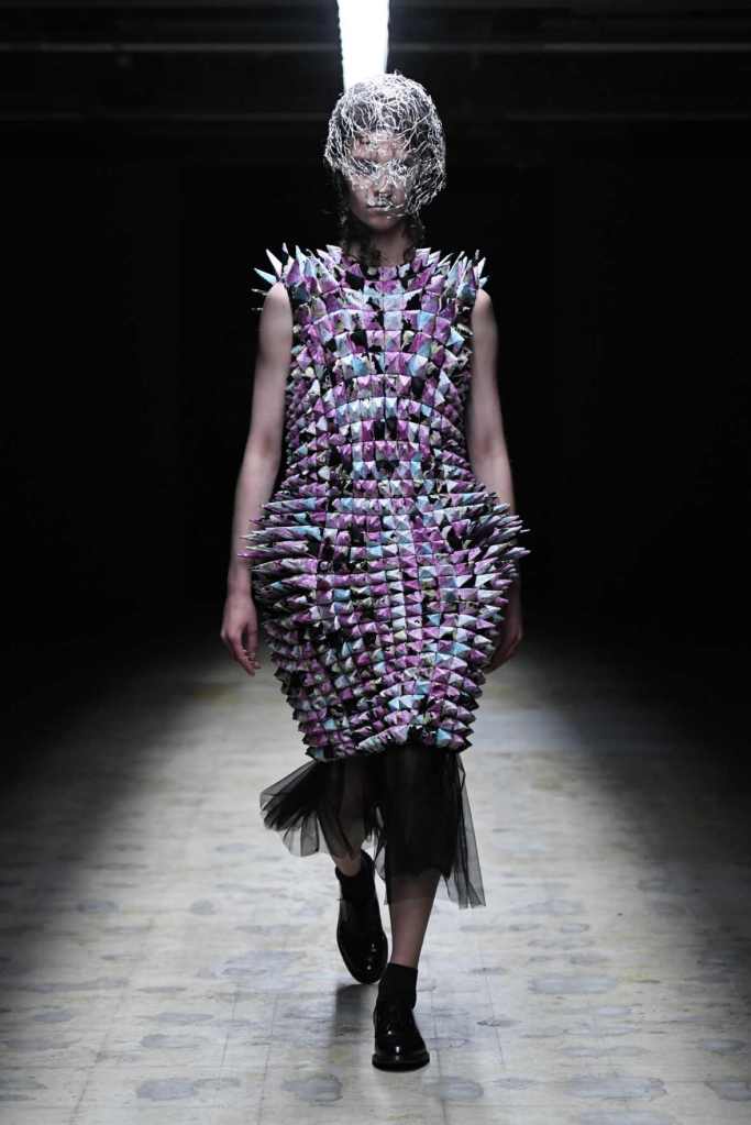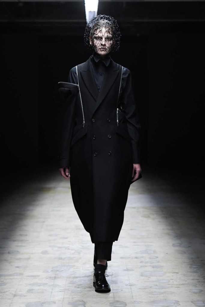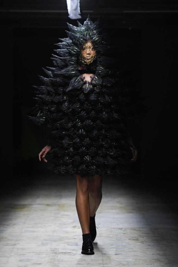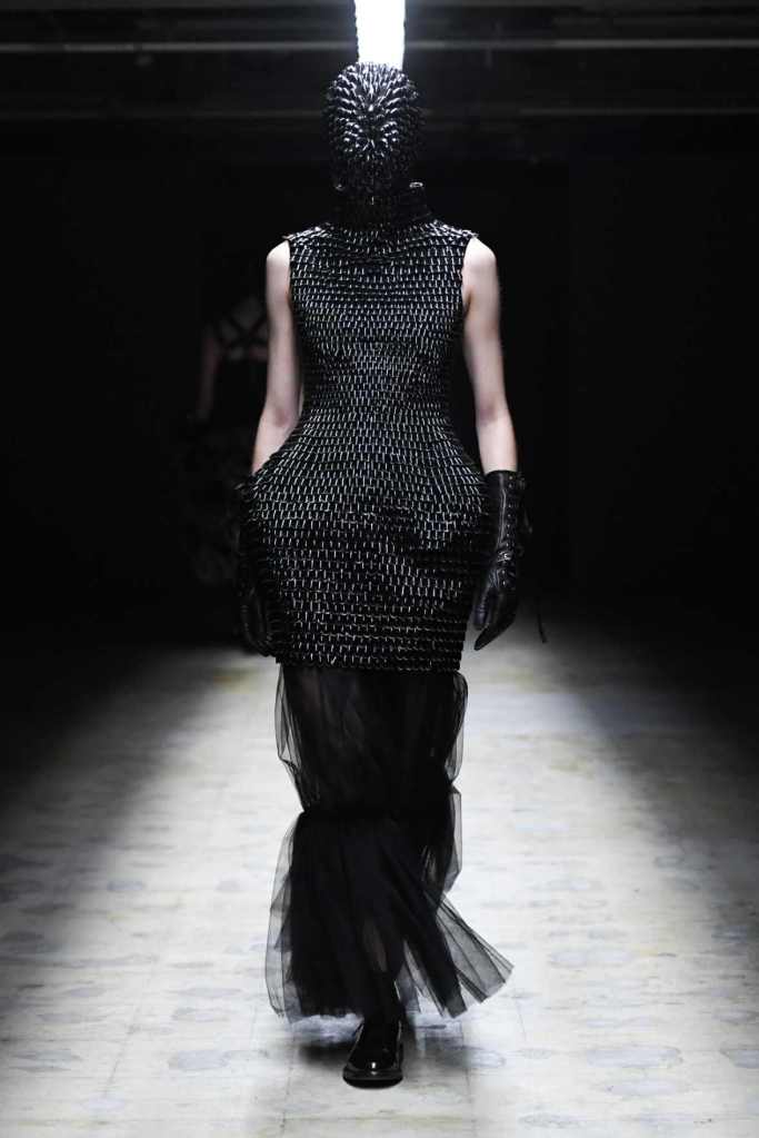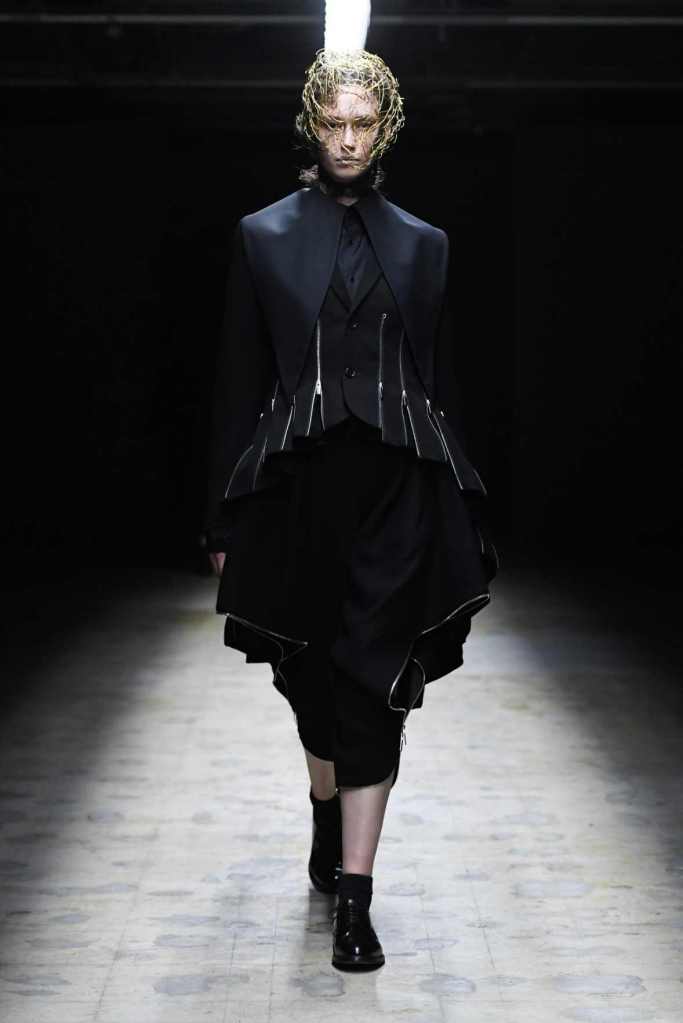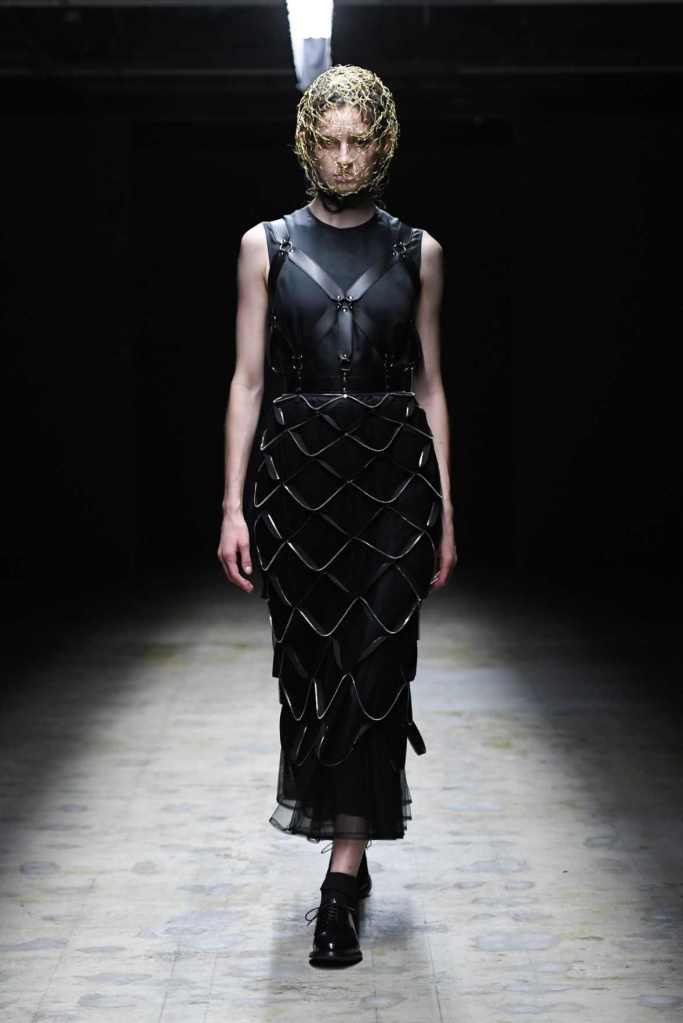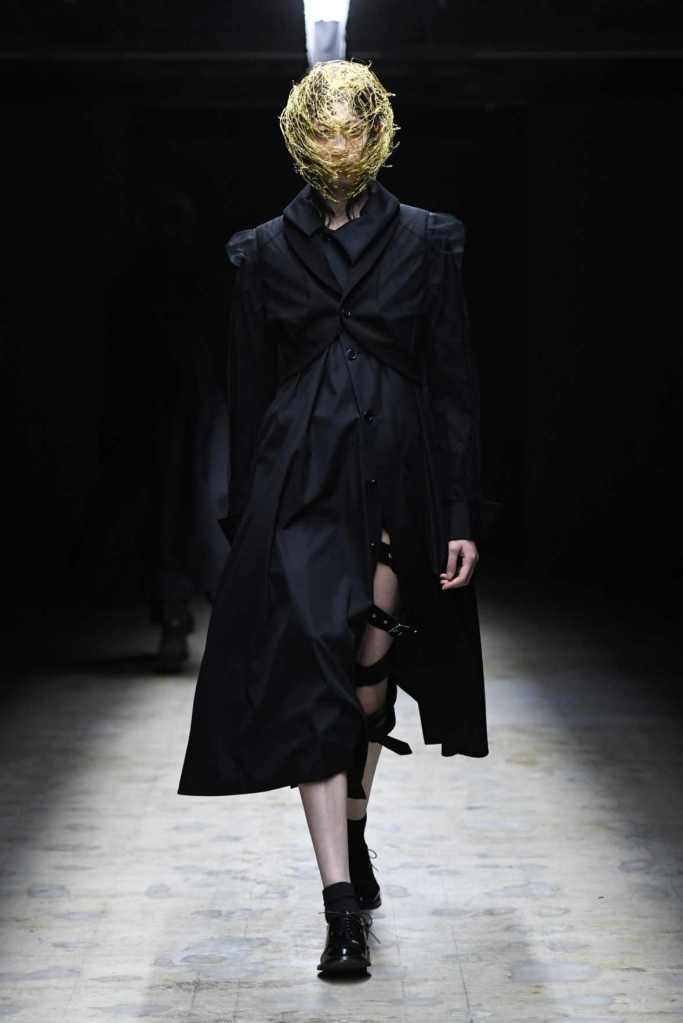 Noir Kei Ninomiya explores phosphorescent materials to elevate his iconic black palette. The designer expertly employs a diverse range of textures to enhance the dimensionality of his iconic black ensembles, beautifully offset by vibrant pops of neon. Ninomiya’s avant-garde techniques transform simple looks into extravagant creations, weaving a cohesive collection that tells a unique story with each garment. The collection features quilted panels, floral shirting, black tailored pieces, long zippers, tulle petticoats, and a standout dress adorned with spikes. Daring, avant-garde, and enigmatic!