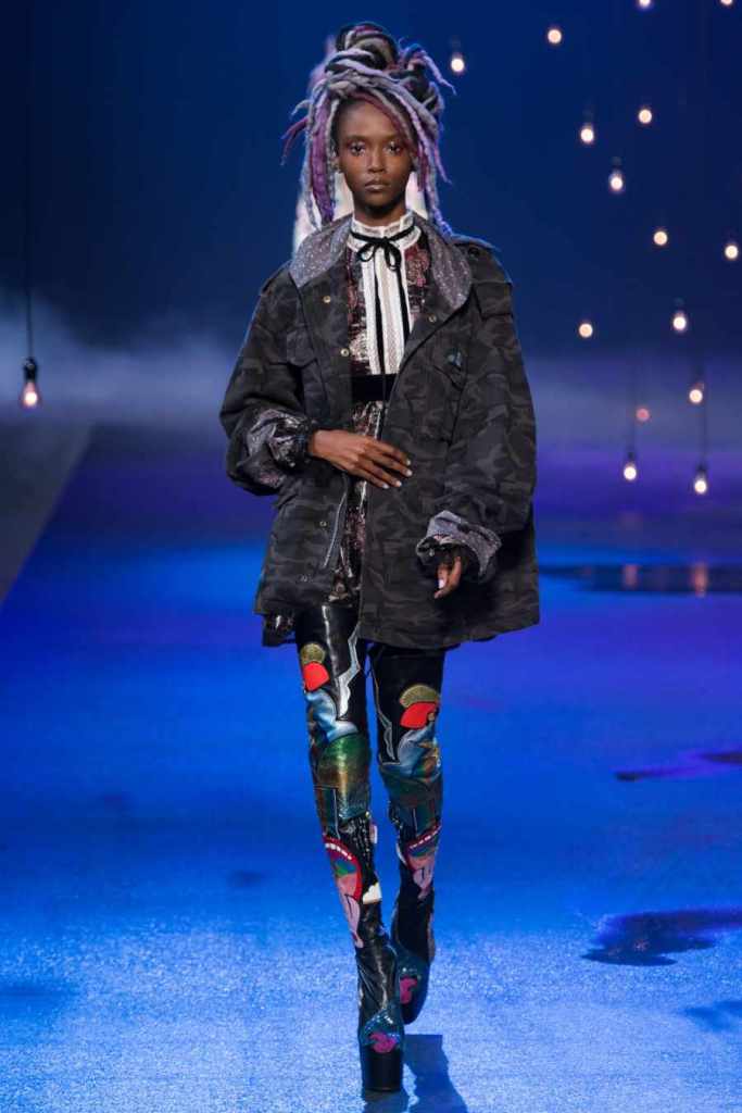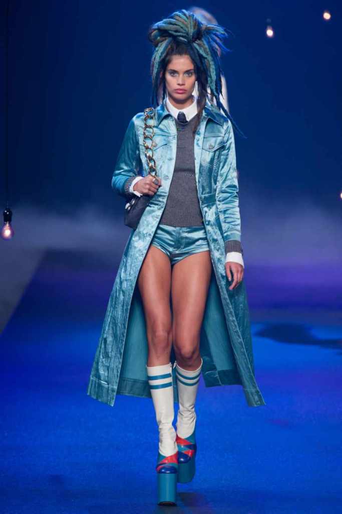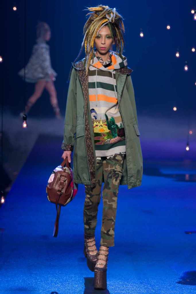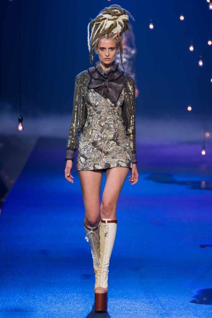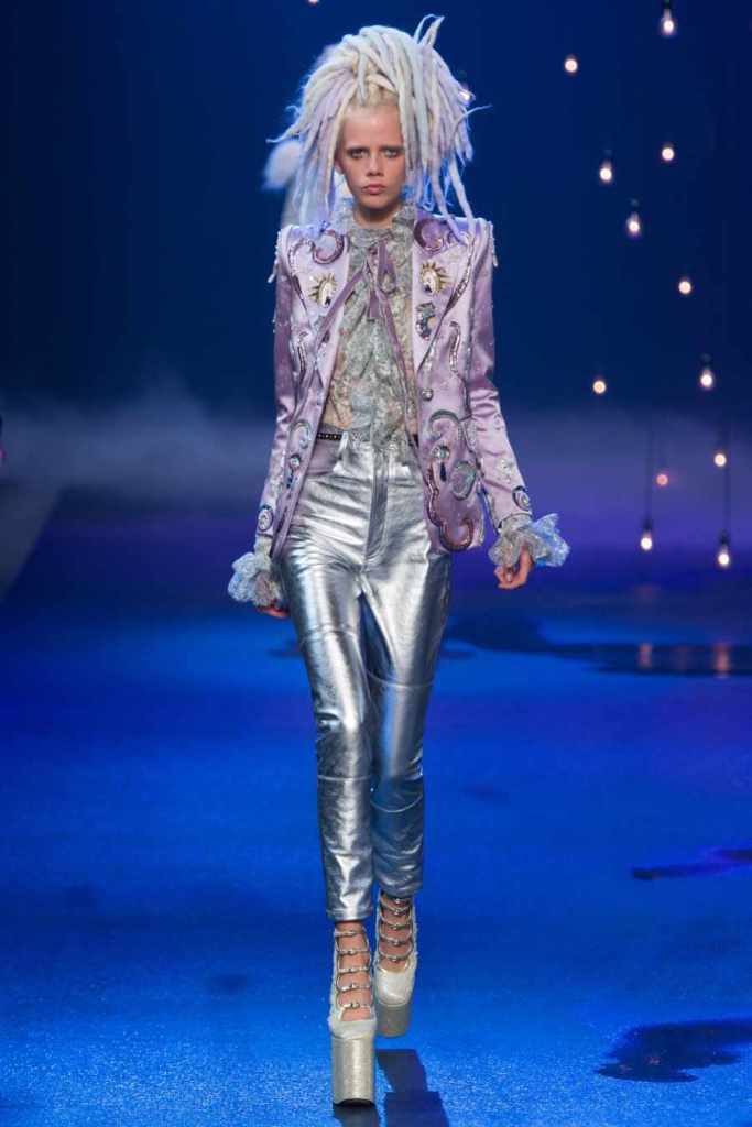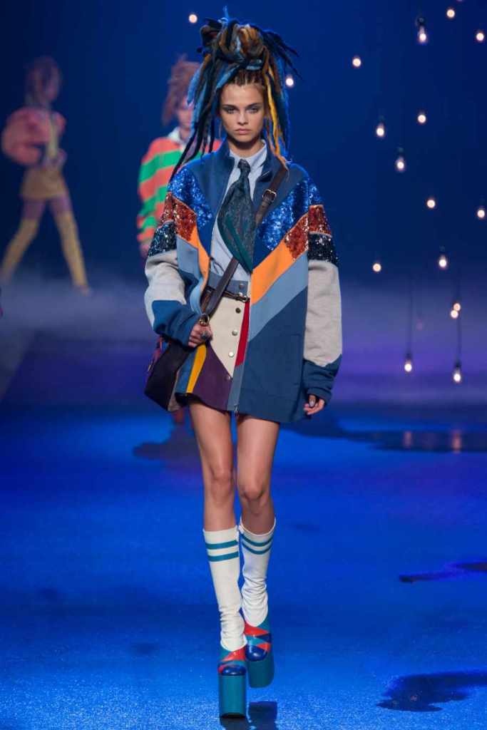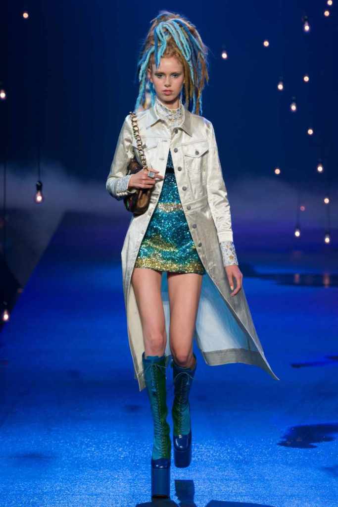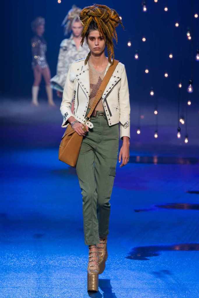 The clothes blended high school, streetwear, circus, and rave aesthetics, creating a captivating fusion of styles. With a nod to the mid-2010s outfit trends, Marc Jacobs managed to exude surprising chicness. Apart from the dreadlocks, it was a remarkably powerful collection by Jacobs. Amidst the sparkle, camouflage, satin, and snakeskin, the fusion of metallic extravagance and everyday staples was well achieved. Mini high-waisted shorts, towering platform boots, Victorian blouses, candy-colored hoodies, and an array of statement jackets were the defining pieces of the lineup. The message was clear: dress boldly.