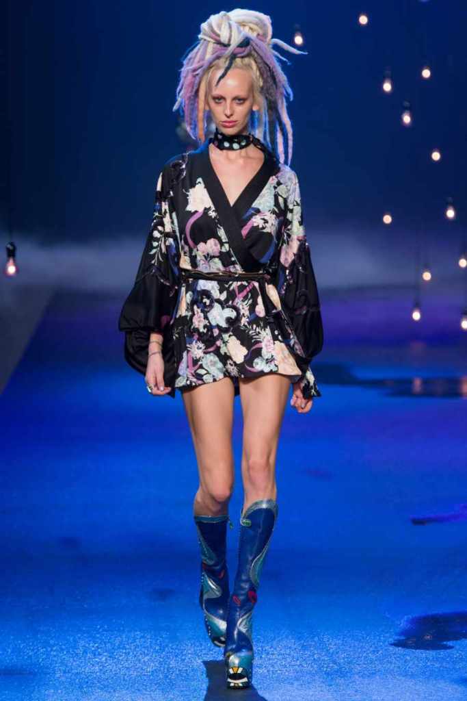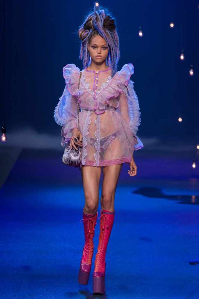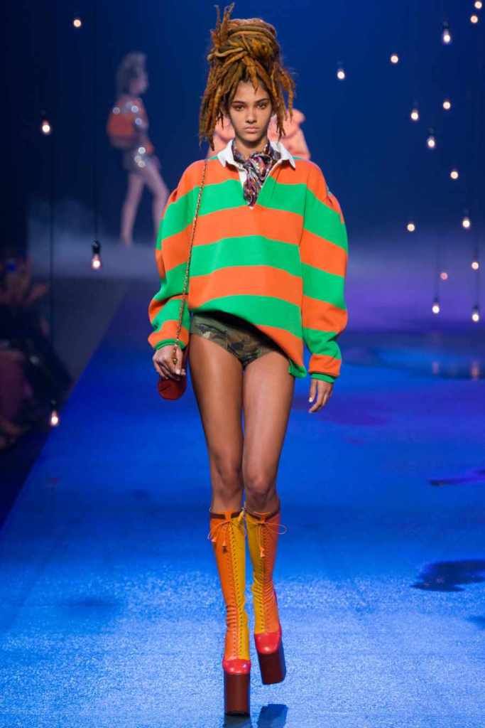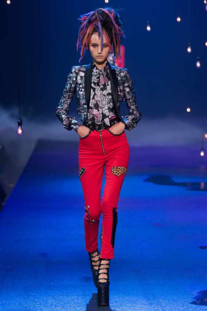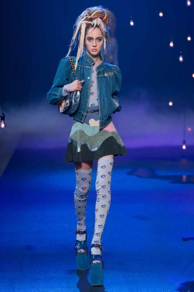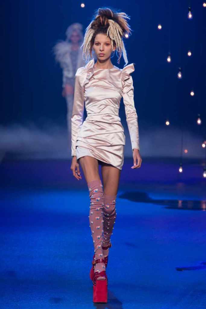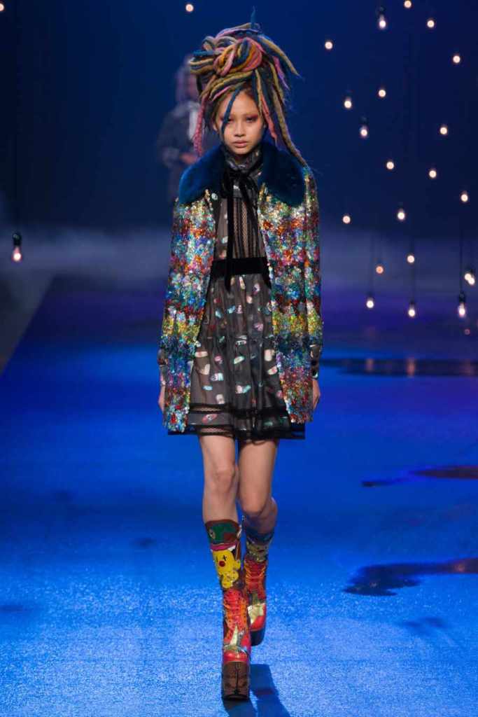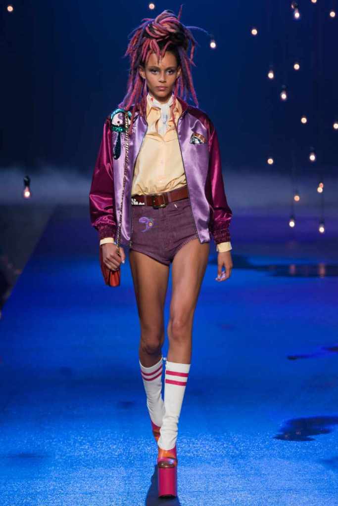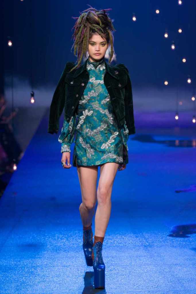The clothes blended high school, streetwear, circus, and rave aesthetics, creating a captivating fusion of styles. With a nod to the mid-2010s outfit trends, Marc Jacobs managed to exude surprising chicness. Apart from the dreadlocks, it was a remarkably powerful collection by Jacobs. Amidst the sparkle, camouflage, satin, and snakeskin, the fusion of metallic extravagance and everyday staples was well achieved. Mini high-waisted shorts, towering platform boots, Victorian blouses, candy-colored hoodies, and an array of statement jackets were the defining pieces of the lineup. The message was clear: dress boldly.