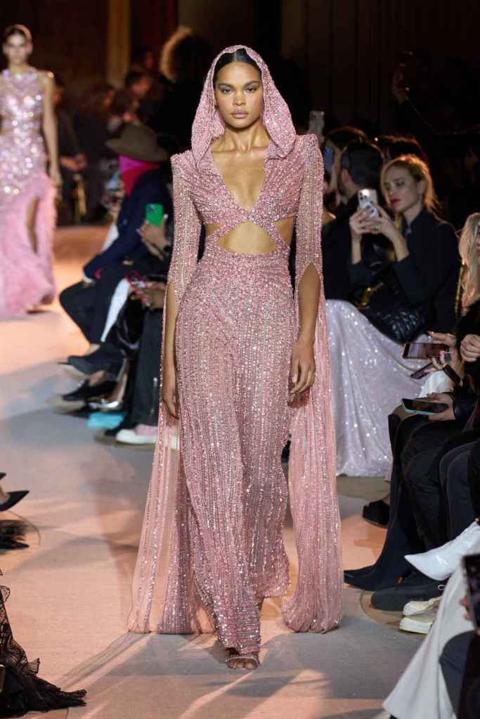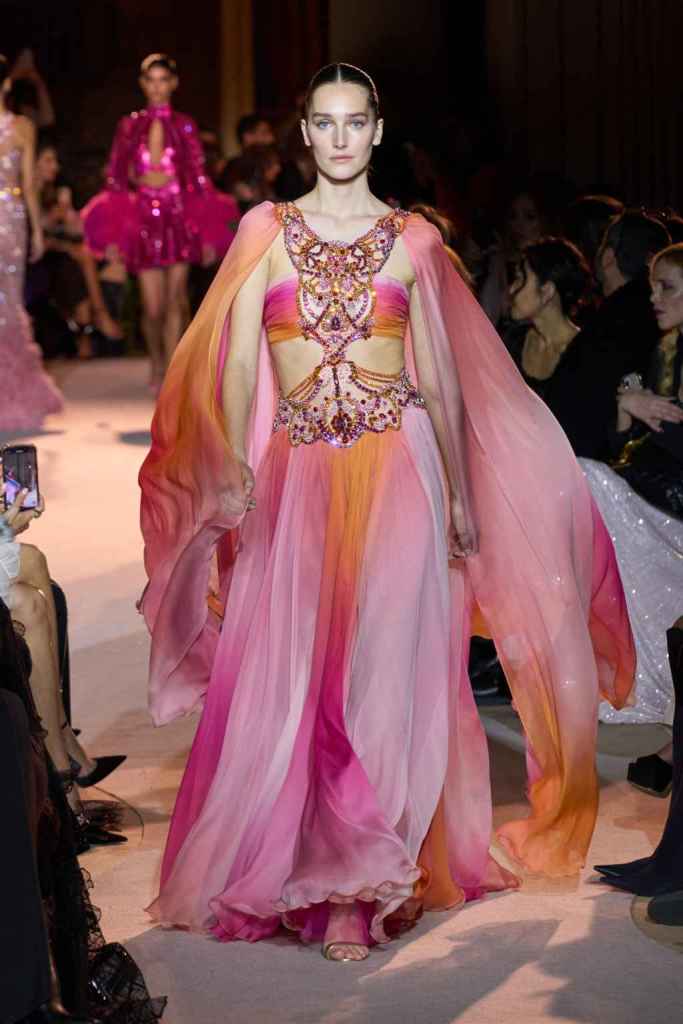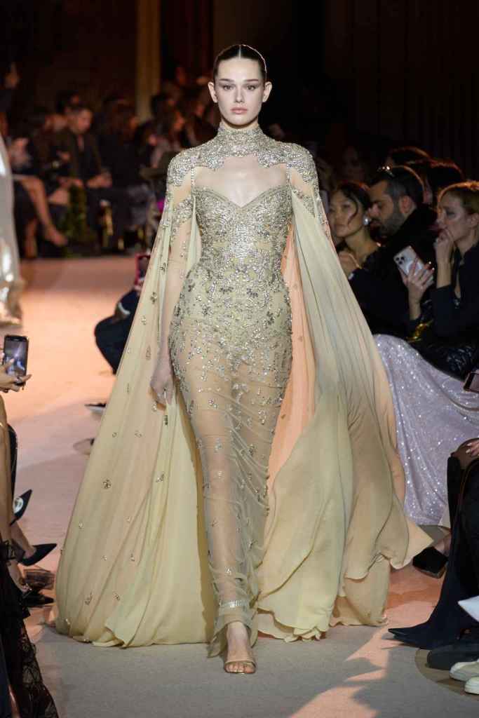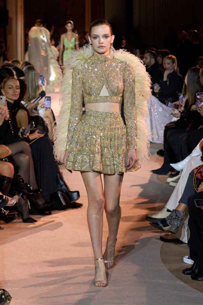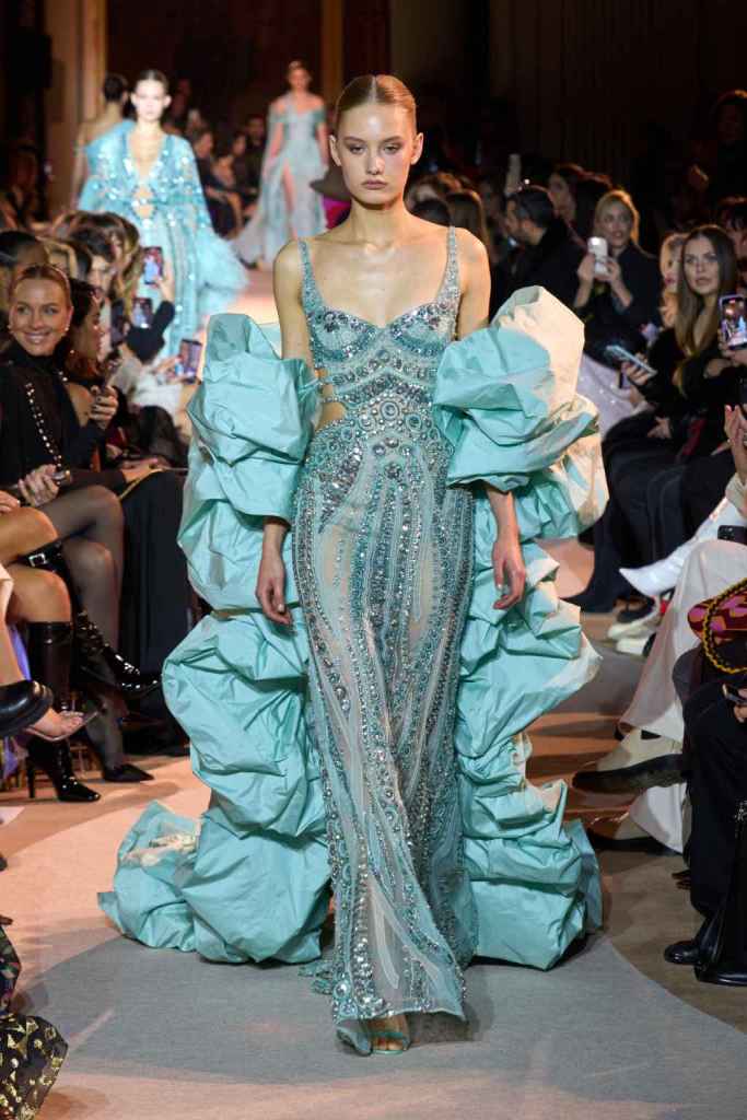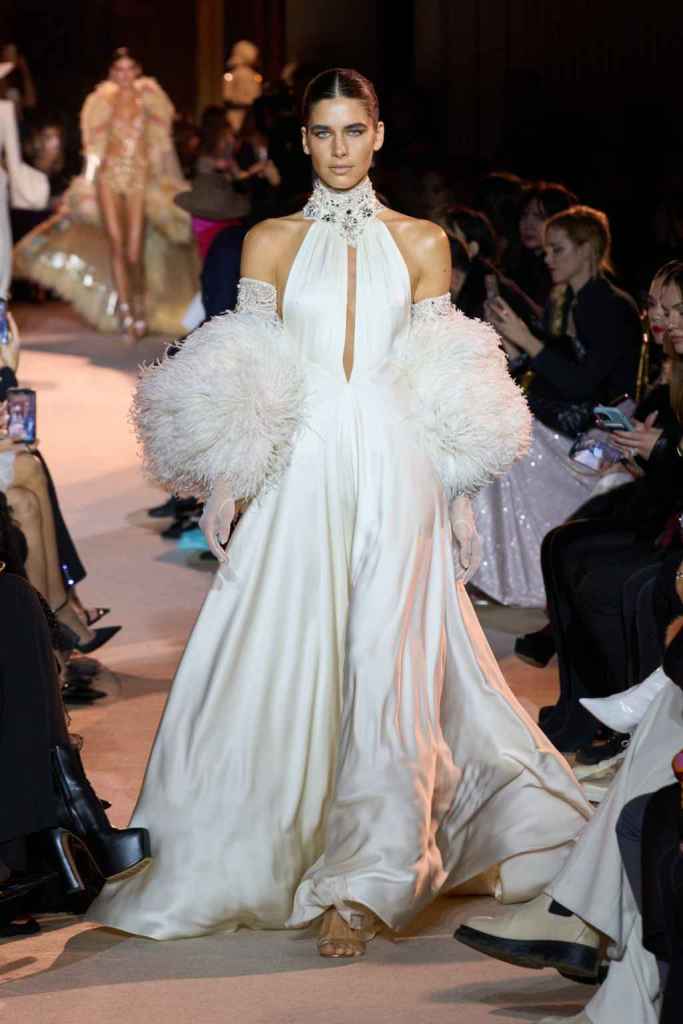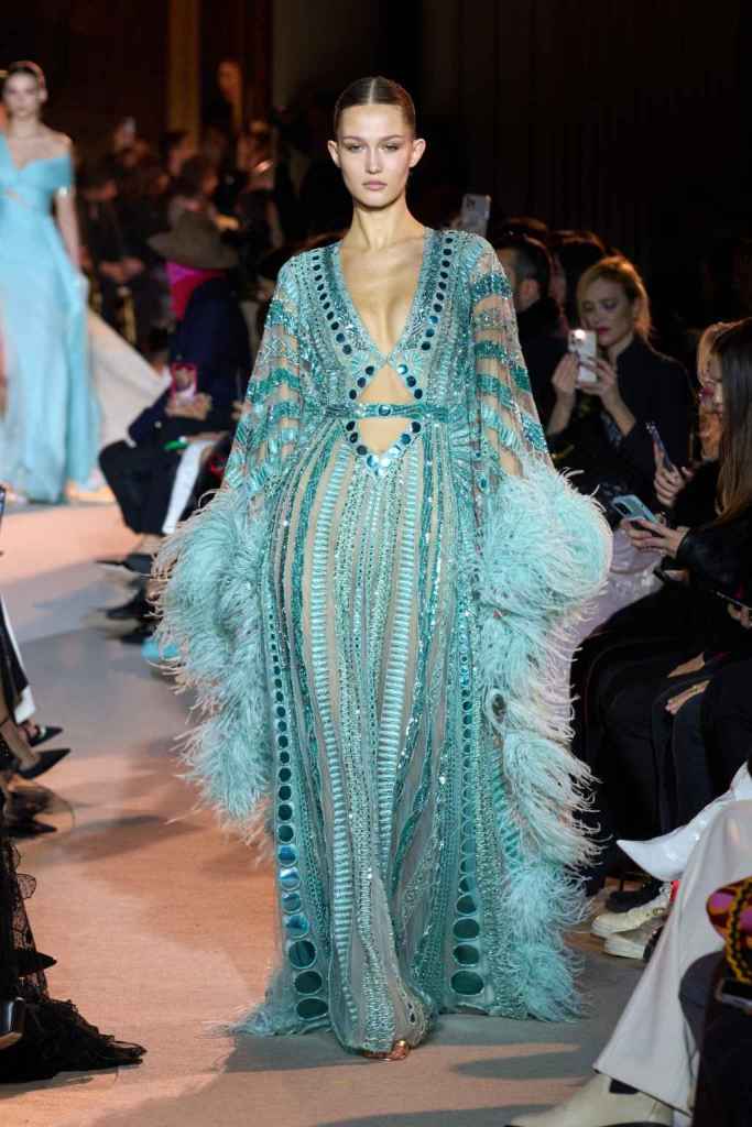 The designer always delivers what is expected of him; statement-making glamorous eveningwear. Inspired by the glamorous French Riviera in the ’70s, Murad’s collection embodied the freedom of azure and gold days, exuding sensuality and laughter. The colors are interactive, keep you hooked, and the details never stop engaging. We saw feathered sleeves, crystals embellished bodices, dramatic capes, mysterious hats and elegant cutouts. A collection true to his mastery and aesthetic; each look is drenched in glam and shimmers. With romantic, sexy silhouettes and delicate craftsmanship, his creations are a nod to the intoxicating glitz and glam that we all love.