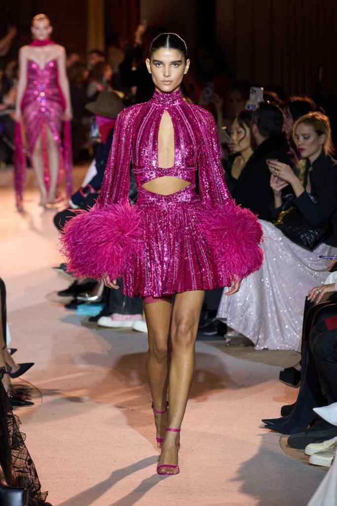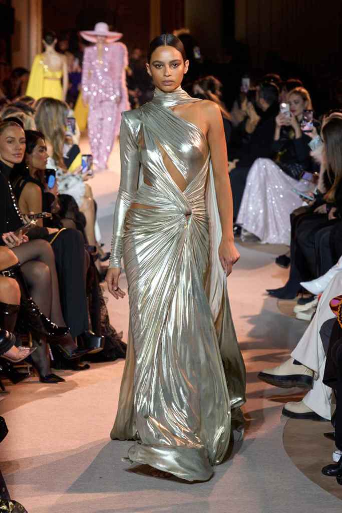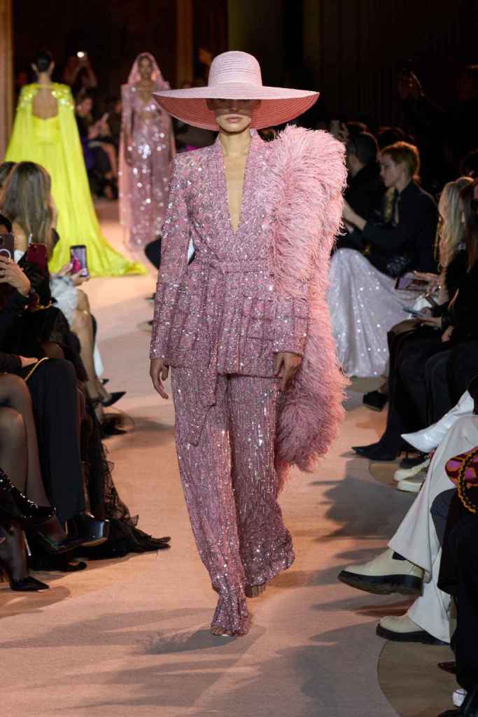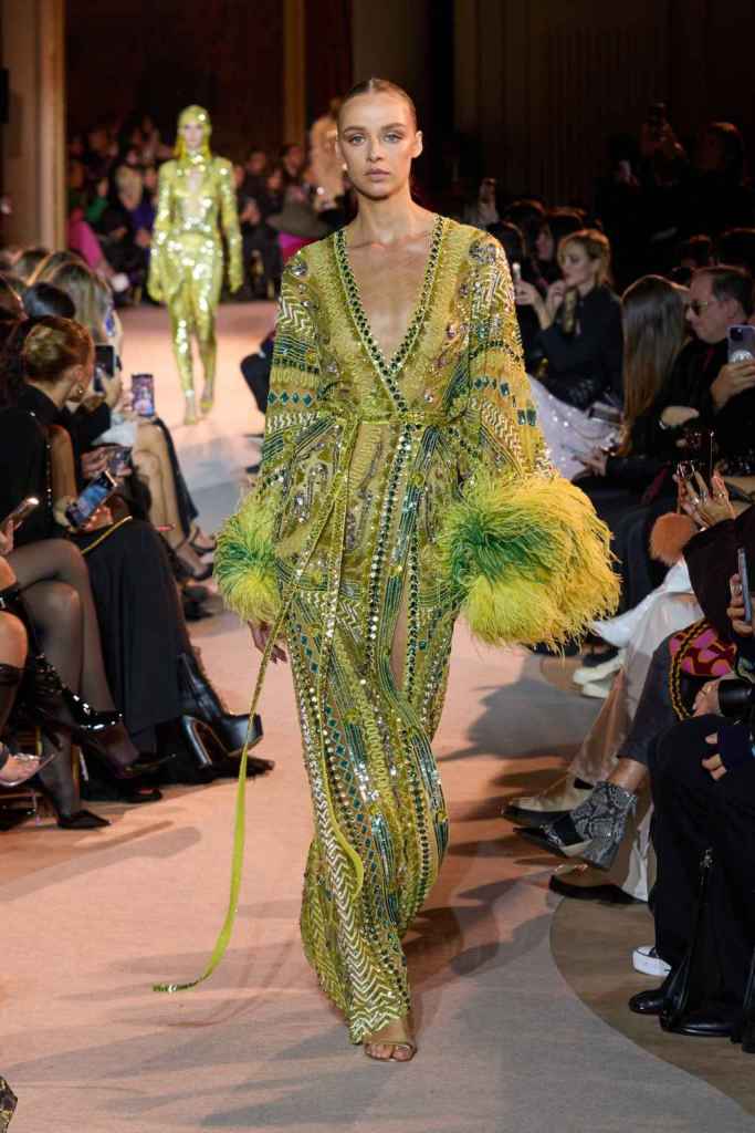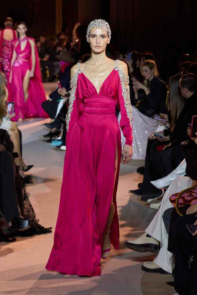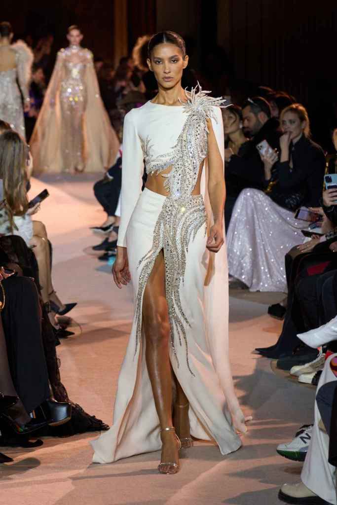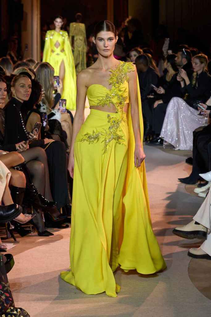The designer always delivers what is expected of him; statement-making glamorous eveningwear. Inspired by the glamorous French Riviera in the ’70s, Murad’s collection embodied the freedom of azure and gold days, exuding sensuality and laughter. The colors are interactive, keep you hooked, and the details never stop engaging. We saw feathered sleeves, crystals embellished bodices, dramatic capes, mysterious hats and elegant cutouts. A collection true to his mastery and aesthetic; each look is drenched in glam and shimmers. With romantic, sexy silhouettes and delicate craftsmanship, his creations are a nod to the intoxicating glitz and glam that we all love.