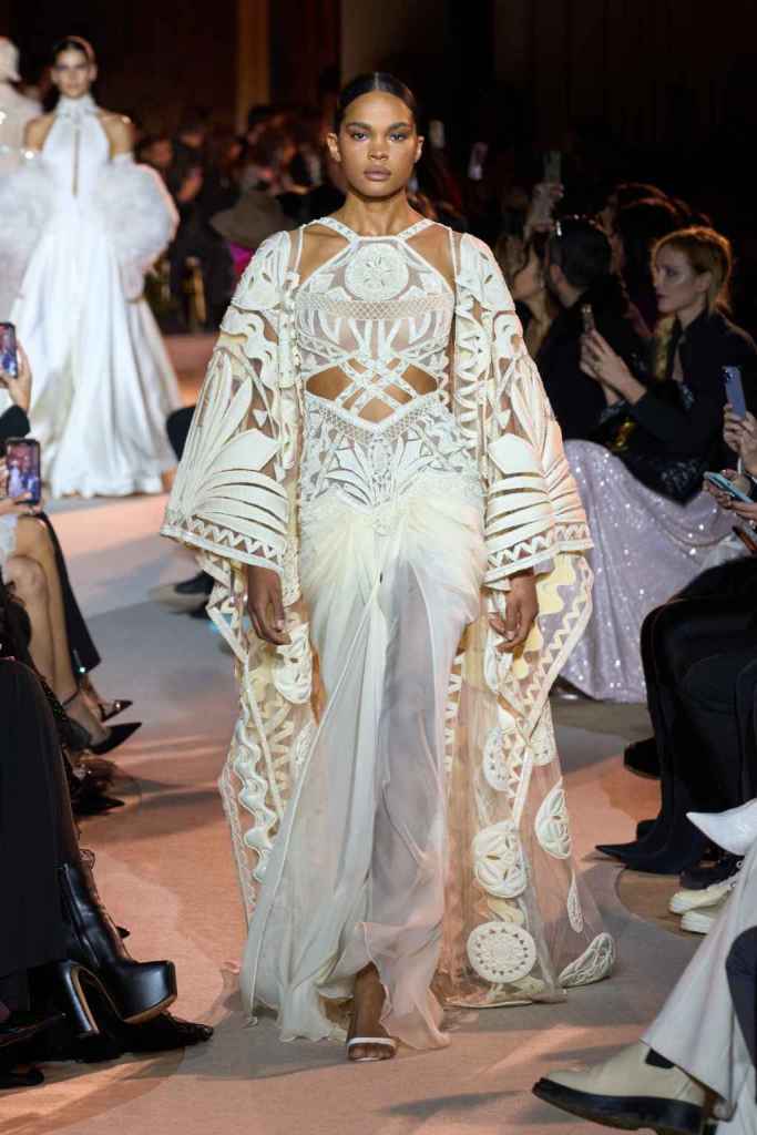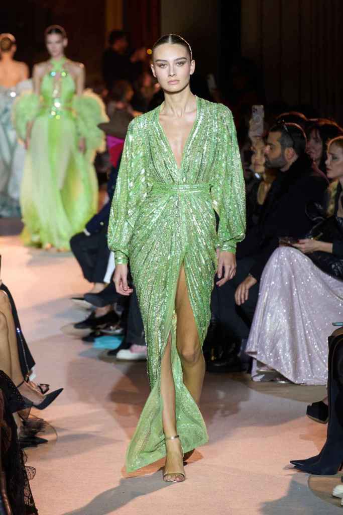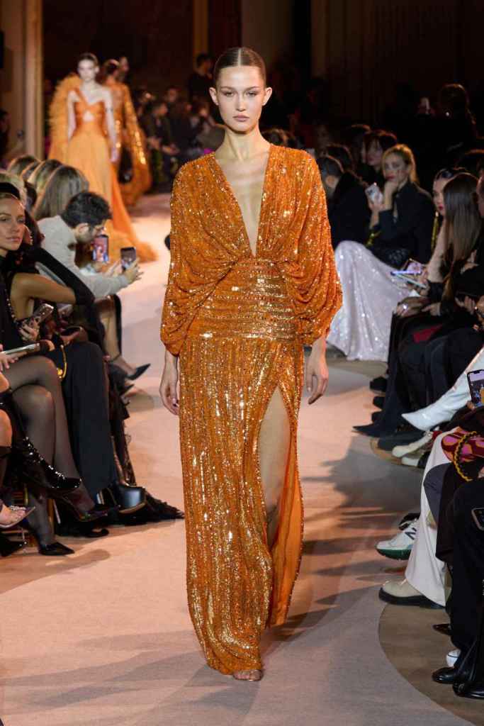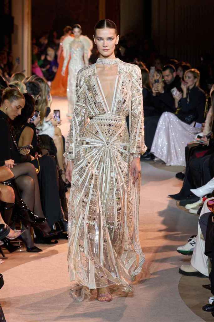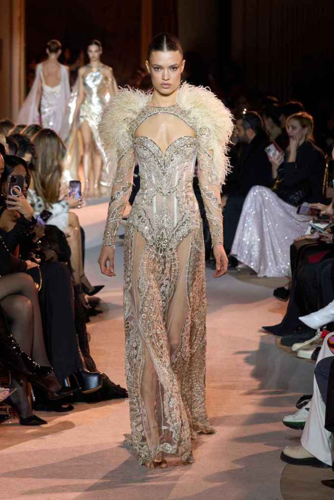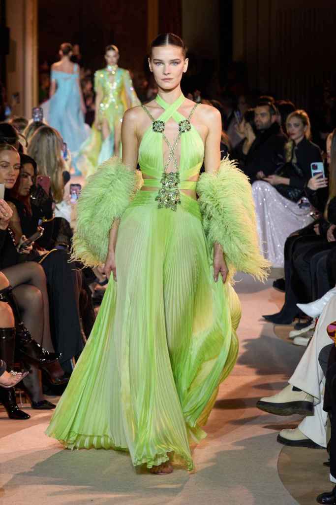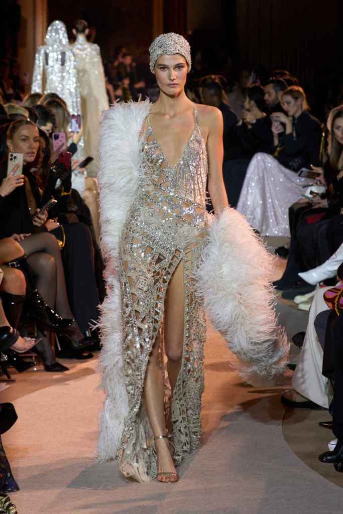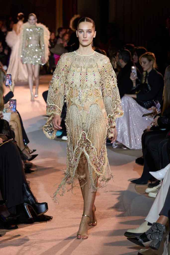 The designer always delivers what is expected of him; statement-making glamorous eveningwear. Inspired by the glamorous French Riviera in the ’70s, Murad’s collection embodied the freedom of azure and gold days, exuding sensuality and laughter. The colors are interactive, keep you hooked, and the details never stop engaging. We saw feathered sleeves, crystals embellished bodices, dramatic capes, mysterious hats and elegant cutouts. A collection true to his mastery and aesthetic; each look is drenched in glam and shimmers. With romantic, sexy silhouettes and delicate craftsmanship, his creations are a nod to the intoxicating glitz and glam that we all love.