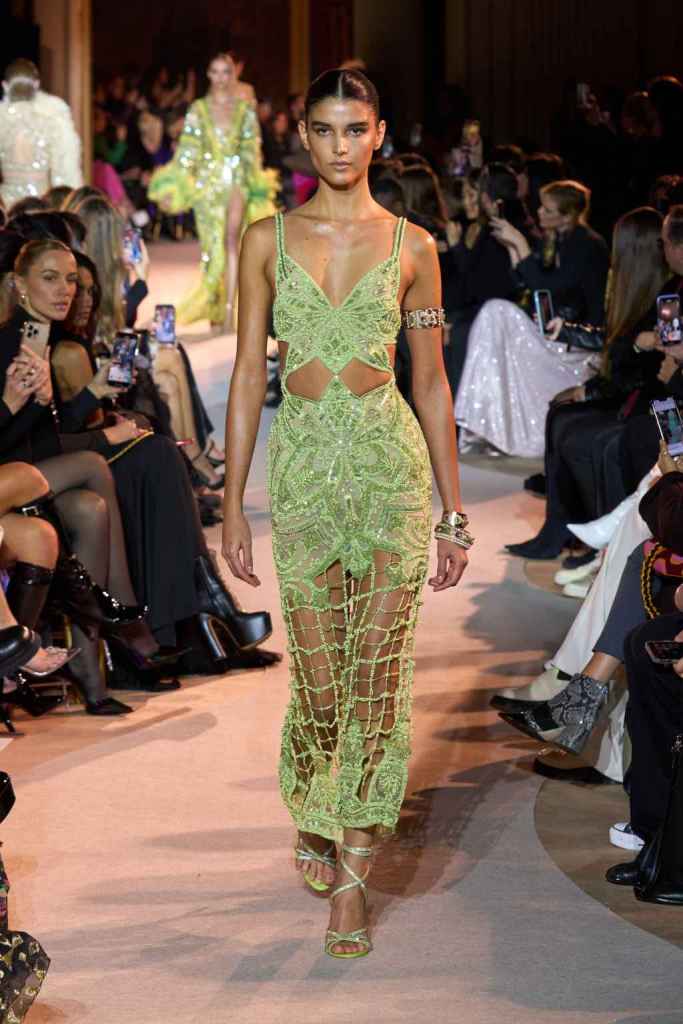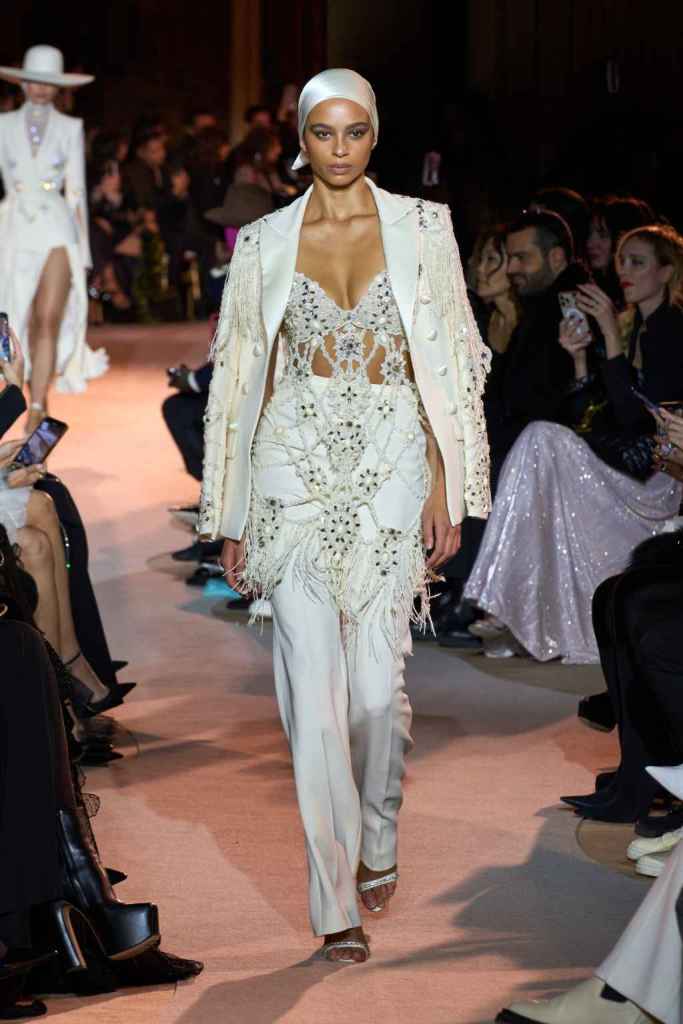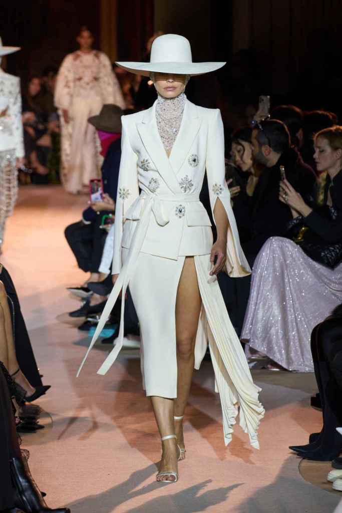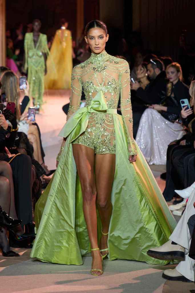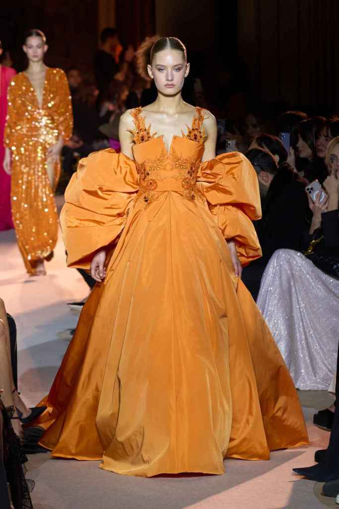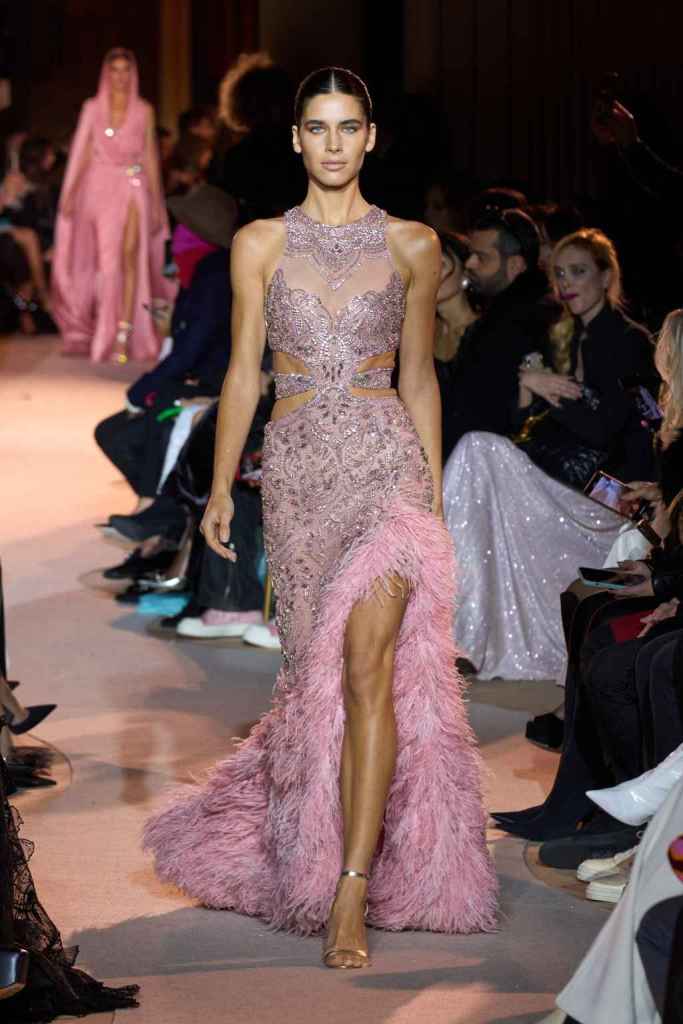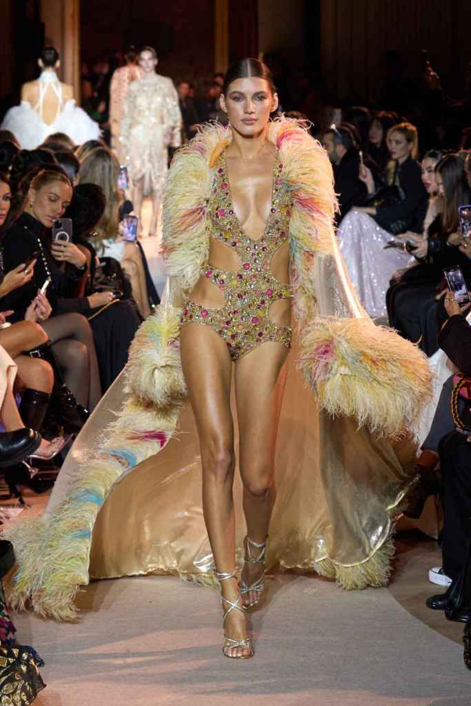 The designer always delivers what is expected of him; statement-making glamorous eveningwear. Inspired by the glamorous French Riviera in the ’70s, Murad’s collection embodied the freedom of azure and gold days, exuding sensuality and laughter. The colors are interactive, keep you hooked, and the details never stop engaging. We saw feathered sleeves, crystals embellished bodices, dramatic capes, mysterious hats and elegant cutouts. A collection true to his mastery and aesthetic; each look is drenched in glam and shimmers. With romantic, sexy silhouettes and delicate craftsmanship, his creations are a nod to the intoxicating glitz and glam that we all love.