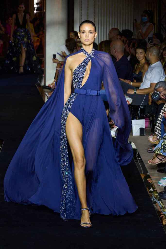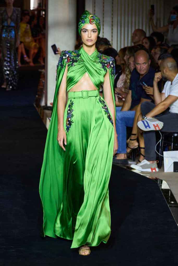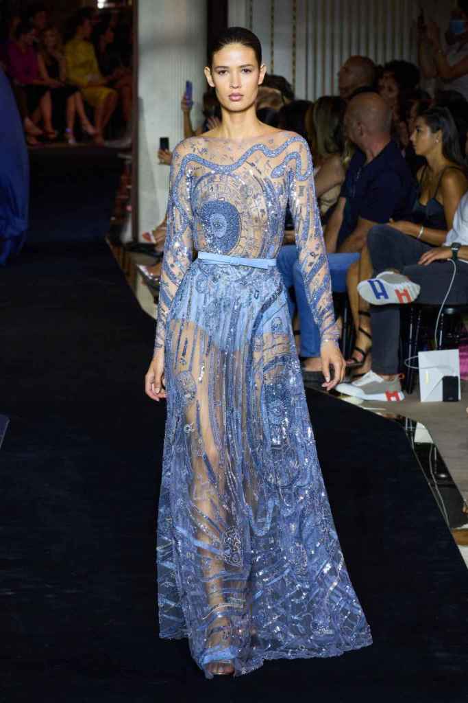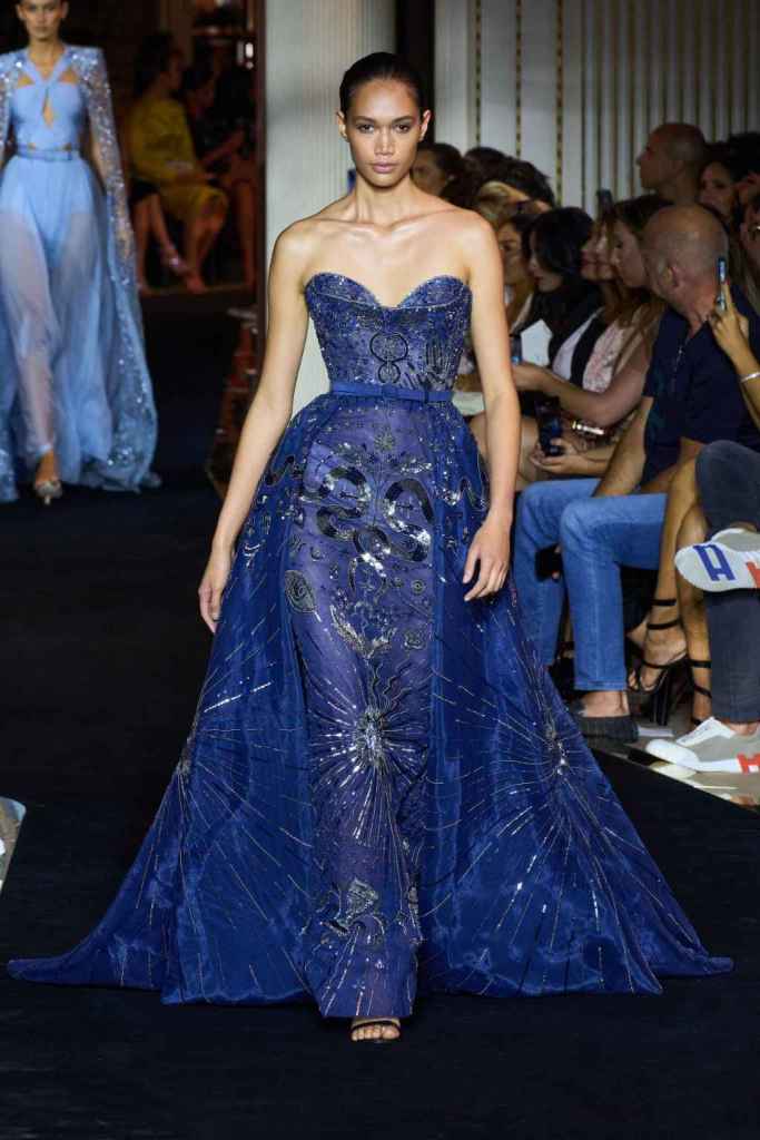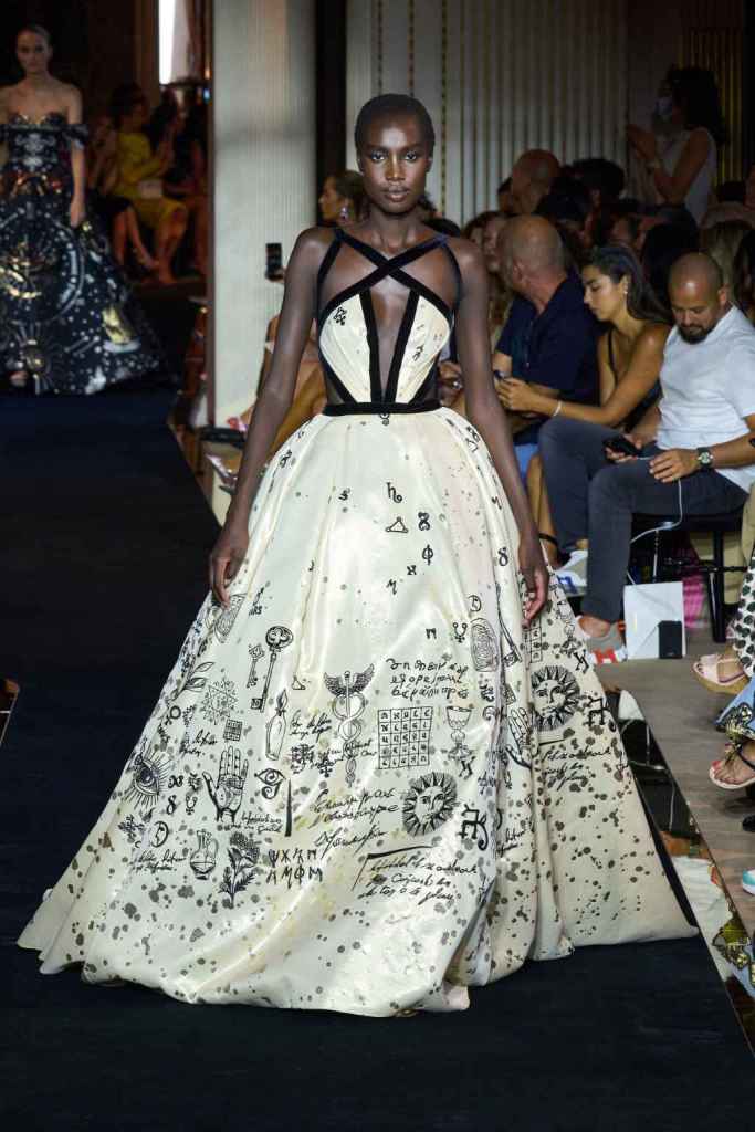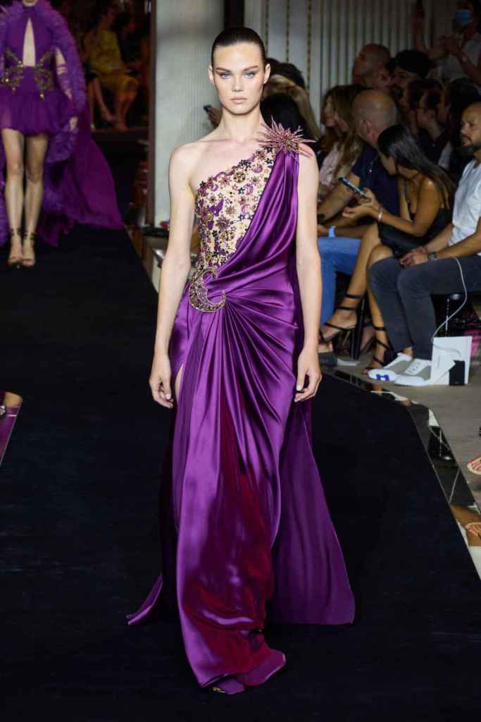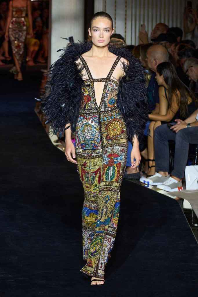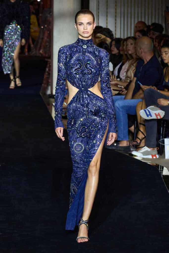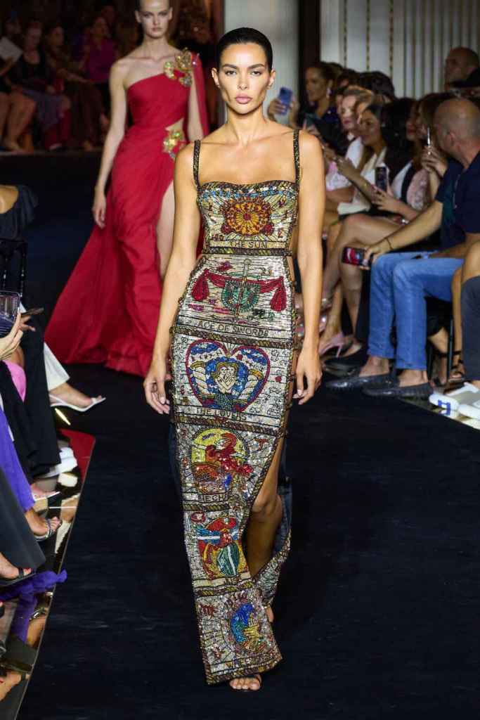 Symbolizing mystical spirituality, Zuhair Murad incorporates planets, horoscopes, and the magic of the cosmos. Murad believes couture can attract love, fortune, and happiness. Tarot cards, all-seeing eyes, zodiac signs, cryptic symbols and golden snakes adorn colorful creations, while sensual purple and Klein blue ensembles add zest to the lineup. From gypsy skirts to silk turbans, every piece is a manifestation of esoteric allure. His fascination with the unknown is evident as he weaves ancient and enigmatic elements into his designs.