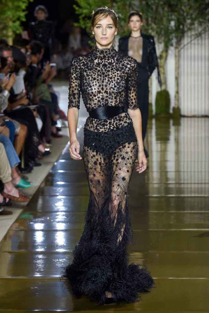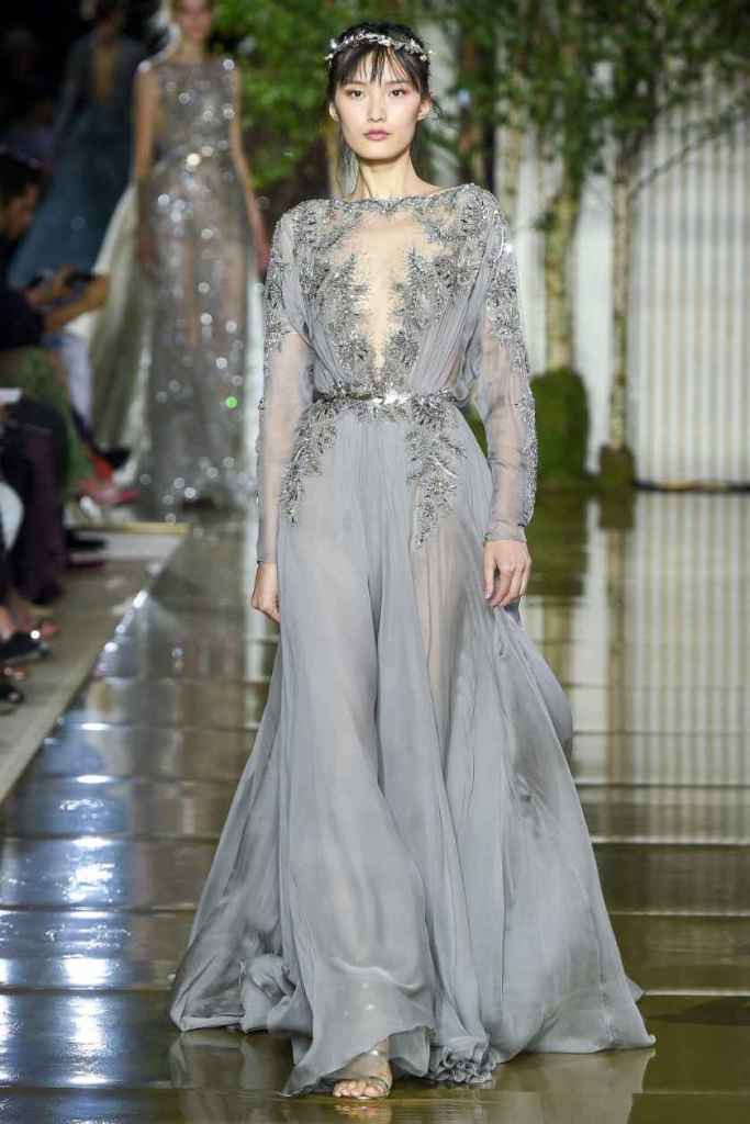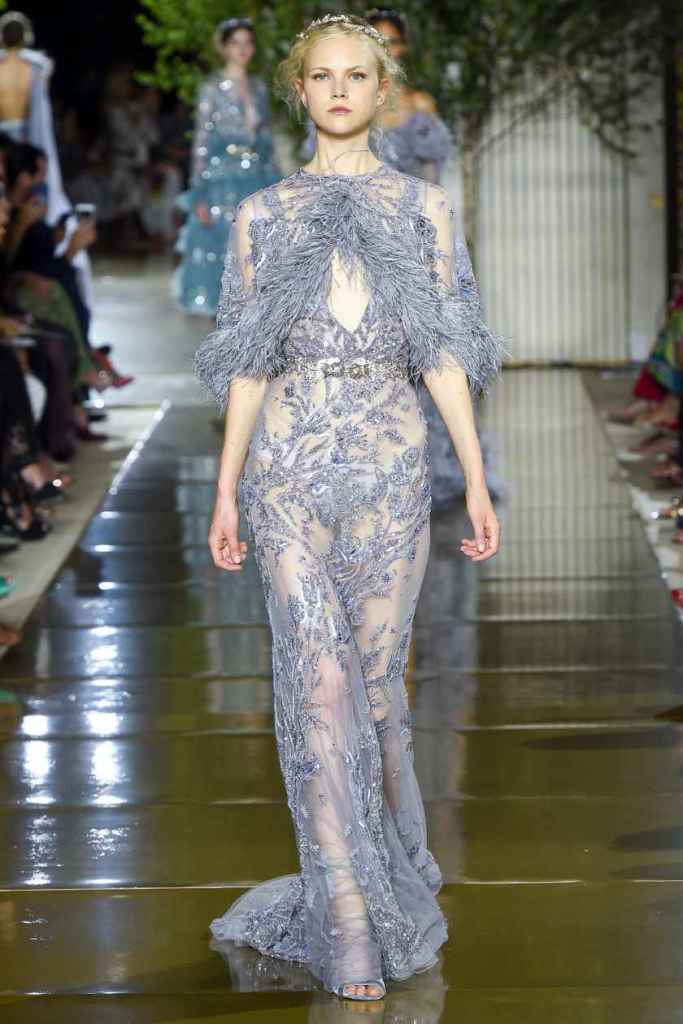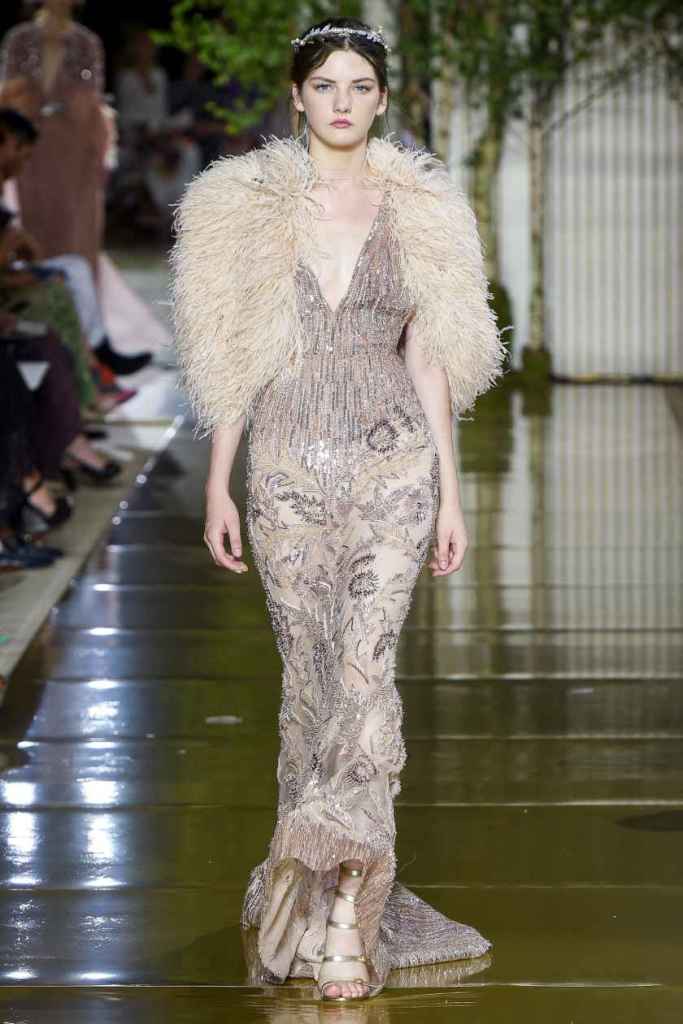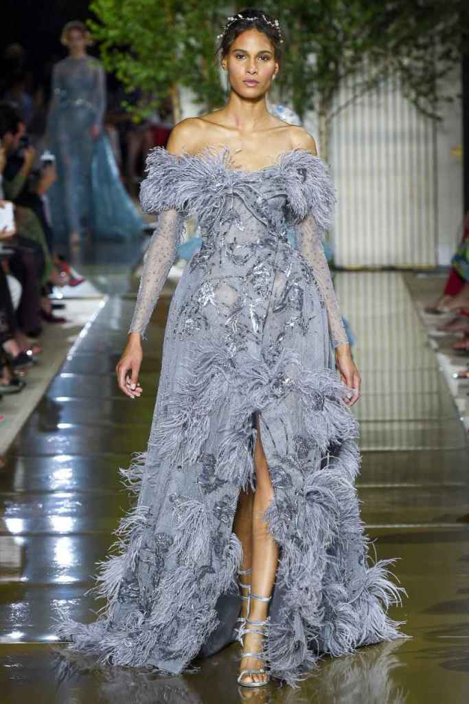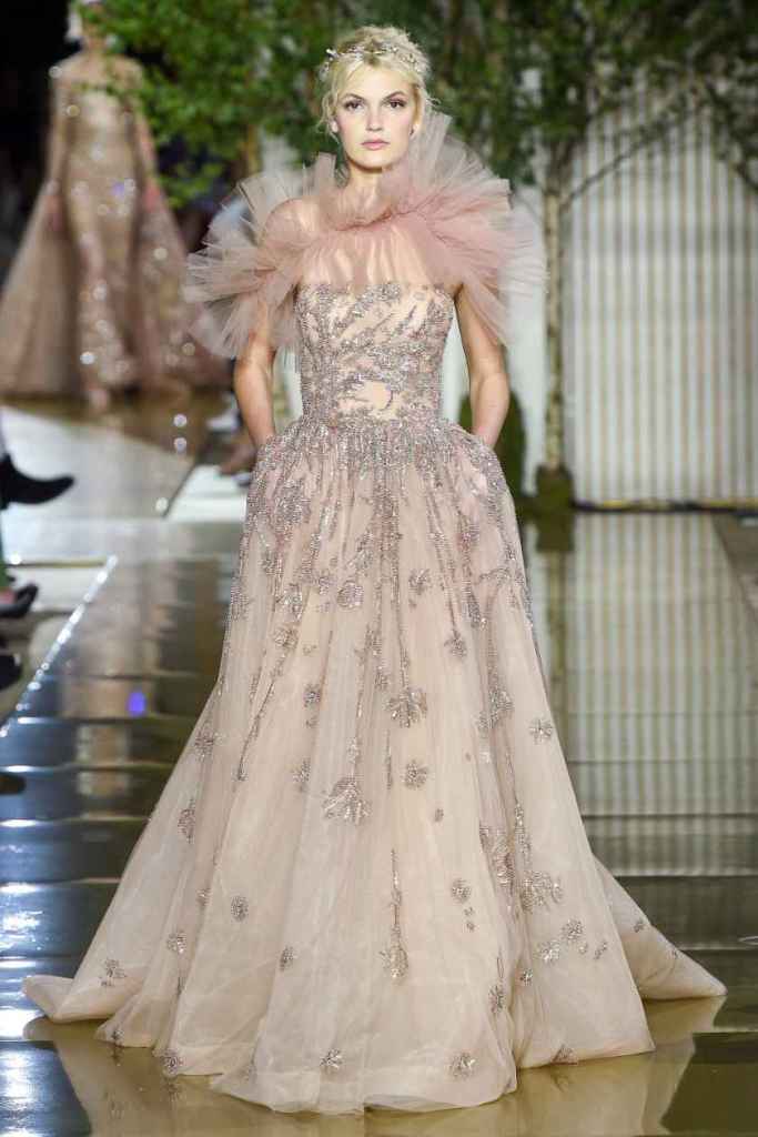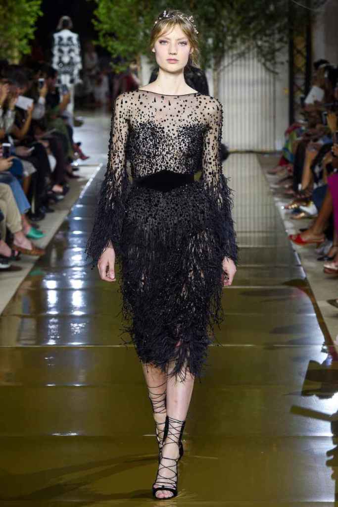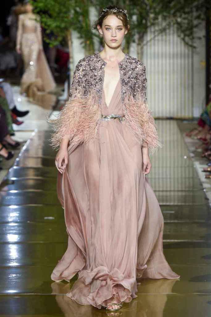 The ethereal gowns in powdery pastels and bold features pay homage to the early 20th-century illustrations by Charles Dana Gibson. His couture pieces capture self-confidence and sophistication – ranging from slashed necklines to plunging backs. Nude illusions, metallic flowers, ostrich feathers, ethereal embellishments and floor-sweeping chiffon trains lead the collection. Starting with black the collection moves to a dreamy pastel palette.