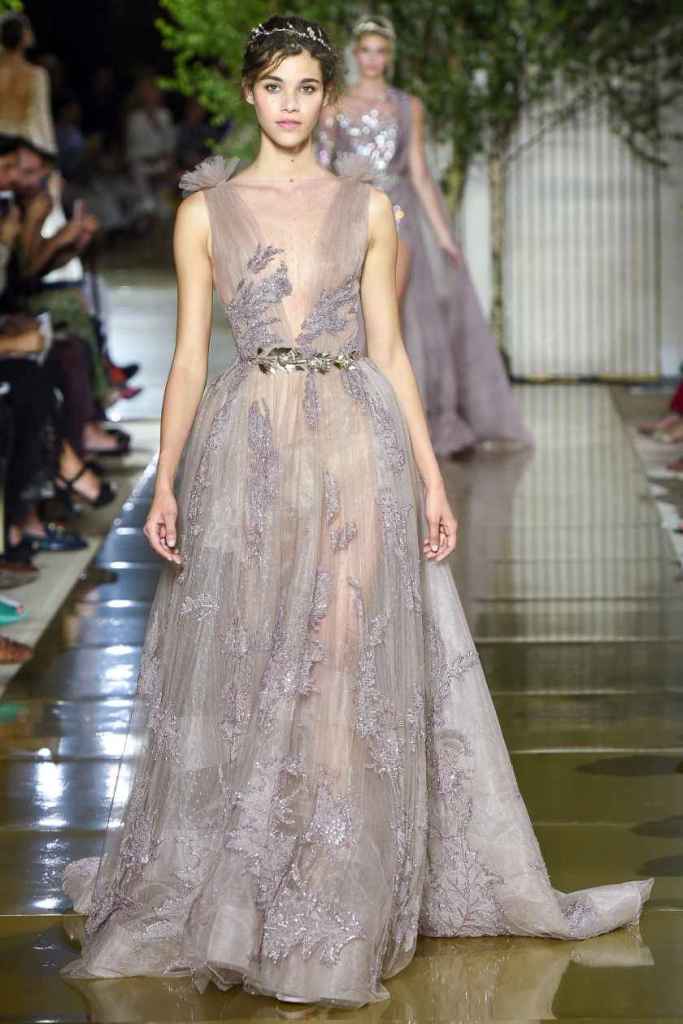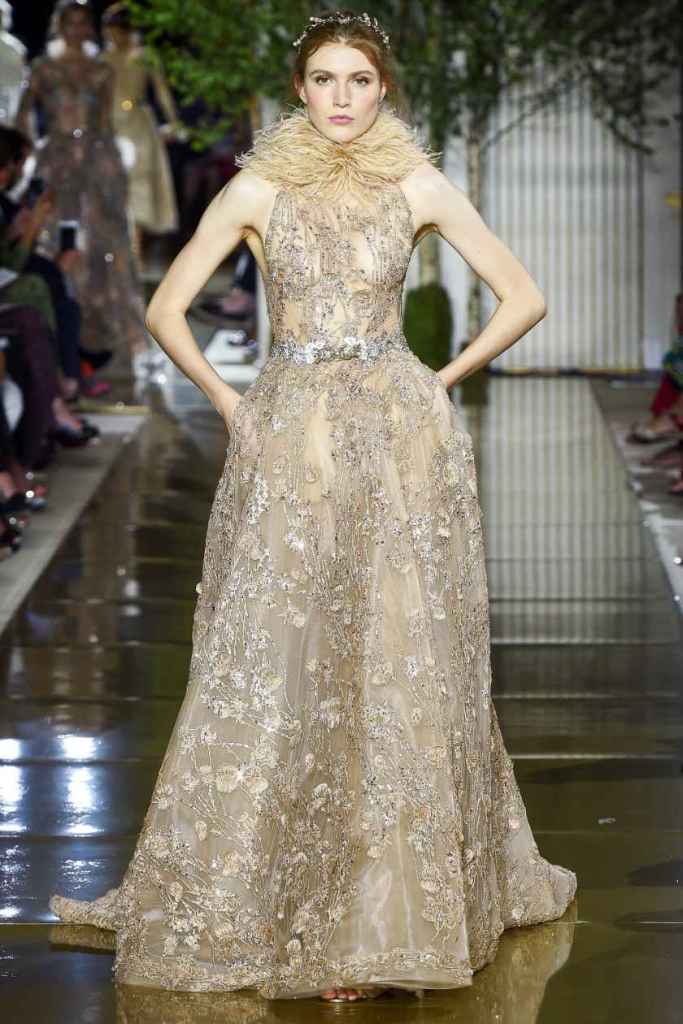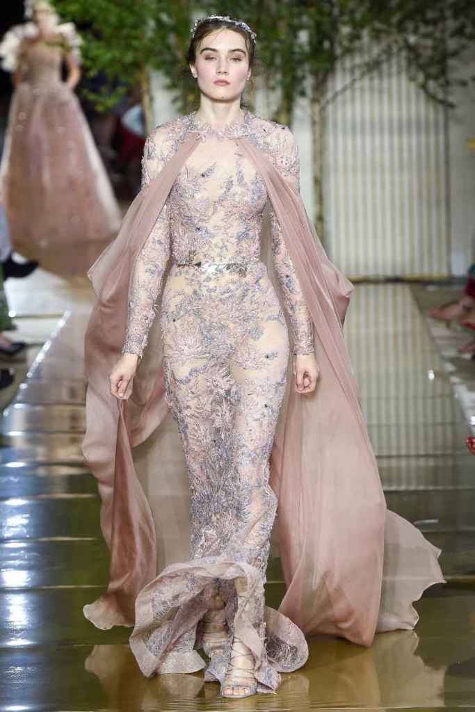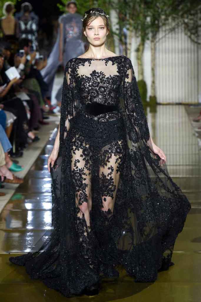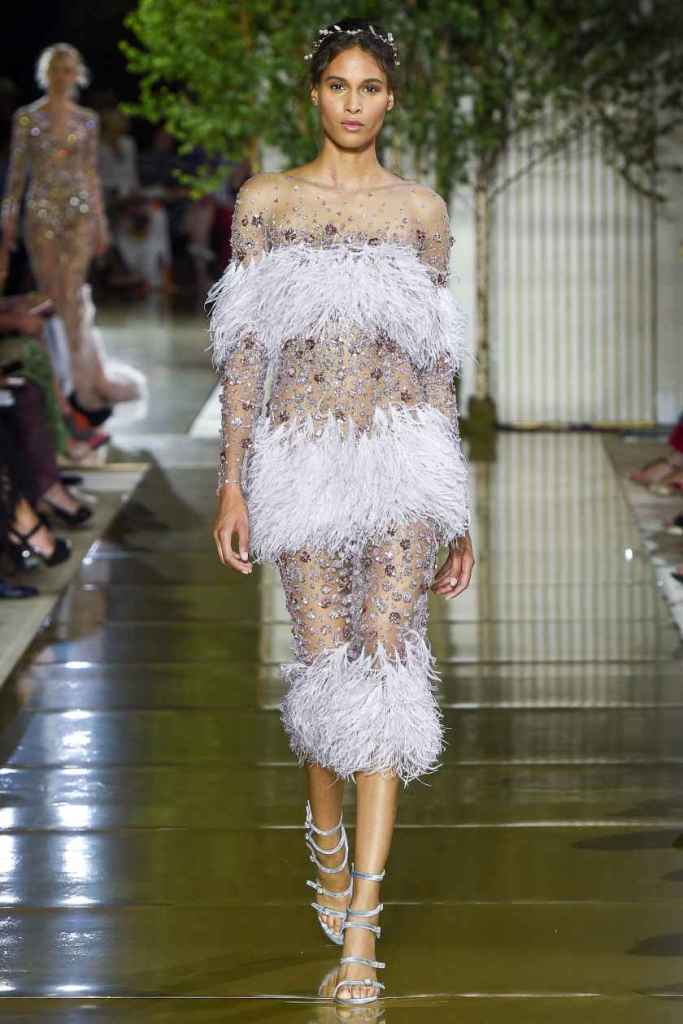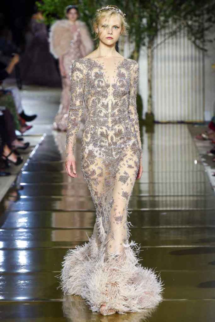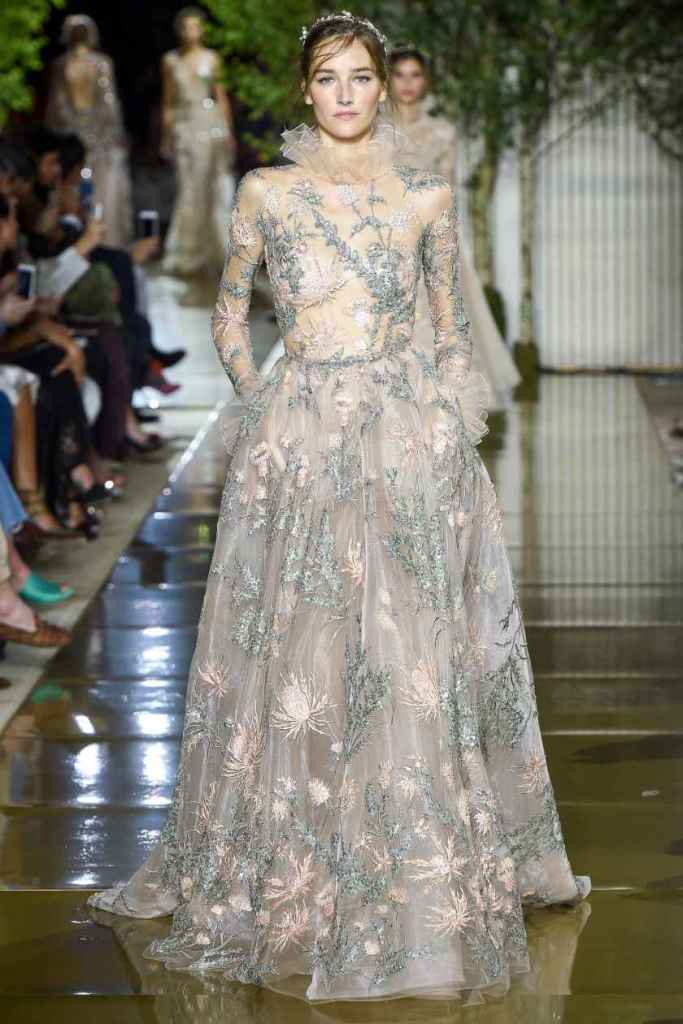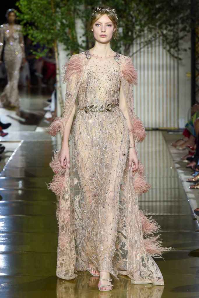The ethereal gowns in powdery pastels and bold features pay homage to the early 20th-century illustrations by Charles Dana Gibson. His couture pieces capture self-confidence and sophistication – ranging from slashed necklines to plunging backs. Nude illusions, metallic flowers, ostrich feathers, ethereal embellishments and floor-sweeping chiffon trains lead the collection. Starting with black the collection moves to a dreamy pastel palette.
