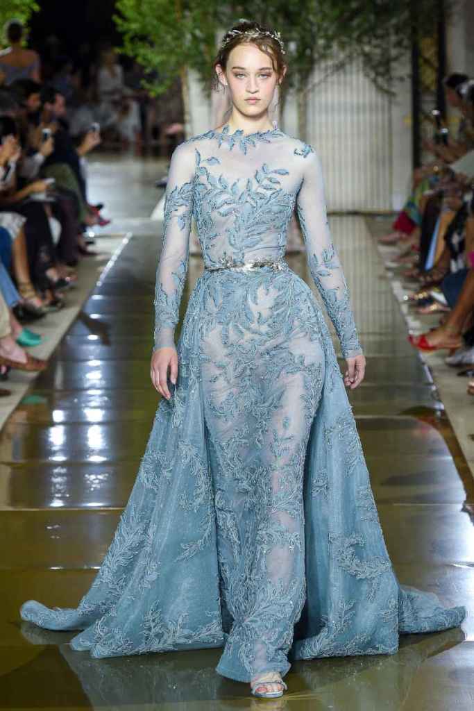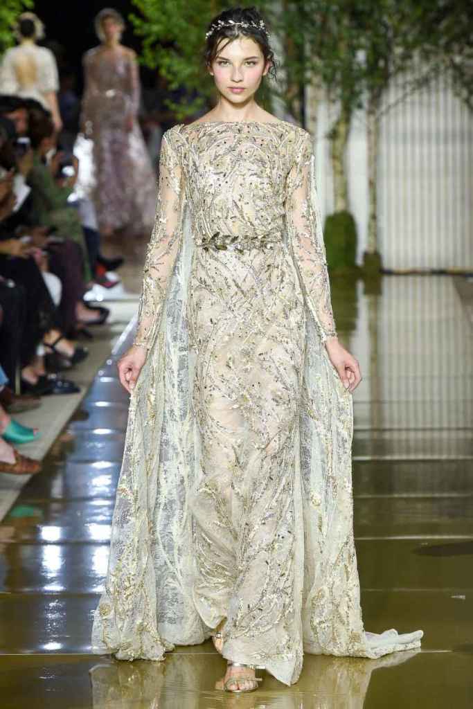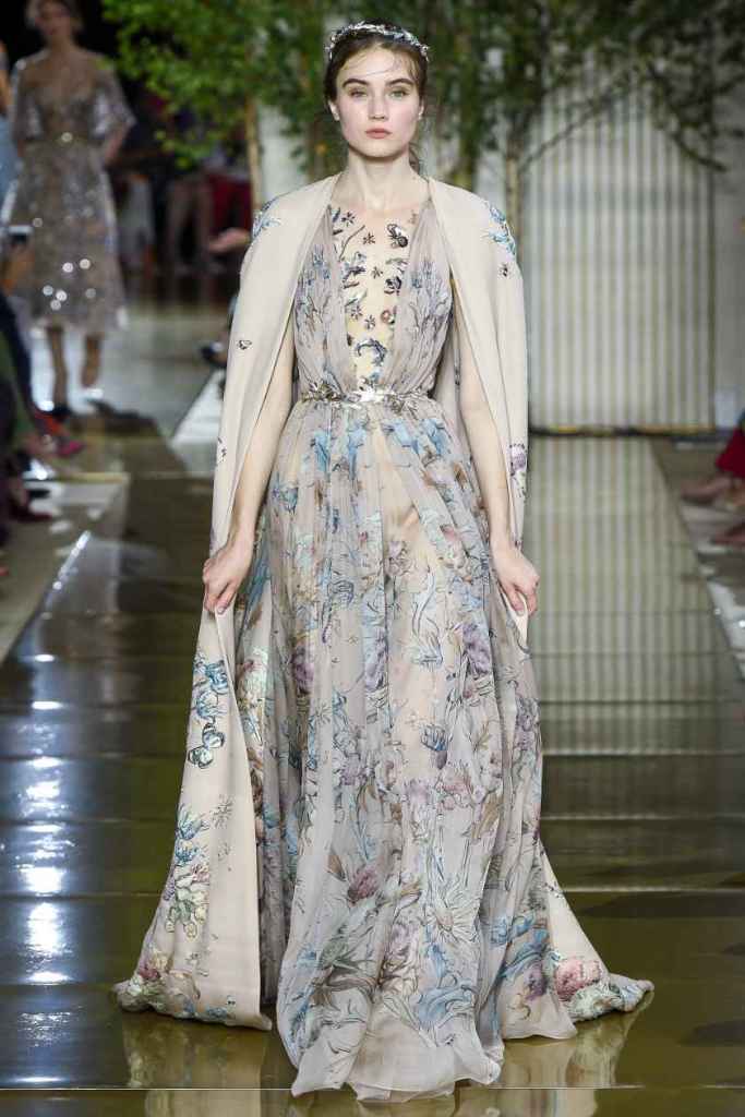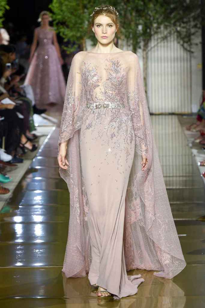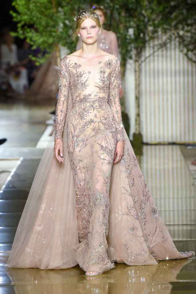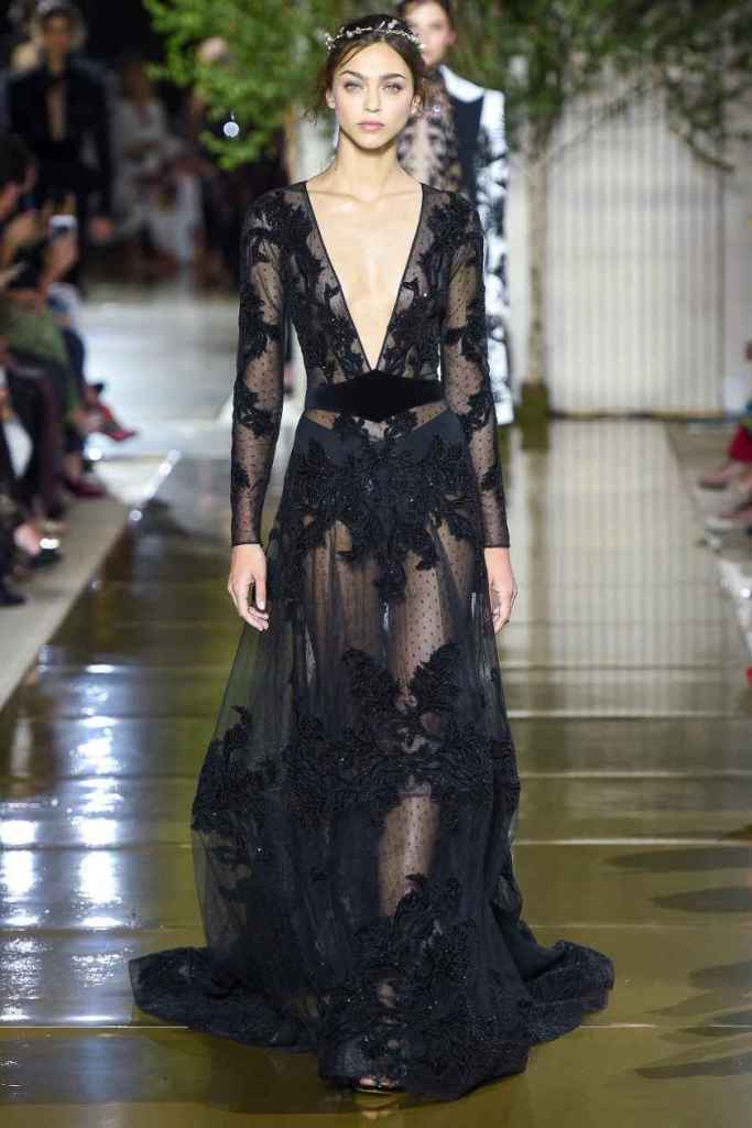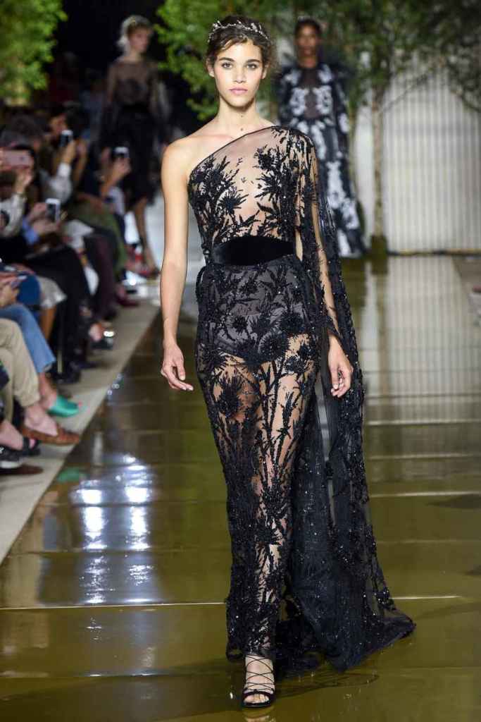 The ethereal gowns in powdery pastels and bold features pay homage to the early 20th-century illustrations by Charles Dana Gibson. His couture pieces capture self-confidence and sophistication – ranging from slashed necklines to plunging backs. Nude illusions, metallic flowers, ostrich feathers, ethereal embellishments and floor-sweeping chiffon trains lead the collection. Starting with black the collection moves to a dreamy pastel palette.