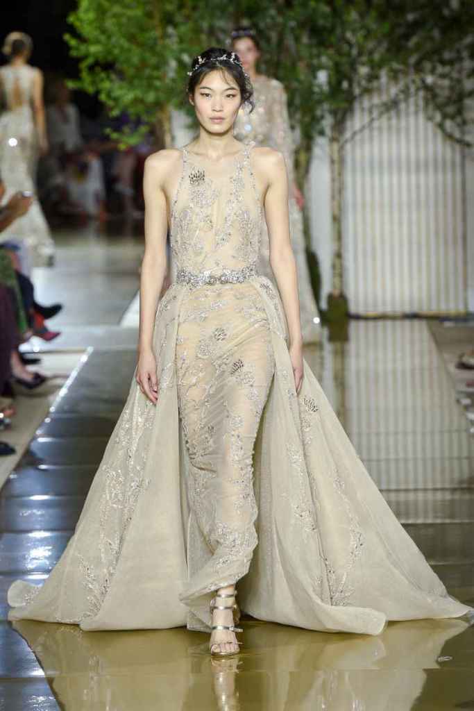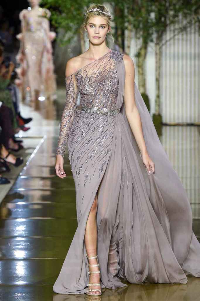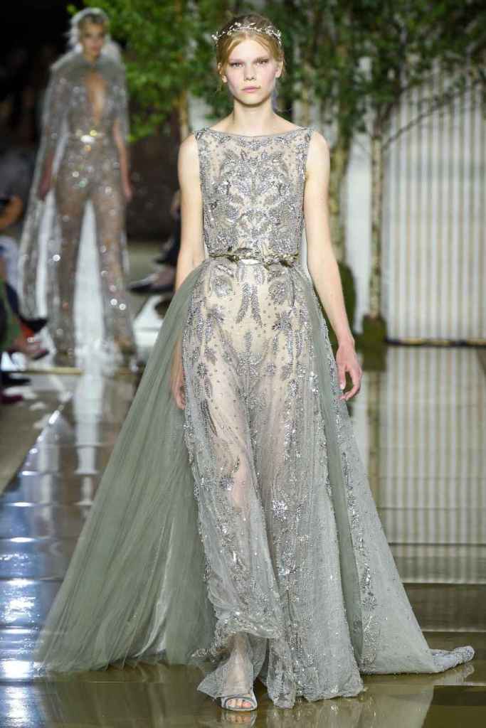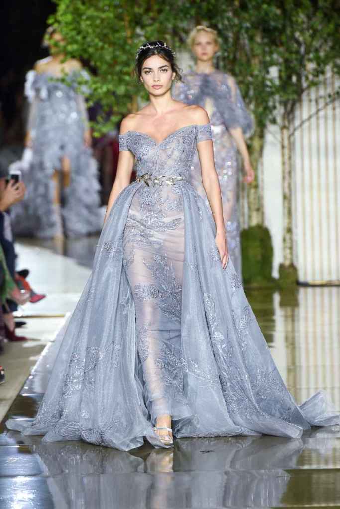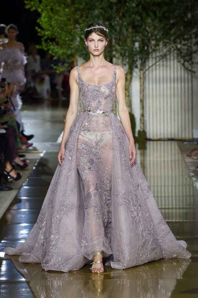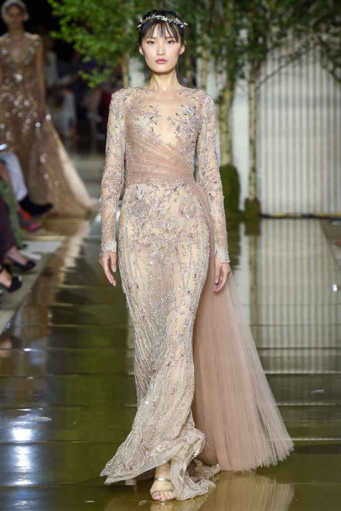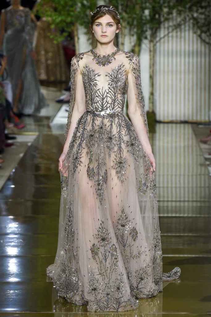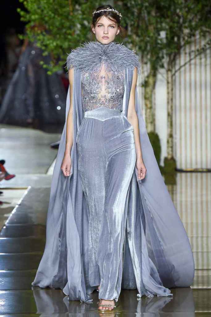 The ethereal gowns in powdery pastels and bold features pay homage to the early 20th-century illustrations by Charles Dana Gibson. His couture pieces capture self-confidence and sophistication – ranging from slashed necklines to plunging backs. Nude illusions, metallic flowers, ostrich feathers, ethereal embellishments and floor-sweeping chiffon trains lead the collection. Starting with black the collection moves to a dreamy pastel palette.