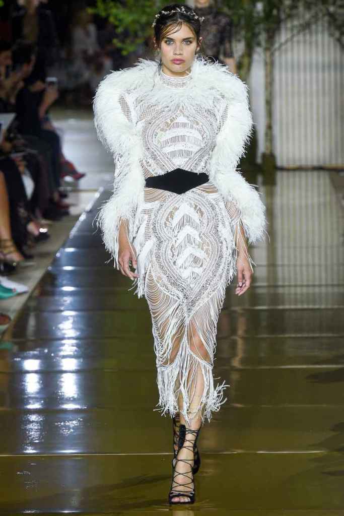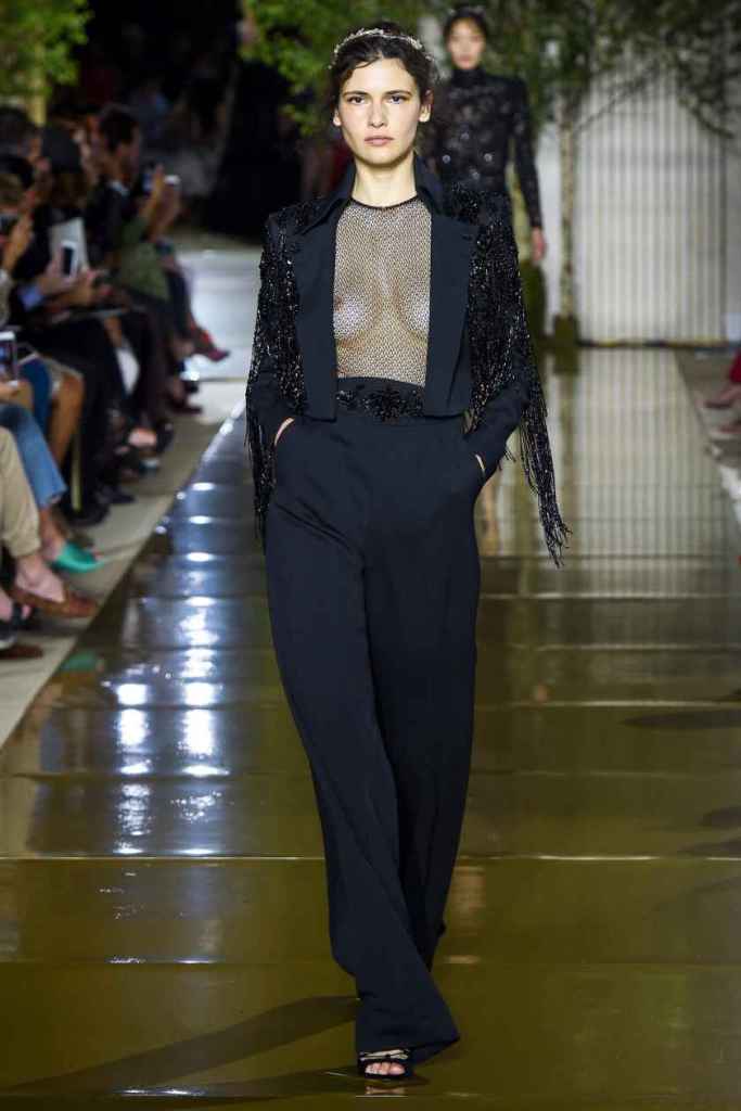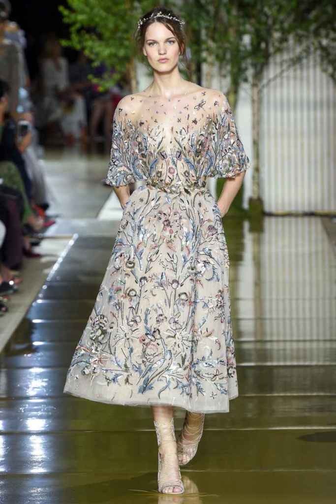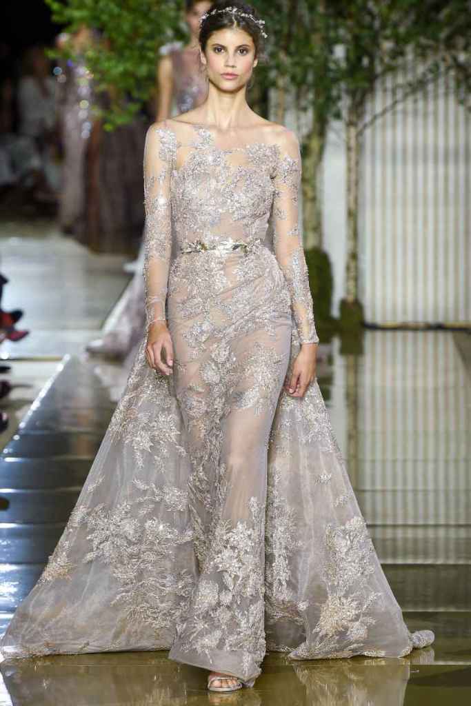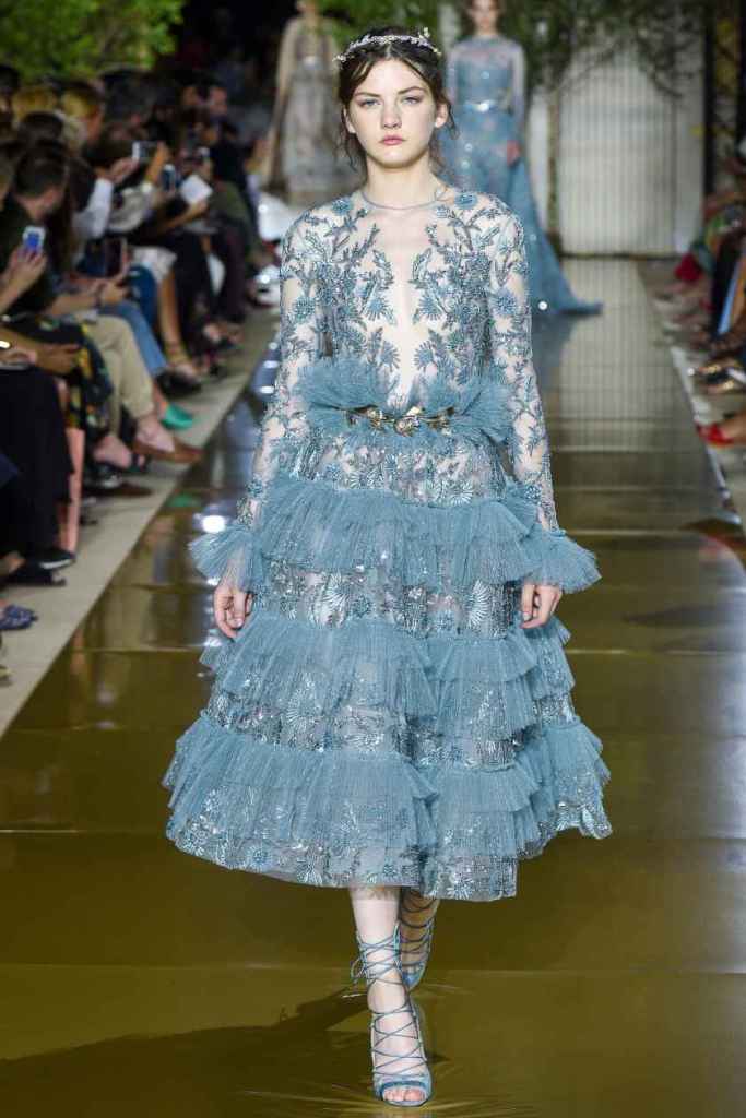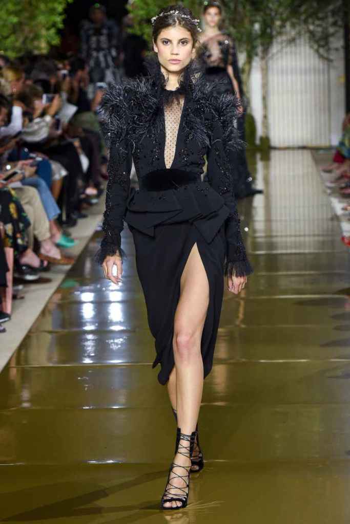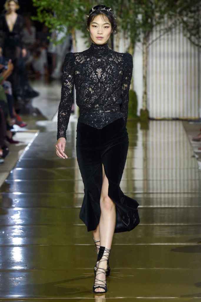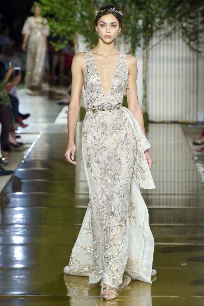 The ethereal gowns in powdery pastels and bold features pay homage to the early 20th-century illustrations by Charles Dana Gibson. His couture pieces capture self-confidence and sophistication – ranging from slashed necklines to plunging backs. Nude illusions, metallic flowers, ostrich feathers, ethereal embellishments and floor-sweeping chiffon trains lead the collection. Starting with black the collection moves to a dreamy pastel palette.