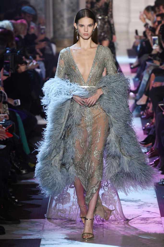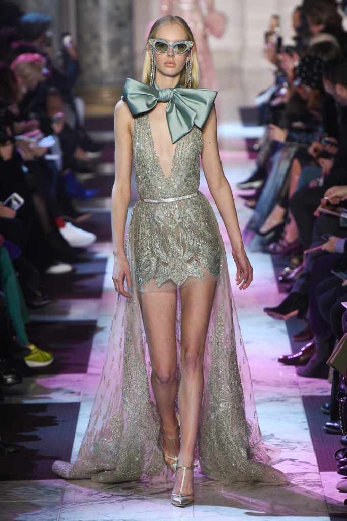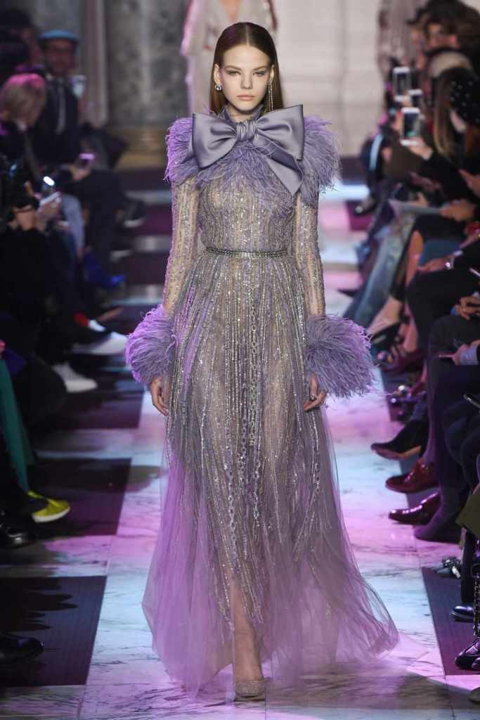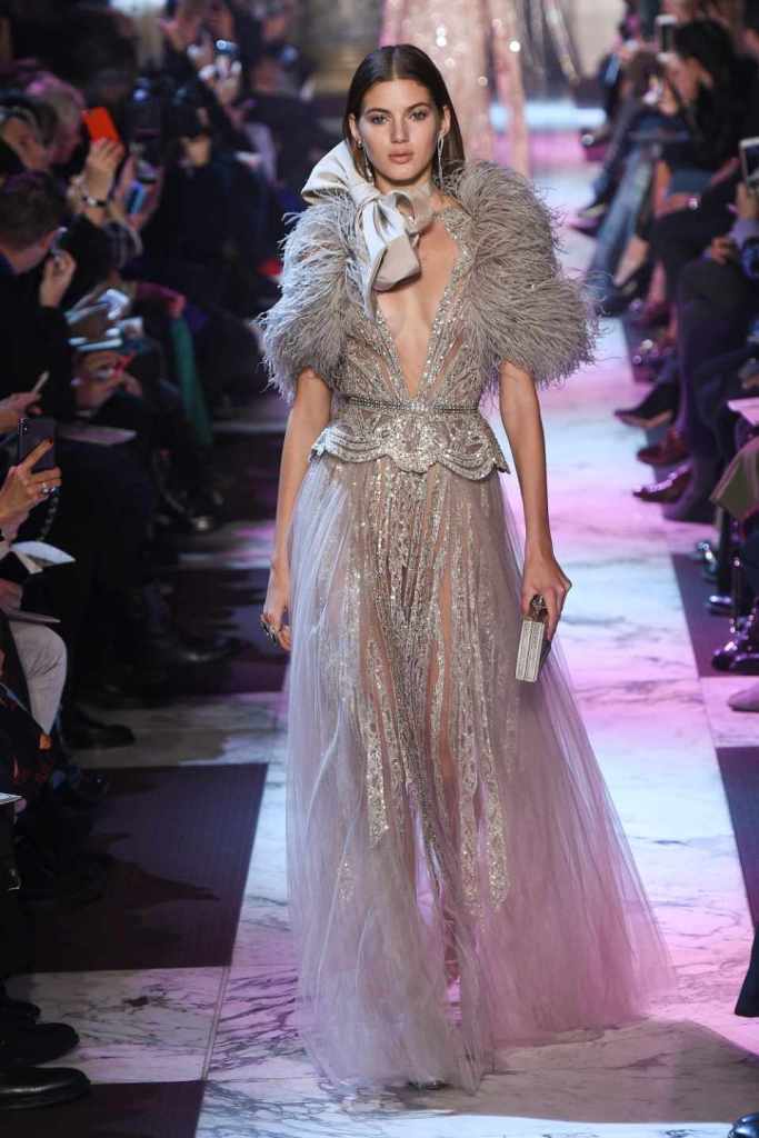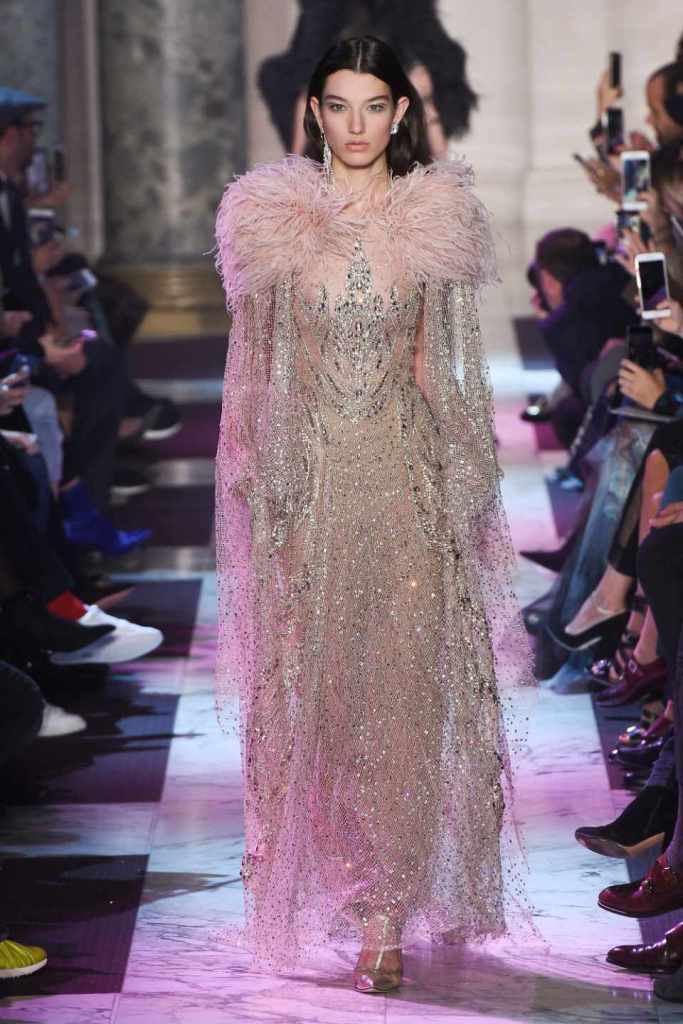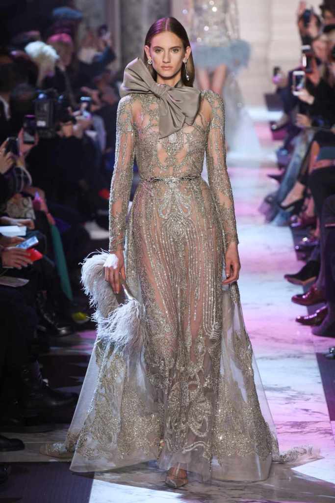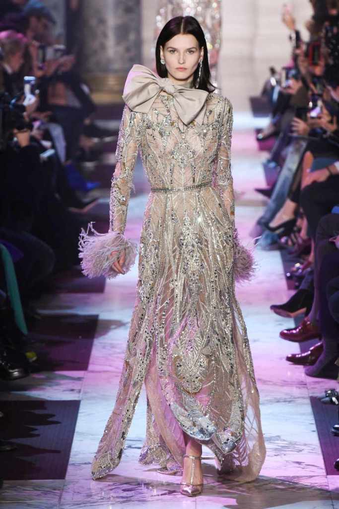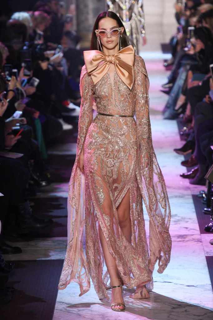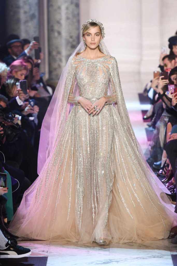 Inspired by the enchanting Paris of the 1920s, these gowns transport us to a sea of vintage glam. With nods to Josephine Baker and Kiki de Montparnasse, the party dresses evoke the spirit of an artistic paradise. Gilded gowns and feathered capes, each dress is adorned with intricate embroideries and dazzling crystals, capturing the essence of a bygone era. The gowns blend vintage flair with modern elements and feature a color palette of champagne, silver, gold, and blue. They are made from silk, satin, tulle, and lace in subdued hues, and are adorned with feathers, beads, bows, and art deco elements such as rhinestones and geometric patterns. Pearl-adorned sunglasses and crystal headpieces add extra glamour.
