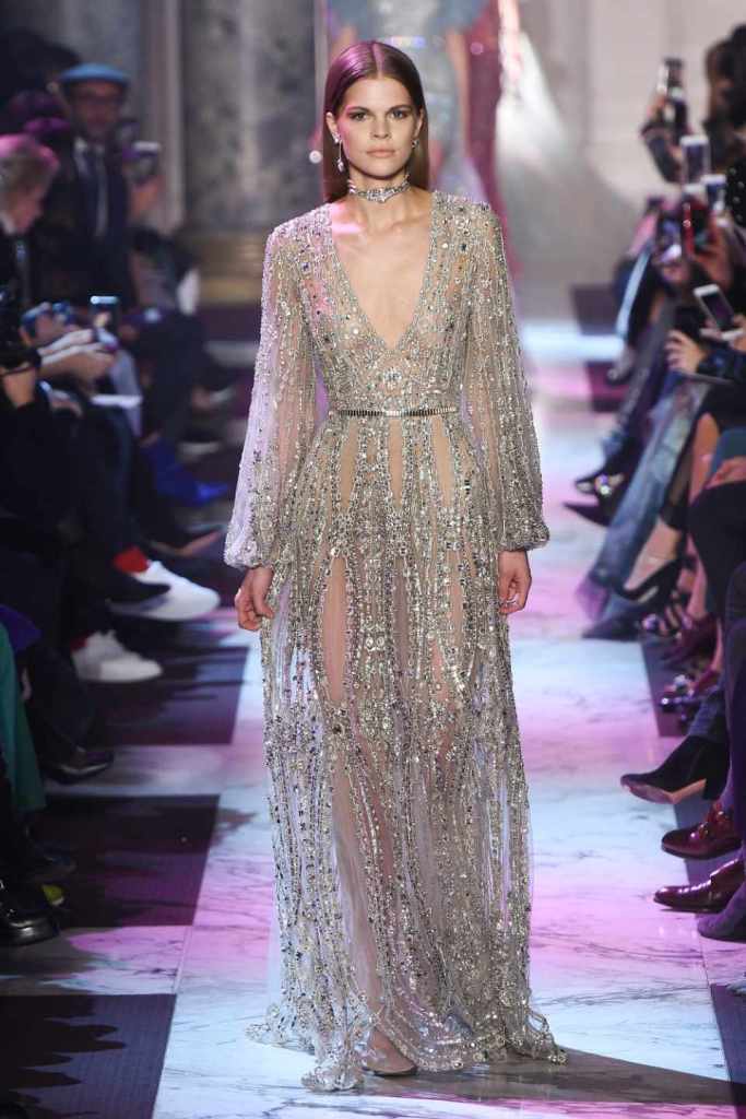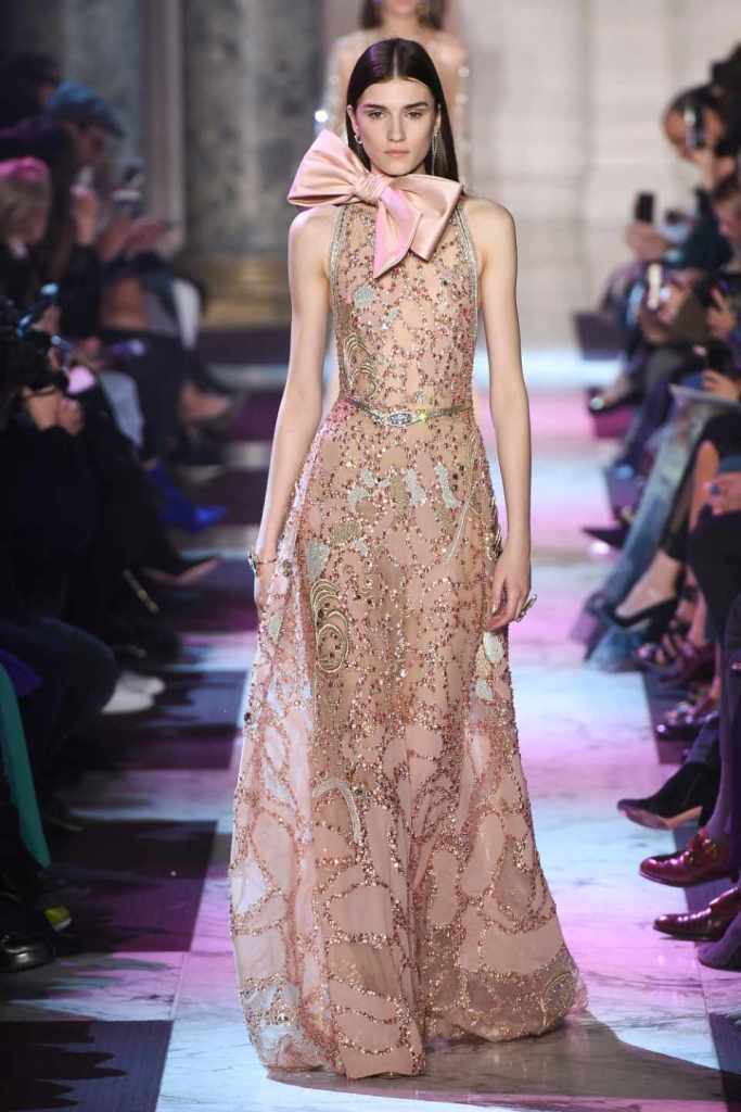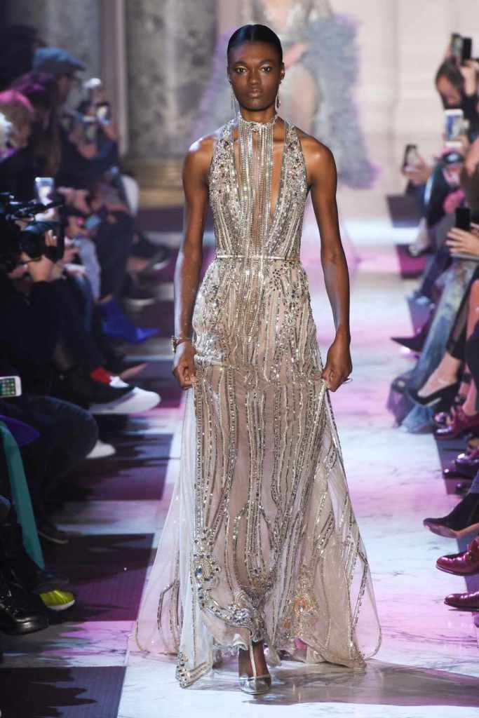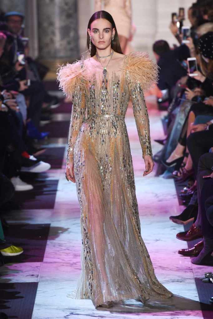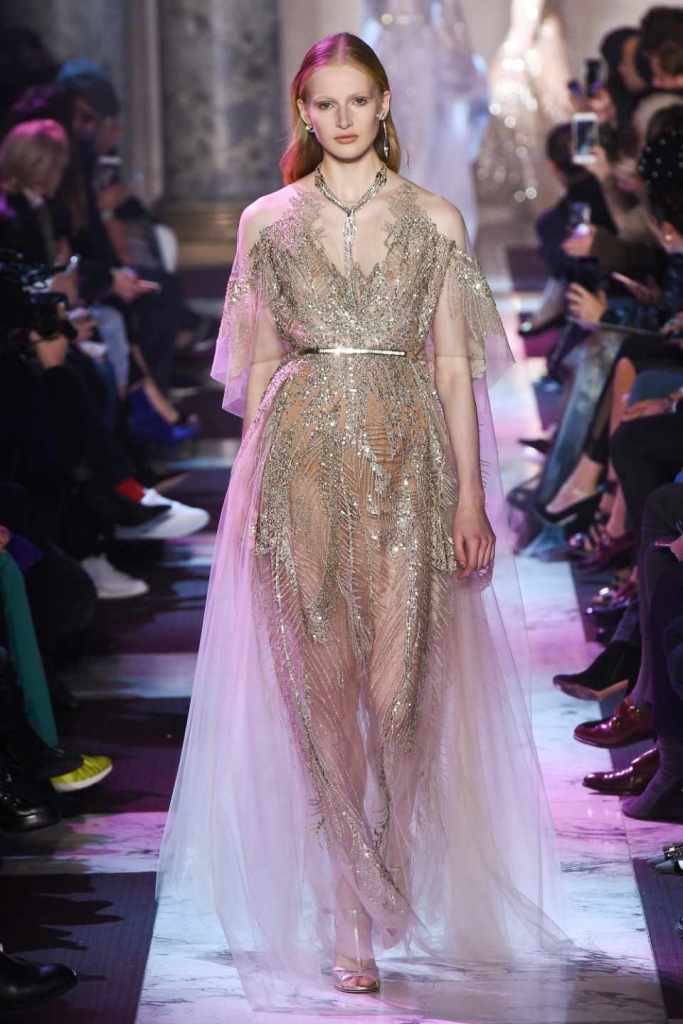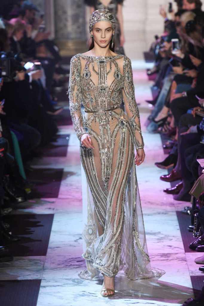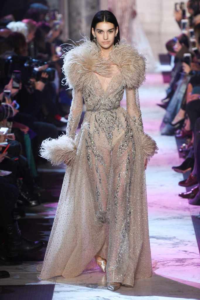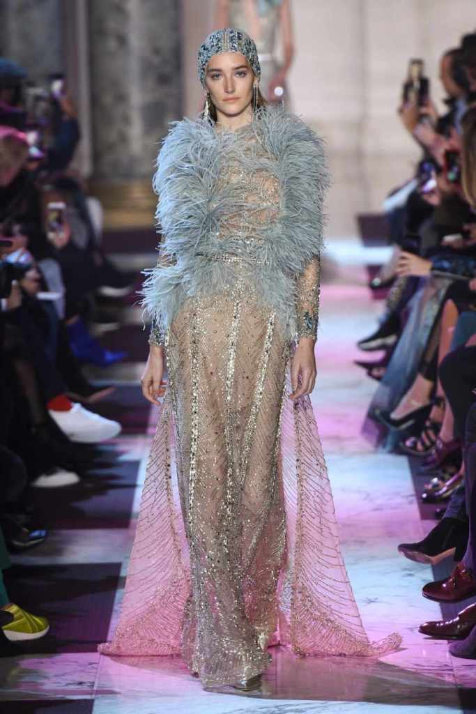 Inspired by the enchanting Paris of the 1920s, these gowns transport us to a sea of vintage glam. With nods to Josephine Baker and Kiki de Montparnasse, the party dresses evoke the spirit of an artistic paradise. Gilded gowns and feathered capes, each dress is adorned with intricate embroideries and dazzling crystals, capturing the essence of a bygone era. The gowns blend vintage flair with modern elements and feature a color palette of champagne, silver, gold, and blue. They are made from silk, satin, tulle, and lace in subdued hues, and are adorned with feathers, beads, bows, and art deco elements such as rhinestones and geometric patterns. Pearl-adorned sunglasses and crystal headpieces add extra glamour.