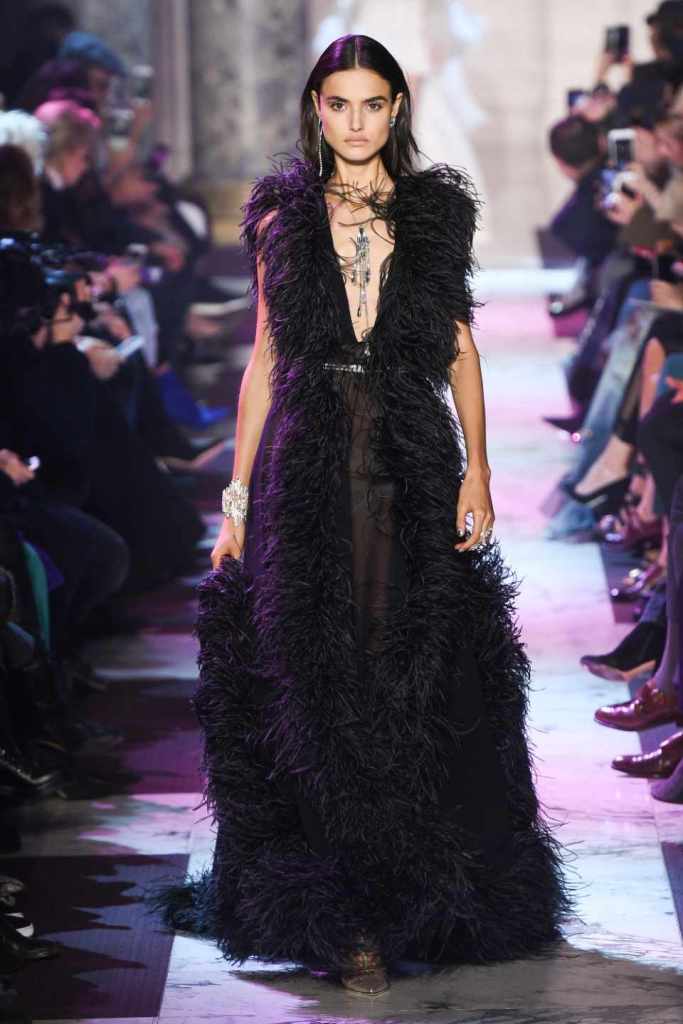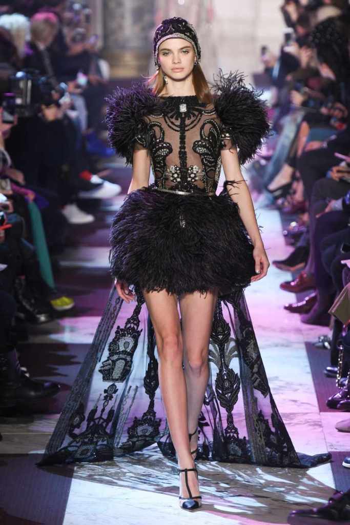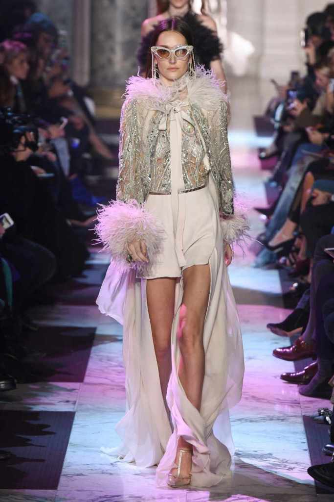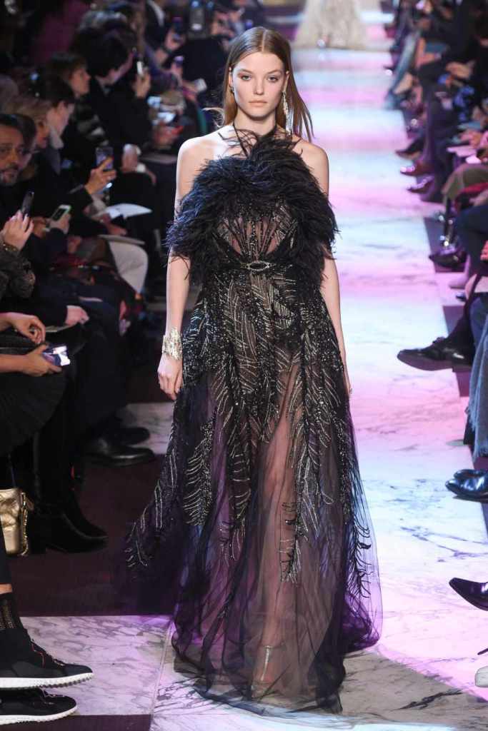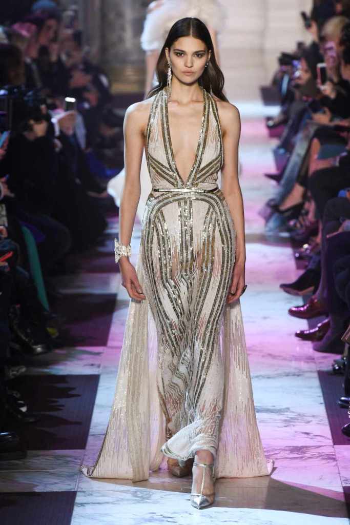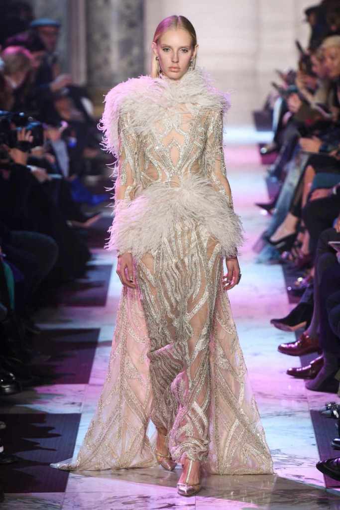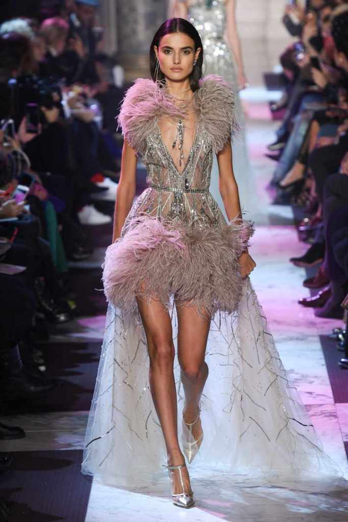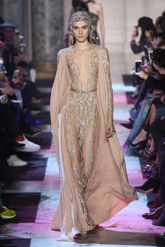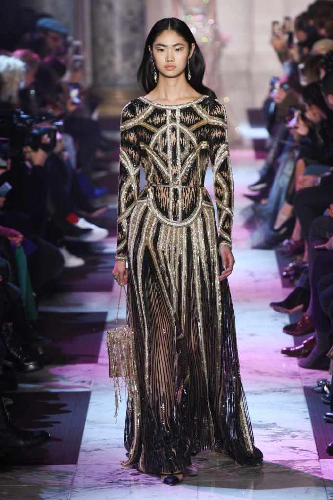 Inspired by the enchanting Paris of the 1920s, these gowns transport us to a sea of vintage glam. With nods to Josephine Baker and Kiki de Montparnasse, the party dresses evoke the spirit of an artistic paradise. Gilded gowns and feathered capes, each dress is adorned with intricate embroideries and dazzling crystals, capturing the essence of a bygone era. The gowns blend vintage flair with modern elements and feature a color palette of champagne, silver, gold, and blue. They are made from silk, satin, tulle, and lace in subdued hues, and are adorned with feathers, beads, bows, and art deco elements such as rhinestones and geometric patterns. Pearl-adorned sunglasses and crystal headpieces add extra glamour.
