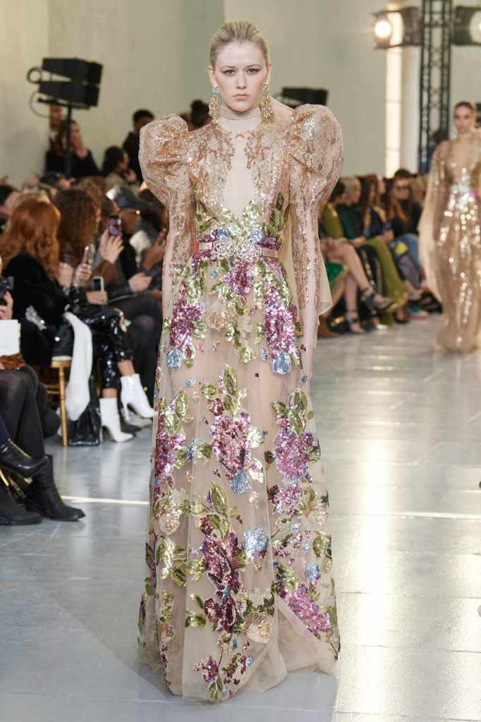 Picture the Chapultepec Castle in Mexico City, the inspirational backdrop for this collection. When inspired by Mexican opulence and the looks were sure to be regal. The colors were magnificent, the details were exquisite and the fabrics were so lush. The shades of pink, blue, and lime gowns were mesmerizing. Not a fan of belts but they worked really well here and the complimenting scarfs were a great addition. The embellishments used to cinch the waist were quite beautiful. The golden shimmer that bathed the collection was a highlight, with intricate details of embroideries, florals, and pearls – Sequins, crystals, and gold thread gild everything. This actually might be my favorite Elie Saab collection!