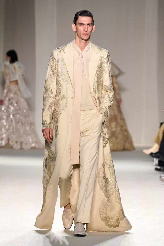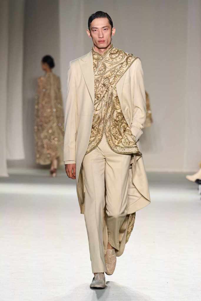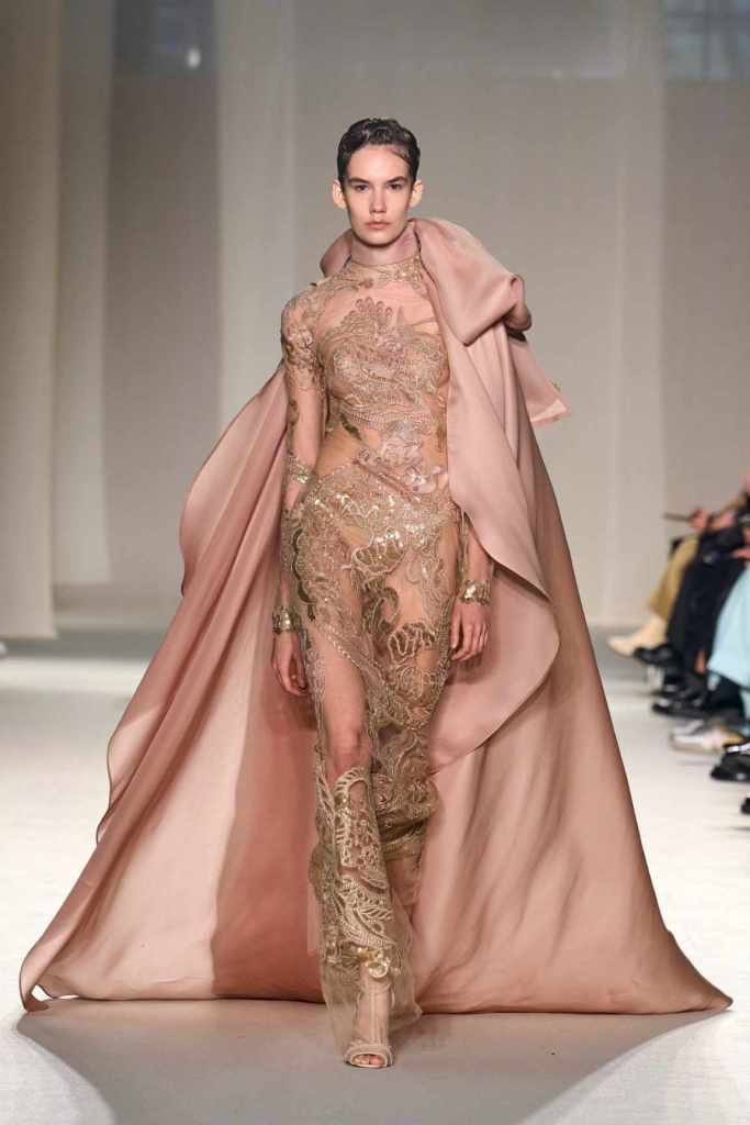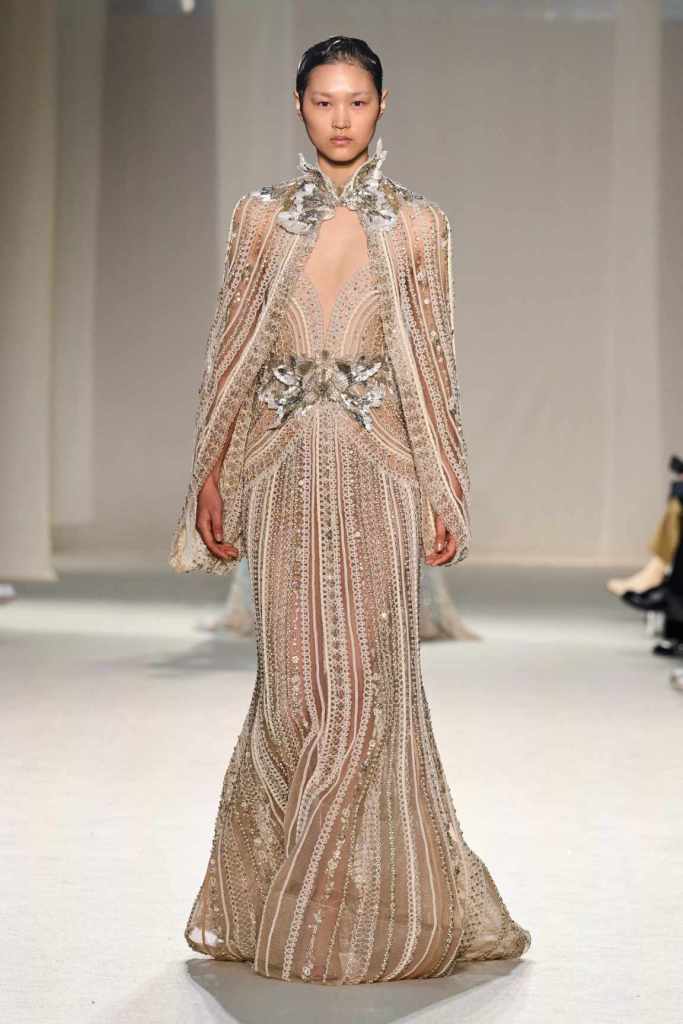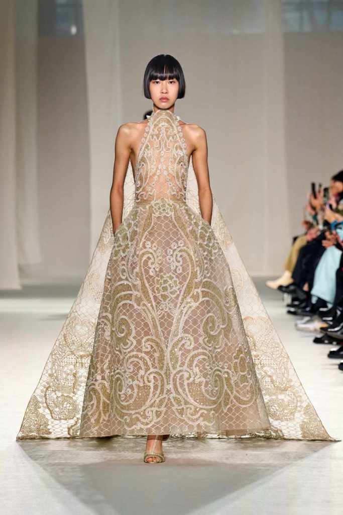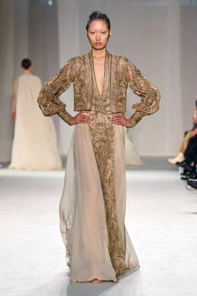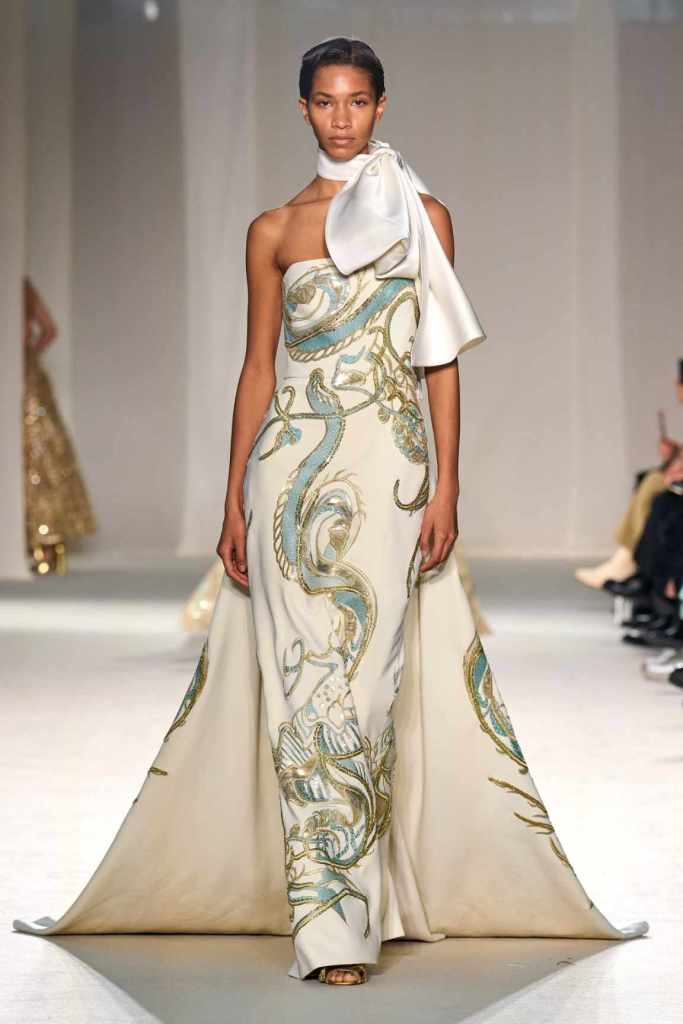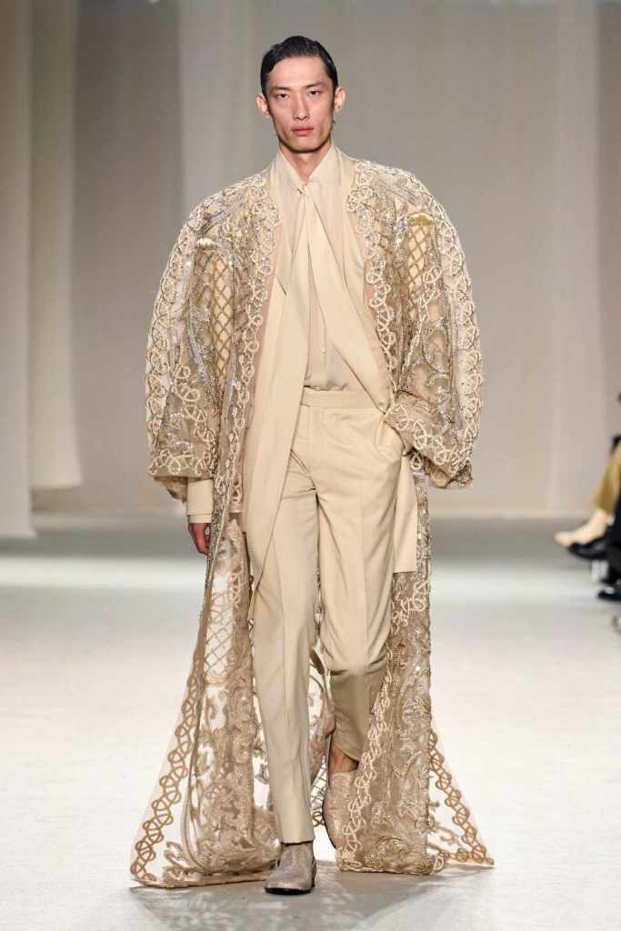 This collection titled “Golden Dawn” celebrates the magnificence of Thailand; Elie Saab is a designer who has a clear vision and knows how to create truly beautiful clothes. The designer has managed to craft a unique & recognizable design USP in a rather traditional fashion aesthetic. There were skin-hugging embellished gowns, sheer majestic gowns, regal capes, asymmetrical cutouts and endearing cocktail dresses. These looks were decorated with intricate necklines, detailed embellishments, striking appliqués and some breezy neck scarfs. I can’t talk about this collection without mentioning the sublime men’s couture; neatly tailored and sumptuously decorated.