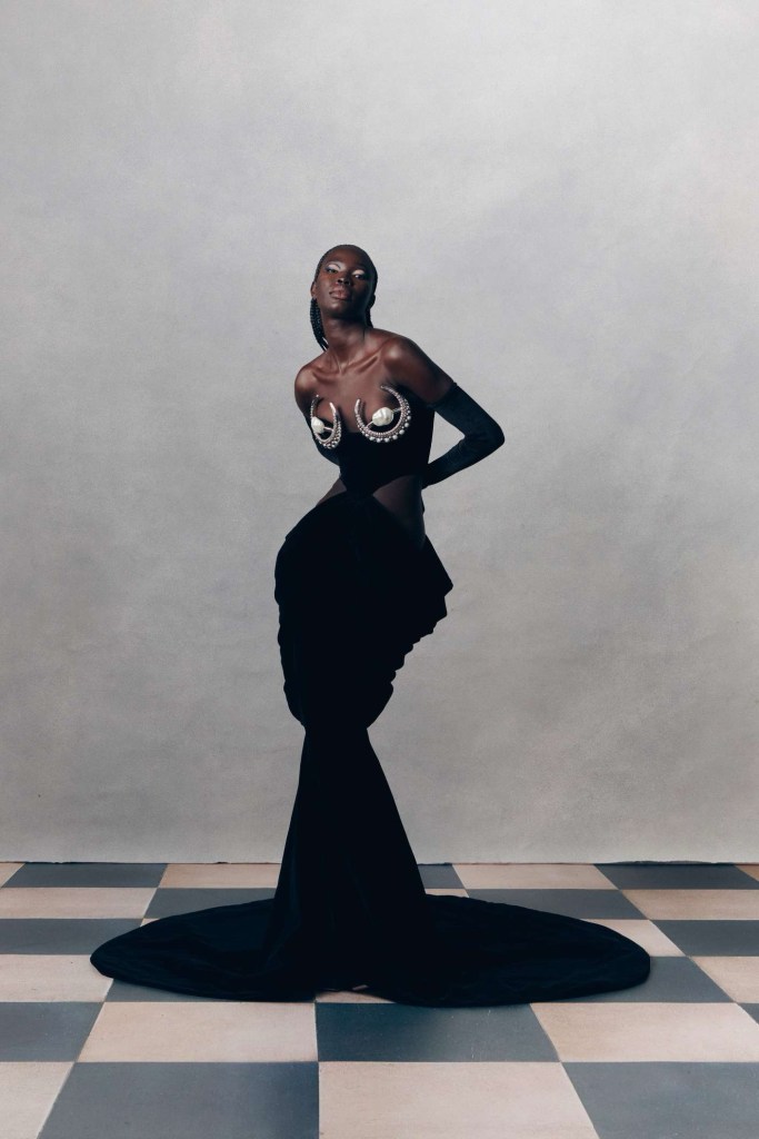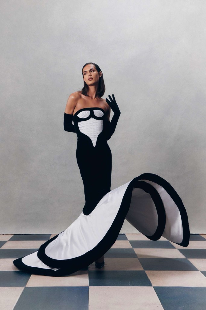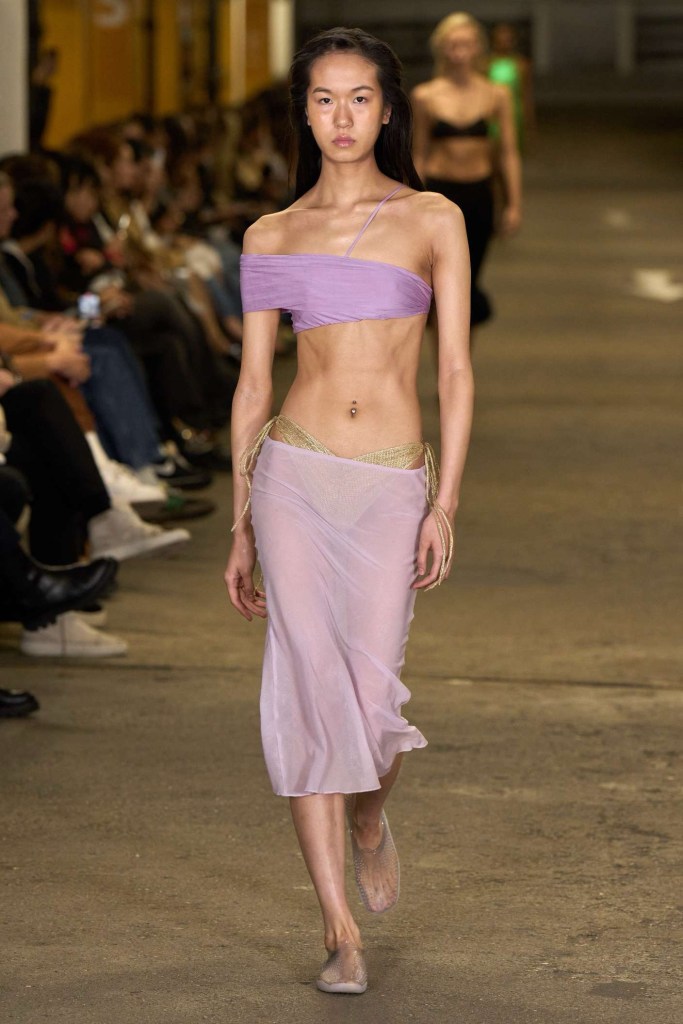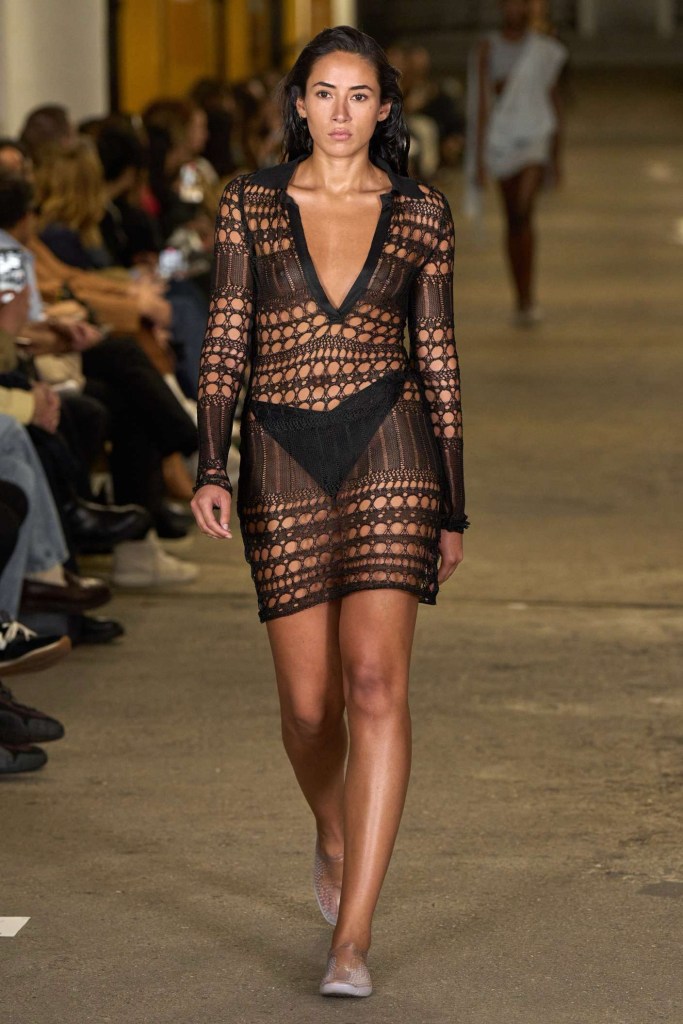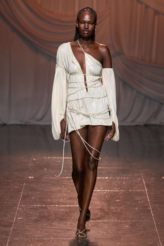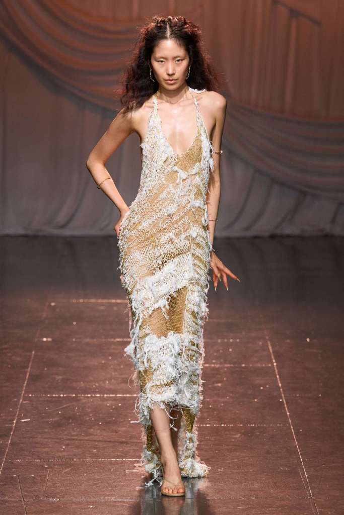 Di Petsa: For ‘Reflections of Venus’ Di Petsa embraced Venus-inspired themes featuring wet illusion dresses and expanding into wet look swimsuits and intricate embellishments, hinting at her evolving creativity. Abundant gold, hand-knitted minidresses, cut-out dresses and pregnancy symbols adorn this collection, delving into breaking, healing and self-discovery. She seamlessly integrates new styles into her signature aesthetic, offering a refreshing take on sexy wet looks. Her Greek heritage remains a wellspring of inspiration, and this season’s focus on unconditional love draws from the birth of Venus, reflecting the enduring connection to her homeland.