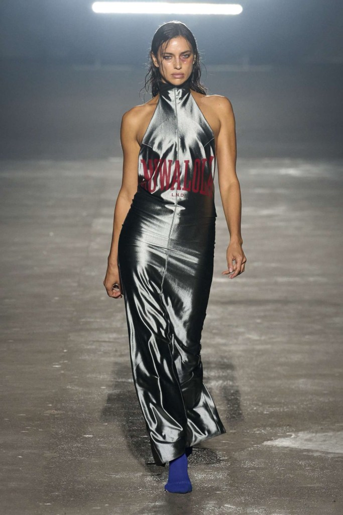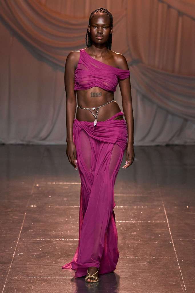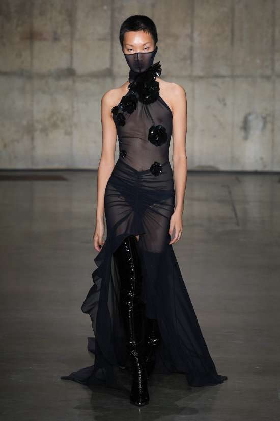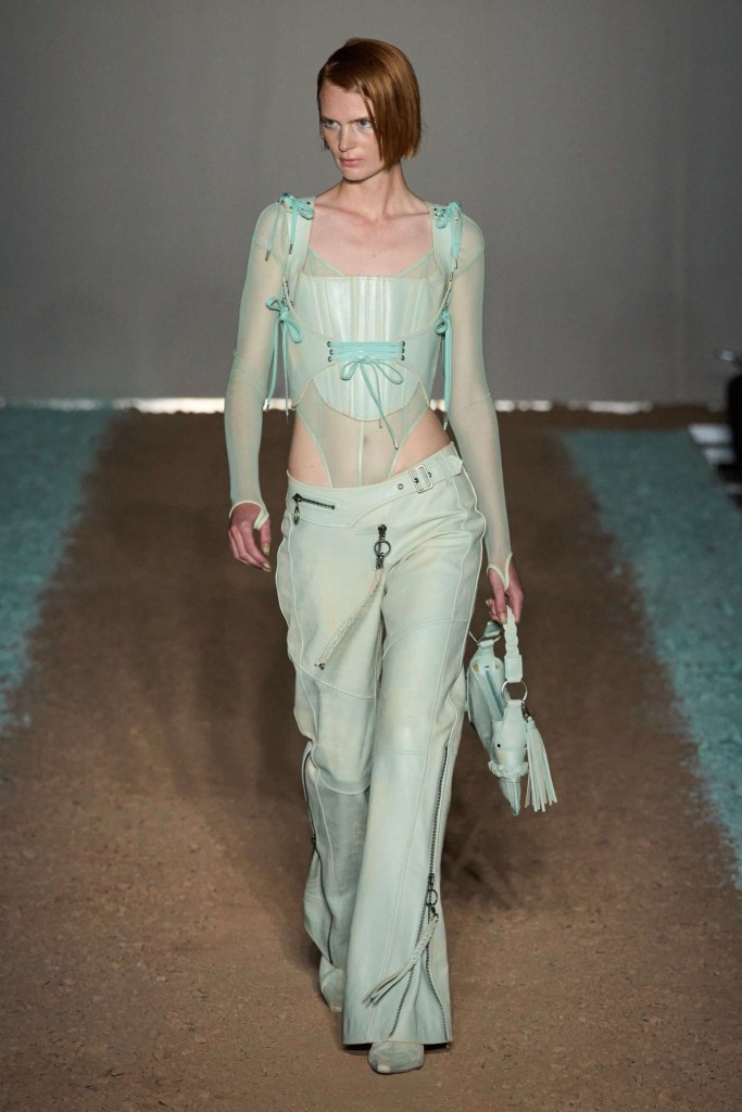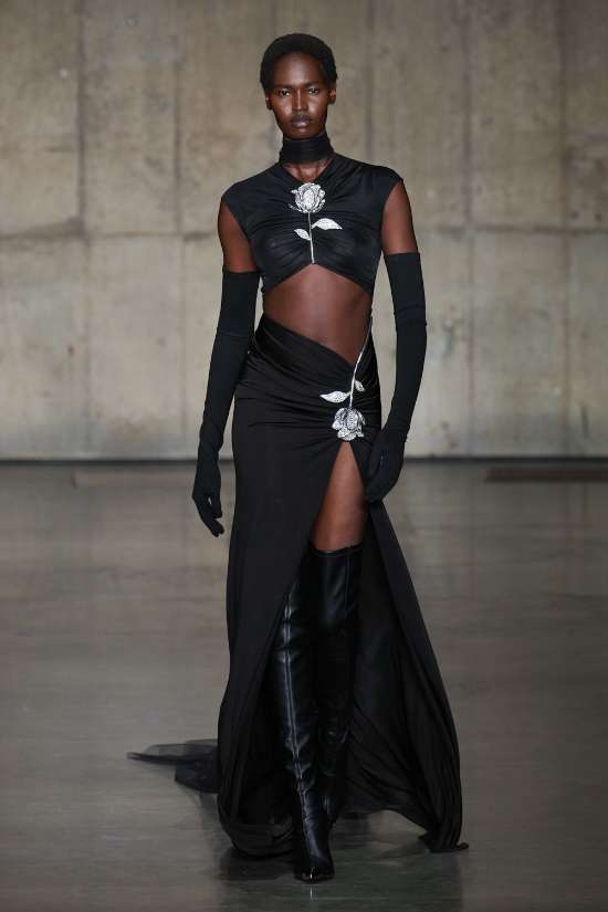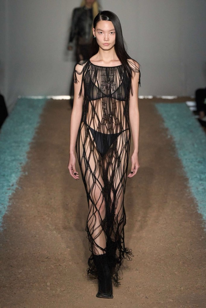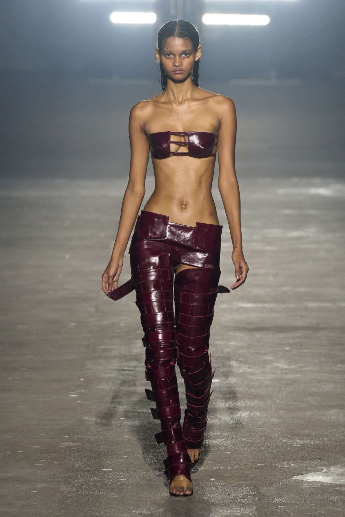 Knwls: Knwls maintains their signature style, but this time, it’s all about subtlety. The color palette is more restrained, and they’ve skillfully blended heavy and soft textures. The clever styling choices truly stand out in this collection. From sheer pieces to powerful jackets, soft corseted tops to skimpy bra tops, and low-slung jeans to figure-hugging gowns, it’s a diverse mix that caters to various tastes. But my absolute favorite has to be those massive thigh-high boots. It’s got a dash of streetwear coolness mixed with a whole lot of sexiness. This collection is perfect for those looking to make a statement without going overboard. The duo’s cohesive aesthetic exudes a refined yet raw and sexy energy capturing a primal essence that resonates with their audience.