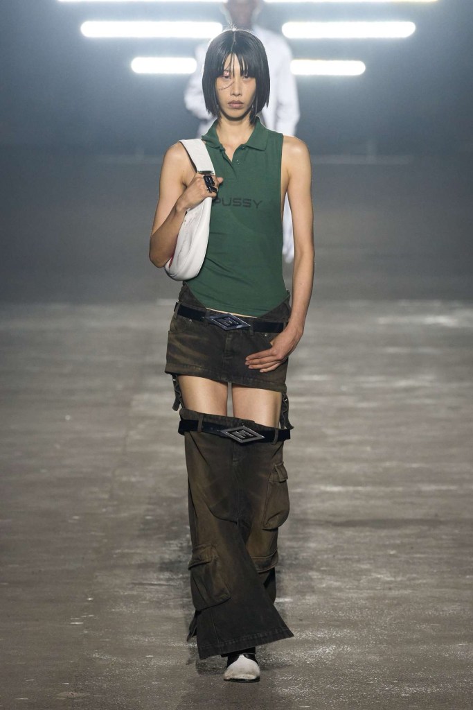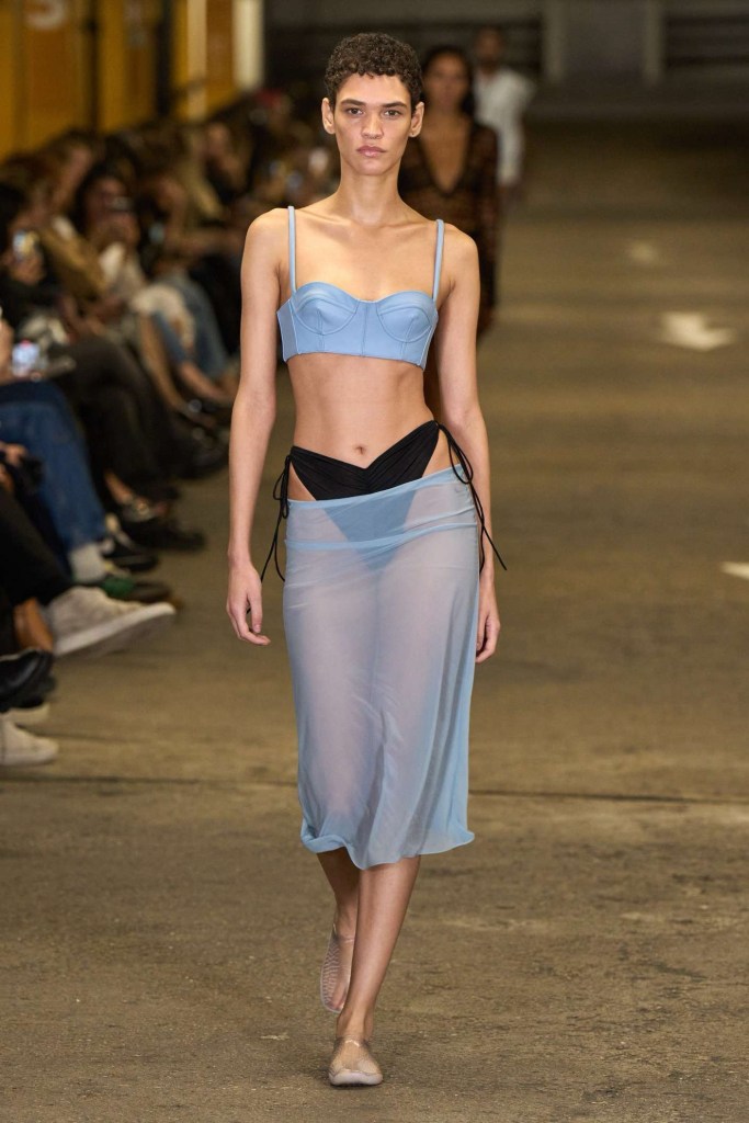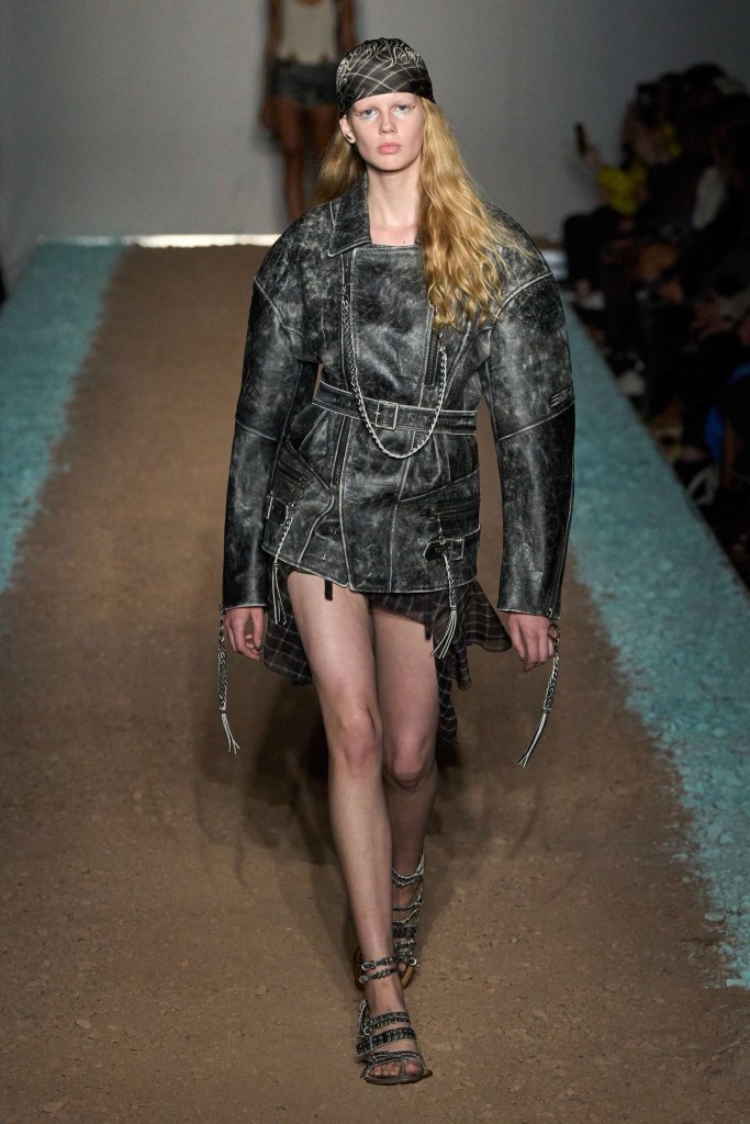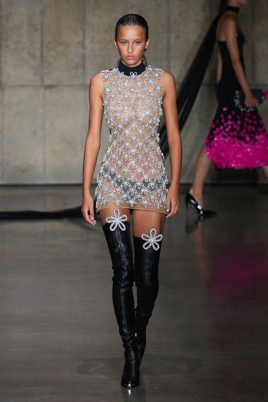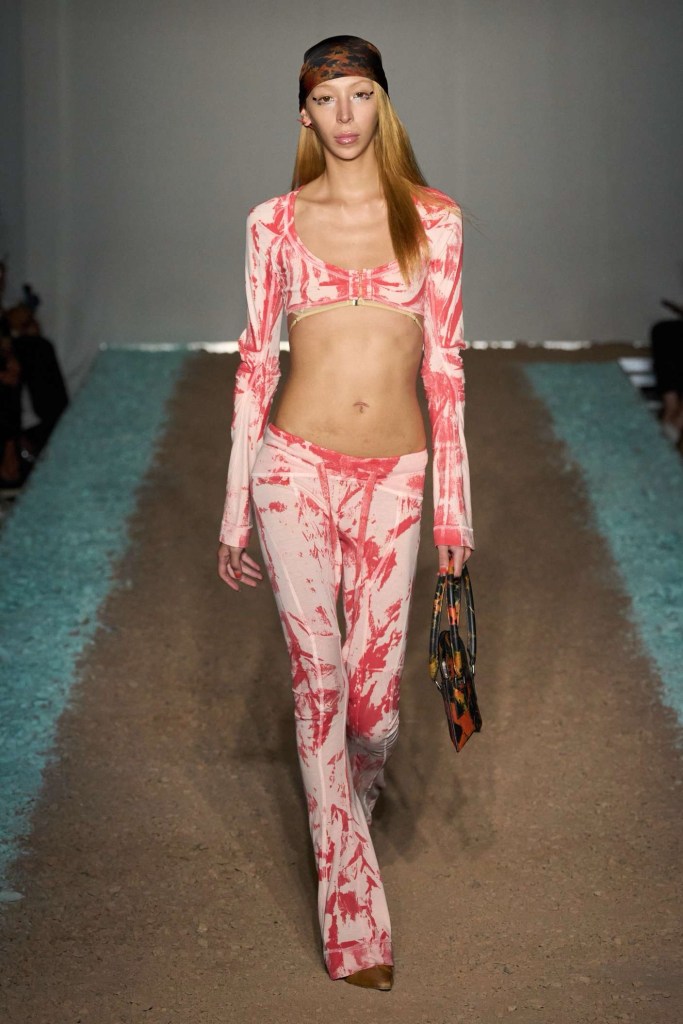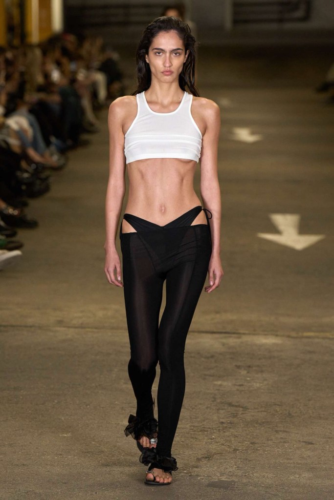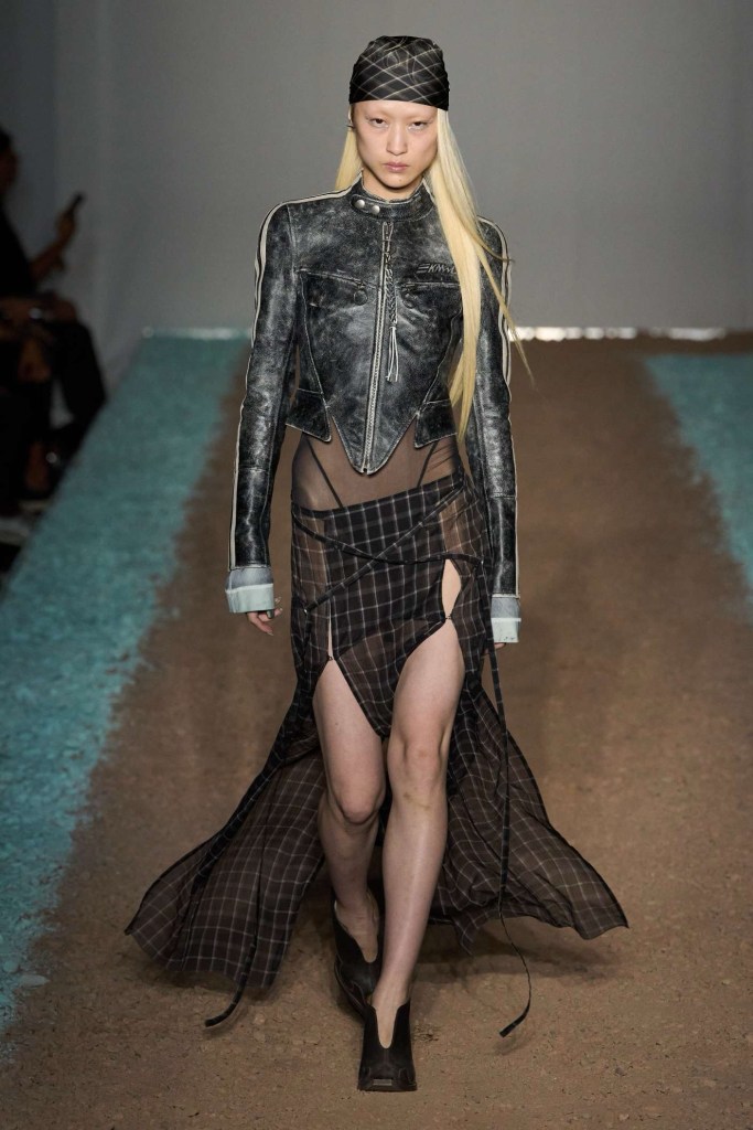 Knwls: Knwls maintains their signature style, but this time, it’s all about subtlety. The color palette is more restrained, and they’ve skillfully blended heavy and soft textures. The clever styling choices truly stand out in this collection. From sheer pieces to powerful jackets, soft corseted tops to skimpy bra tops, and low-slung jeans to figure-hugging gowns, it’s a diverse mix that caters to various tastes. But my absolute favorite has to be those massive thigh-high boots. It’s got a dash of streetwear coolness mixed with a whole lot of sexiness. This collection is perfect for those looking to make a statement without going overboard. The duo’s cohesive aesthetic exudes a refined yet raw and sexy energy capturing a primal essence that resonates with their audience.