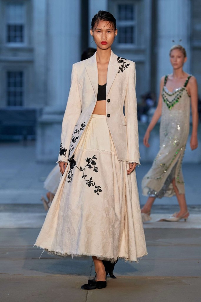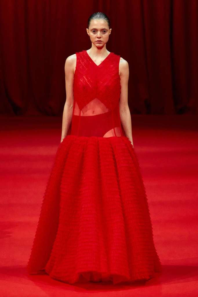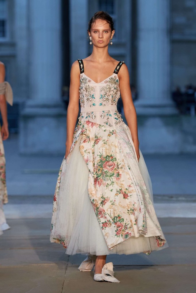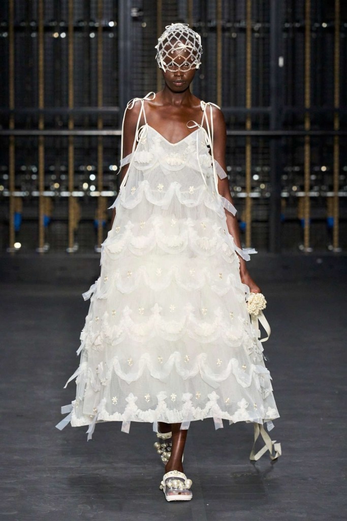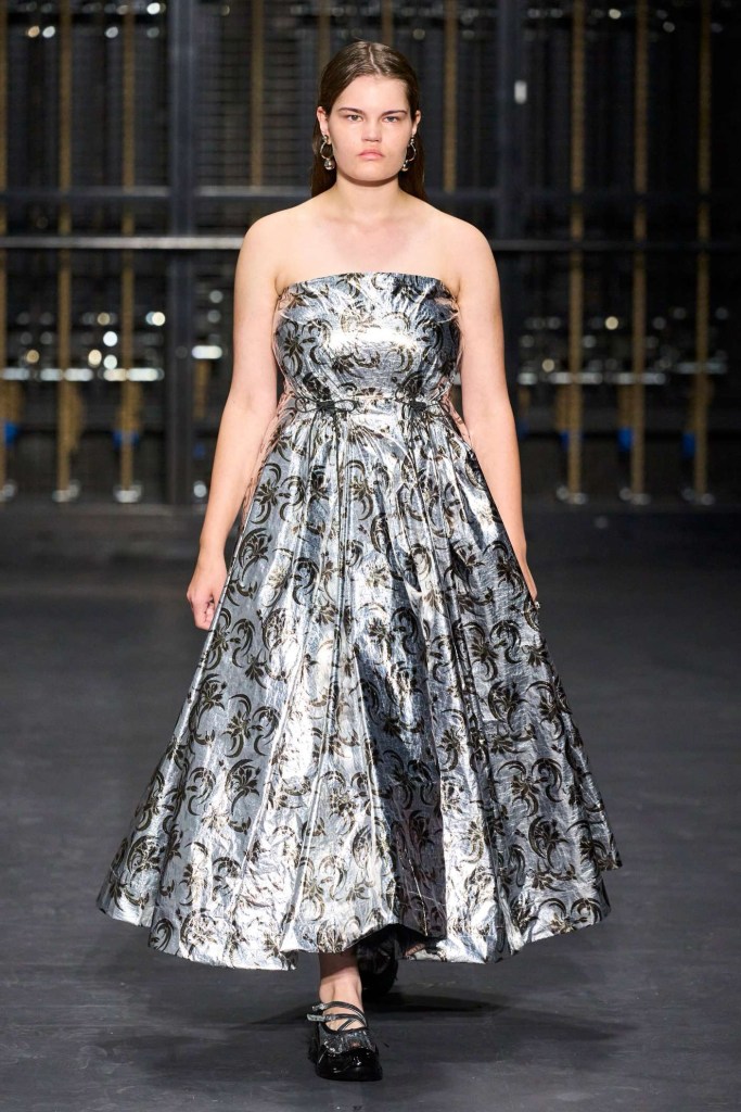 Richard Quinn: This stunning showcase was a heartfelt tribute to his late father, Patrick. While grief often shrouds creativity, Quinn’s collection artfully transformed sorrow into an ethereal celebration. The eveningwear in this collection was nothing short of gorgeous. Dramatic silhouettes took center stage, featuring flowy capes, Dior-esque cage minidresses, and impeccably structured gowns. Opulent details adorned every piece, from intricate embroideries to lavish embellishments. Fans of Quinn’s signature maximalist floral prints won’t be disappointed either; they made a quick appearance. The overall effect was a line of couture-like creations, leaving us in awe of this beautifully crafted, emotionally fulfilling show.