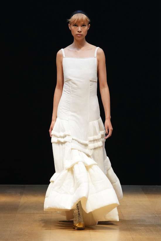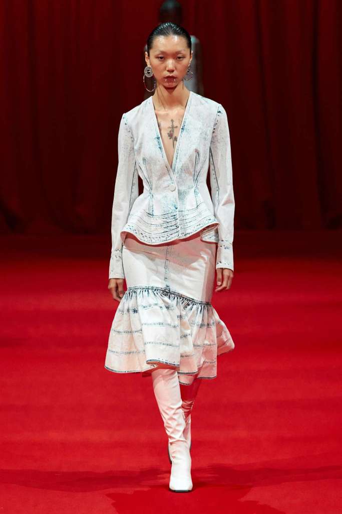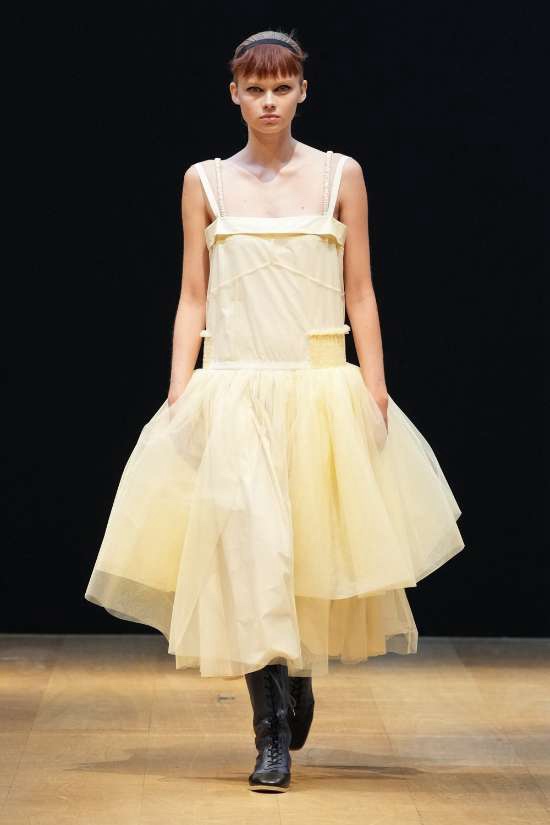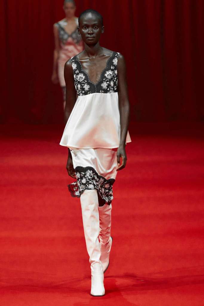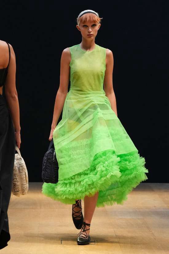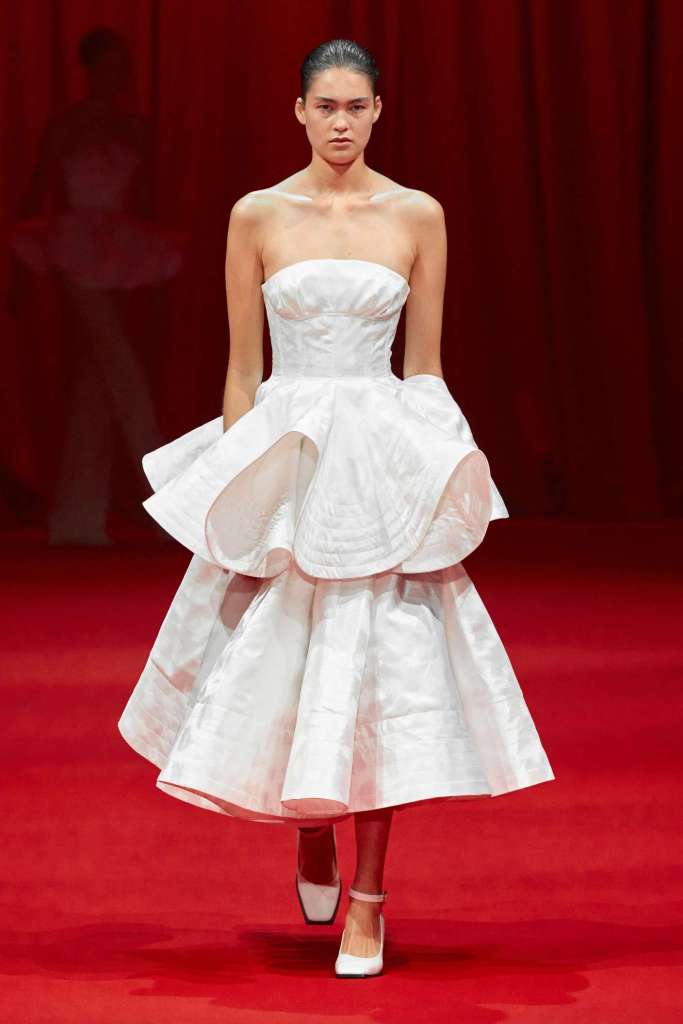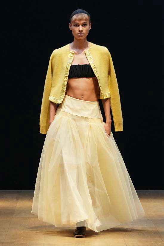 Molly Goddard: Inspired by vintage underwear and flipped garments, it’s unapologetically feminine and beautiful. Goddard’s genius lies in the details, with thoughtful frills and ruffles adorning her creations. What struck me the most was how the clothes managed to be both statement-making and intimate, all while embracing an understated elegance via a neutral color palette. Her signature element, tulle, was subtly subverted, adding a delightful twist to the collection. From bustier-style tops to barely-there bralettes, lightweight cardigans to ruffled skirts, drop-waist midis to voluminous tulle dresses, every piece carried an old-school charm. This is undoubtedly Molly Goddard’s best collection in recent memory – a neatly curated, beautiful showcase of her talent.