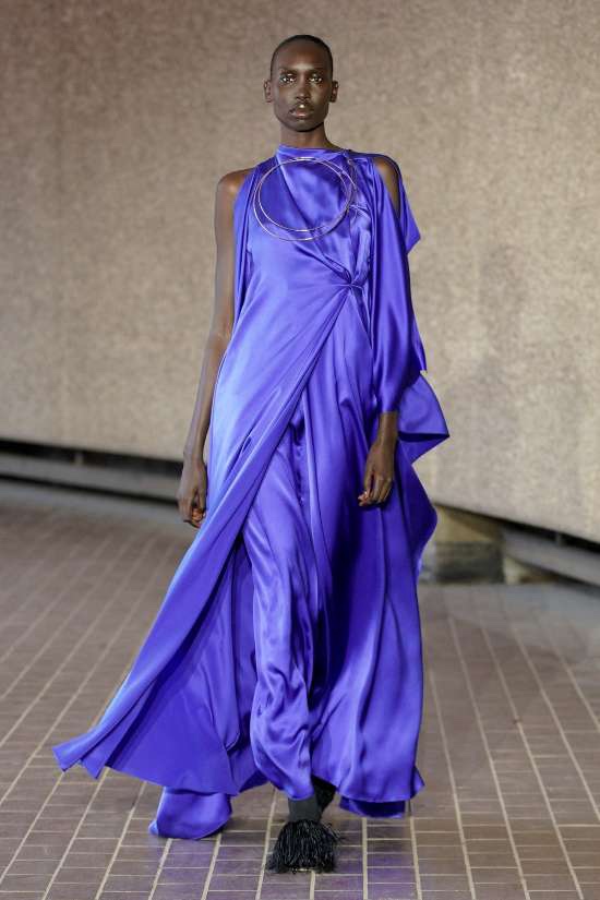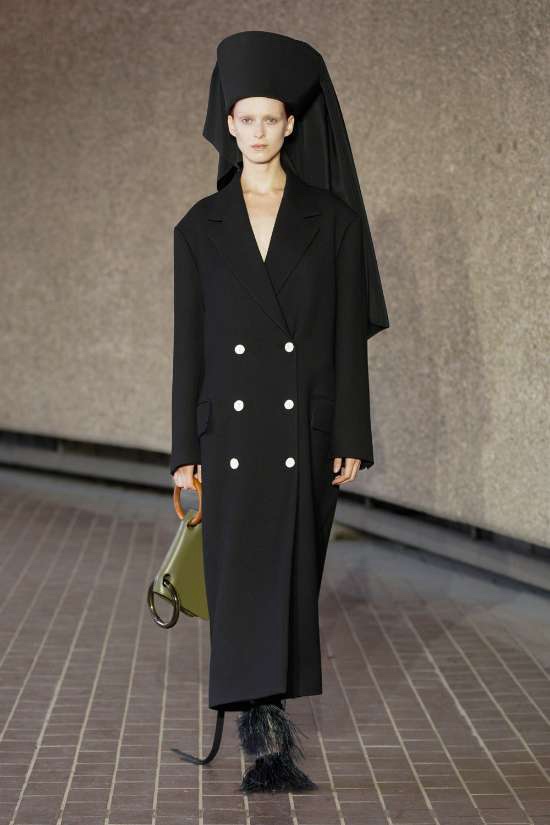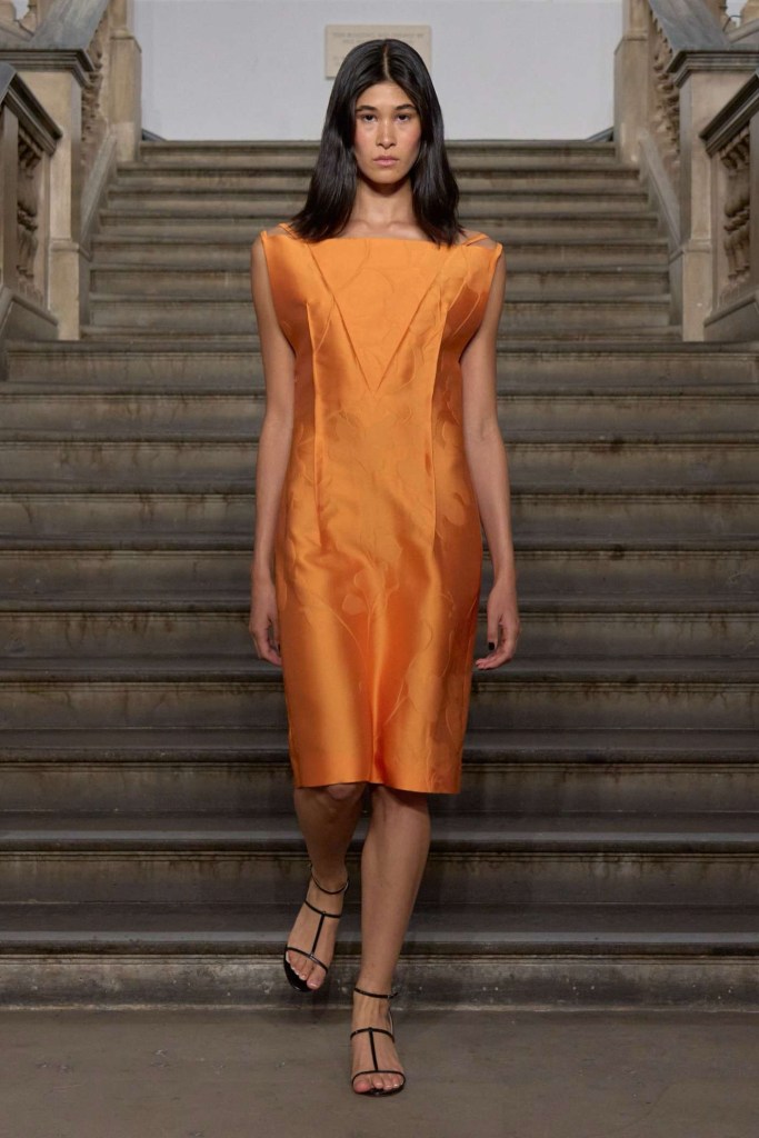 Roksanda: This Roksanda collection is a captivating blend of powerful and spiritually feminine fashion. Drawing inspiration from orthodox priests’ robes, frescoes and hats, the pieces exude a compelling aura. The collection takes a bold approach to color, skillfully contrasting vibrant eye-catching shades with sharp blacks and soft neutrals, creating a striking visual contrast. What truly sets this collection apart are the dramatic voluminous shapes that dominate the runway. From flowing satin draped gowns in bold hues to impeccably tailored suits and coats adorned with draped headpieces, Roksanda effortlessly marries tradition with modernity. The result is a softer mature glamour.