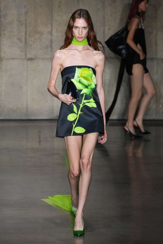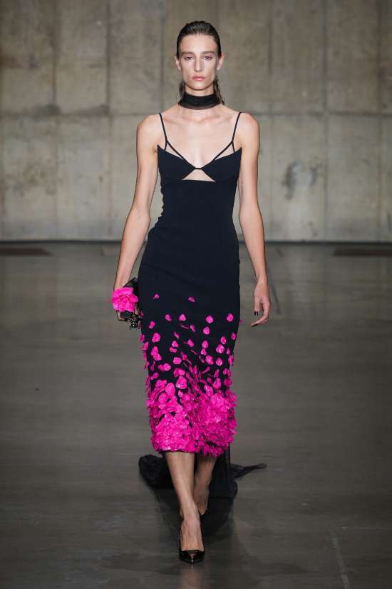 David Koma: True to form, David Koma delivers a shiny and sexy collection; He proves that crafting ultra-chic, sexy ensembles is his forte. This season, Koma drew inspiration from Queen Elizabeth II, embracing her affinity for vibrant botanical colors and floral motifs. Amidst an otherwise black canvas, the collection showcases bursts of delicious green, lavender, and orange, evoking a playful contrast. The rose takes center stage as Koma masterfully blends romanticism with sensuality. Koma’s signature hyperfeminine style retains its edge, resulting in an ensemble of irresistibly seductive garments.