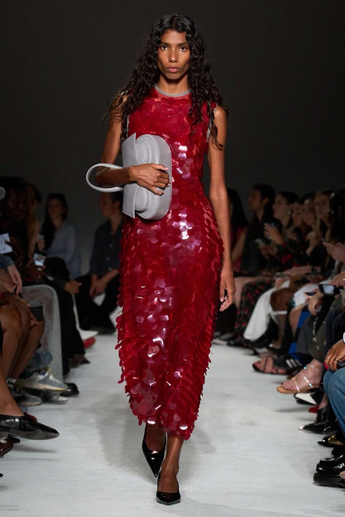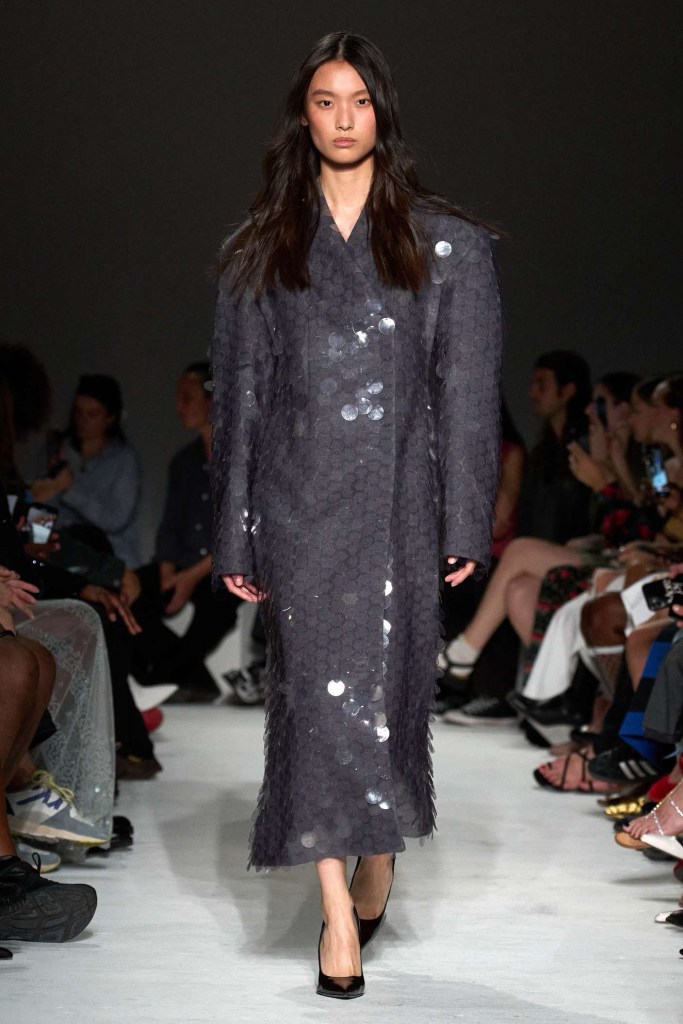 16arlington: This 16Arlington collection masterfully played on David Lynch’s 1997 film, “Lost Highway,” weaving elements of intrigue and seduction into its designs. The collection seamlessly blended relaxed styling with sharp tailoring, creating intriguing silhouettes that exuded sophistication and sensuality. One standout feature was the generous use of big paillettes, which dominated the collection and added a touch of glamour to slit skirts, tank tops, and a splendid trench coat. These eye-catching embellishments brought a playful yet practical element to the outfits. It was a cohesive and captivating fusion of sex and substance.