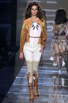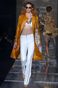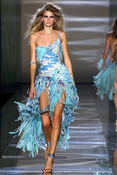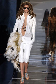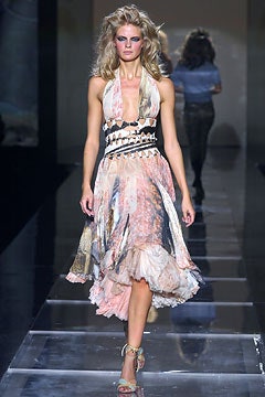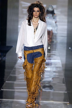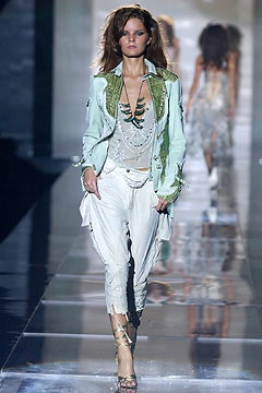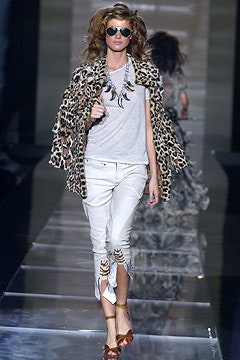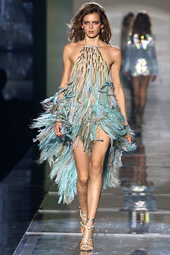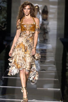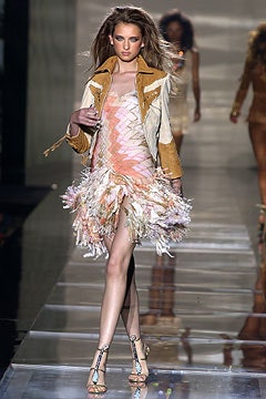 This collection undoubtedly stands as a testament to Roberto Cavalli’s iconic era of fierce fashion. The runway witnessed dangerously powerful walks, exuding a magnetic confidence that harked back to a time when the models were audacious. The collection embraced dramatic elements in true early 2000s fashion, with bold prints, exotic fabrics, vibrant colors, and unmistakable flair. His designs ranged from sexy chiffon prints and raunchy rodeo-inspired outfits to extra short satin dresses and feathered eveningwear.