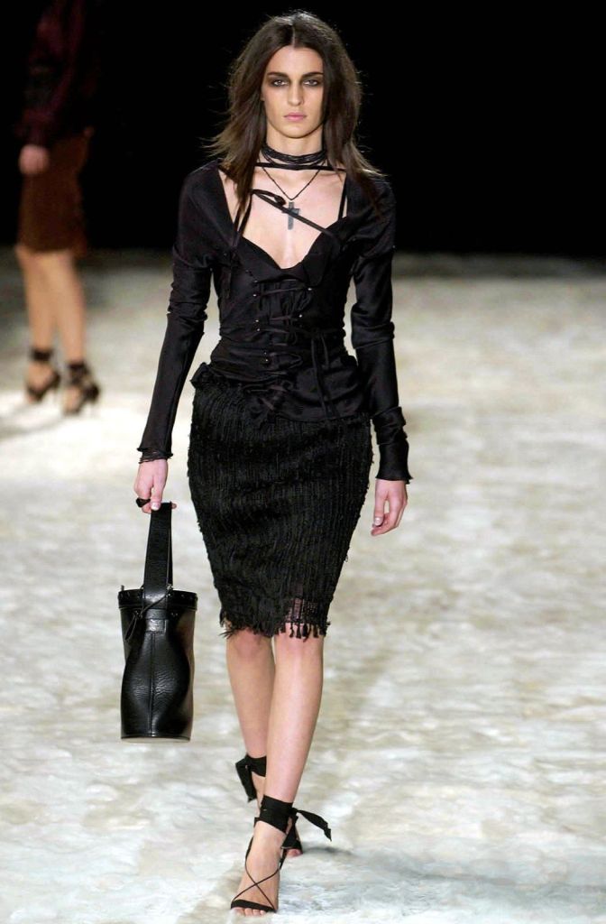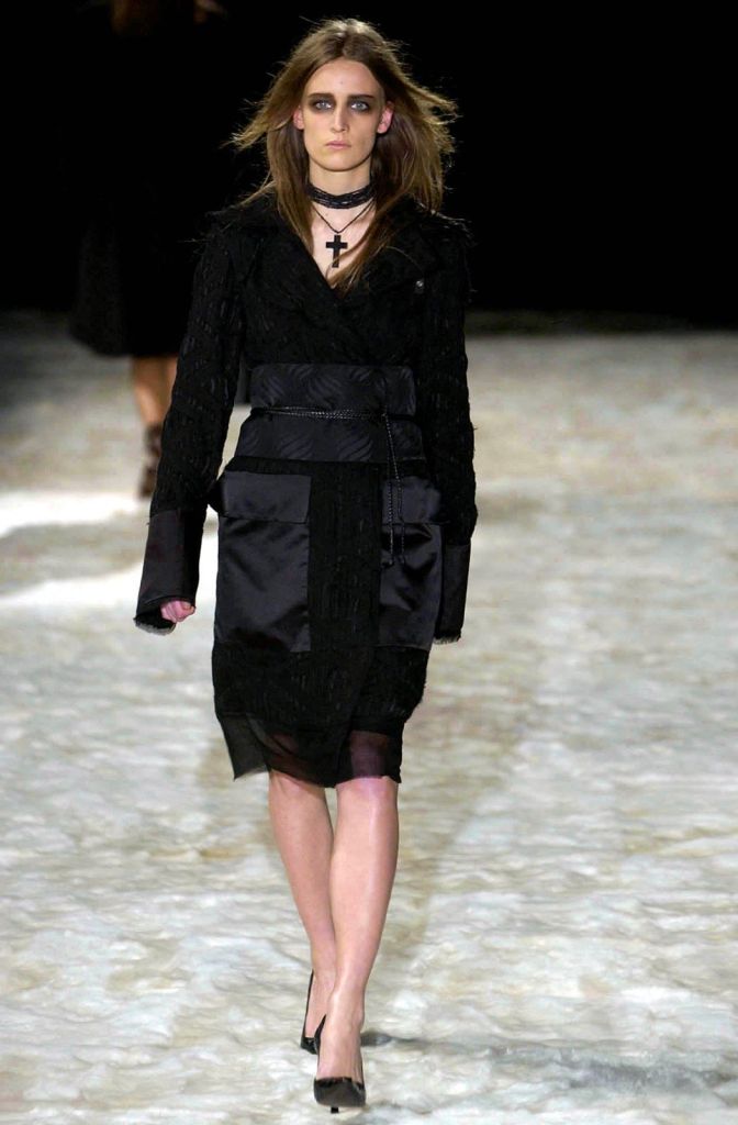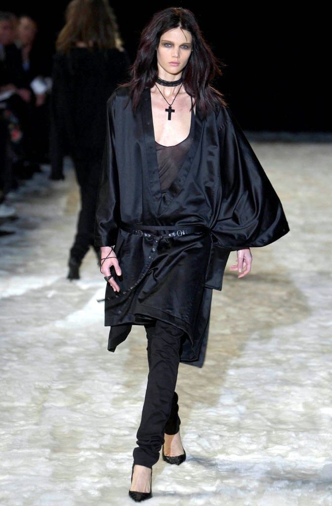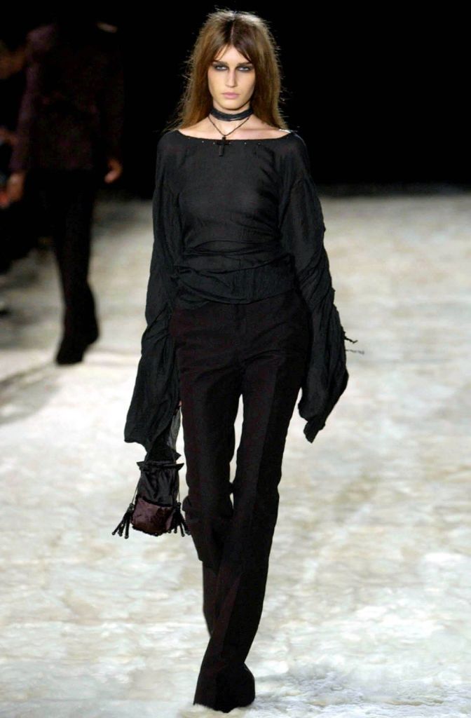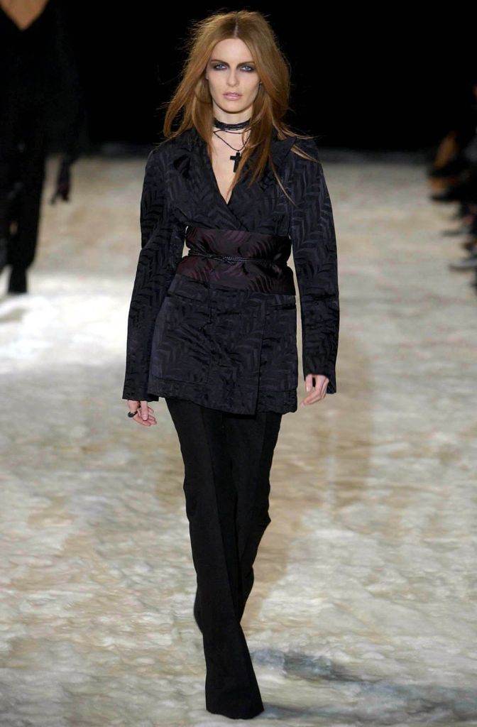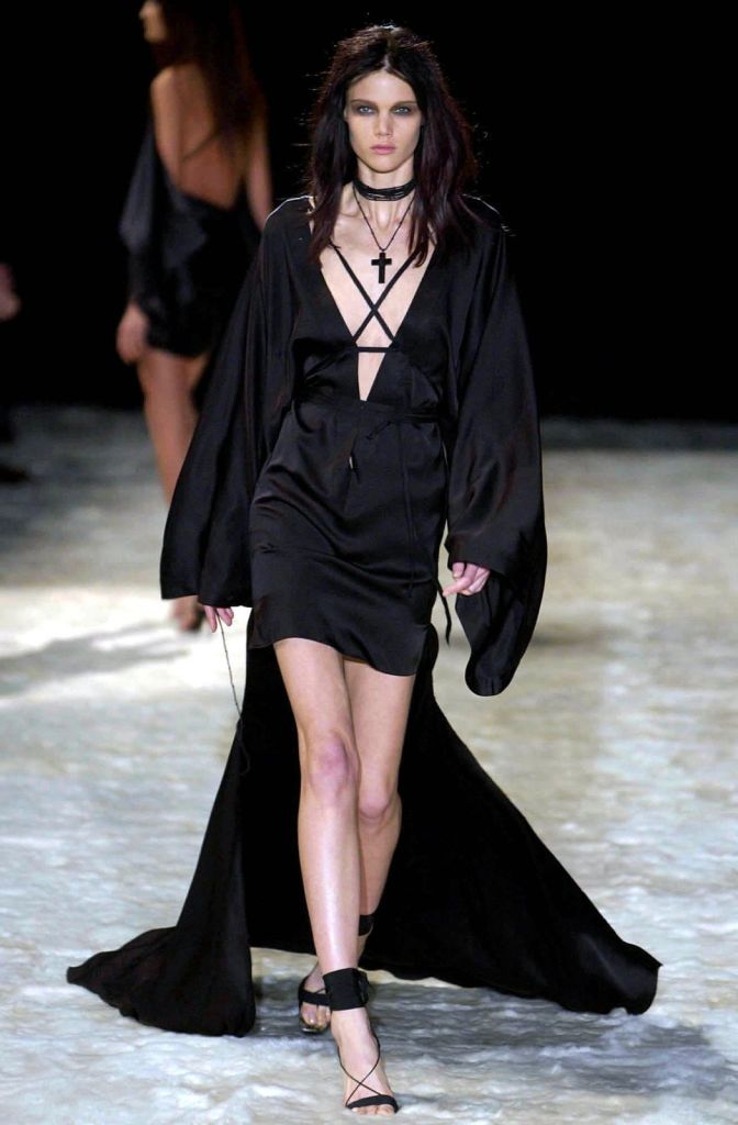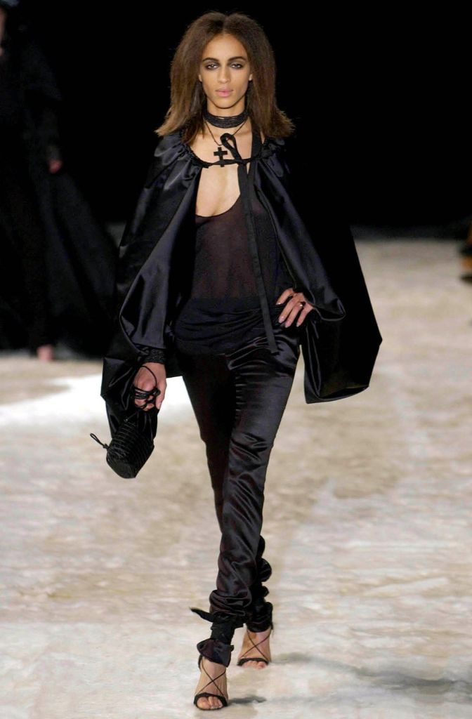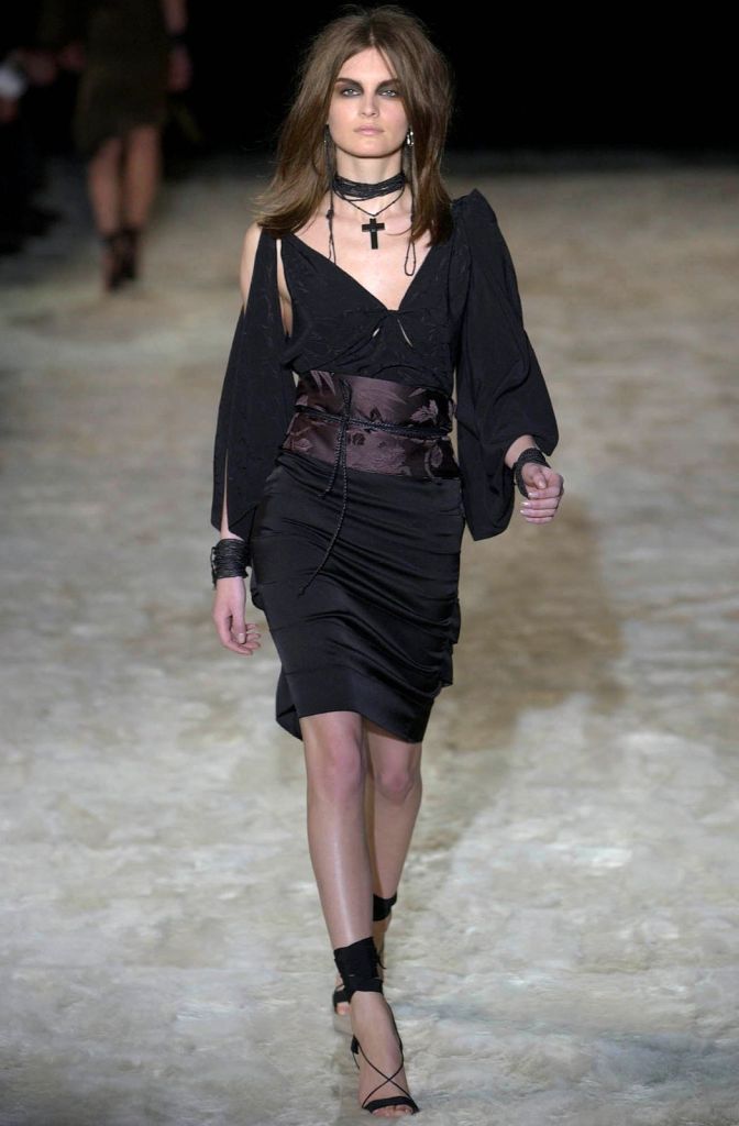 This collection is an exploration of all-black ensembles, exuding a potent blend of dark rock and roll and gothic energy. The collection offers a range of ultra-glam clothes, perfect for those who want to make a striking fashion statement. What stands out is the clever styling, which seamlessly combines various luxe textures, creating an intriguing visual depth. From leather to satin, each piece feels meticulously crafted. Drawing inspiration from vintage Hollywood, Gothic elements, and Japanese kimonos, this collection impresses with intricate detailing. This collection resurrected the fearless rock-chick aesthetic from Tom Ford’s iconic mid-90s era; Love to see it!