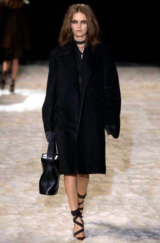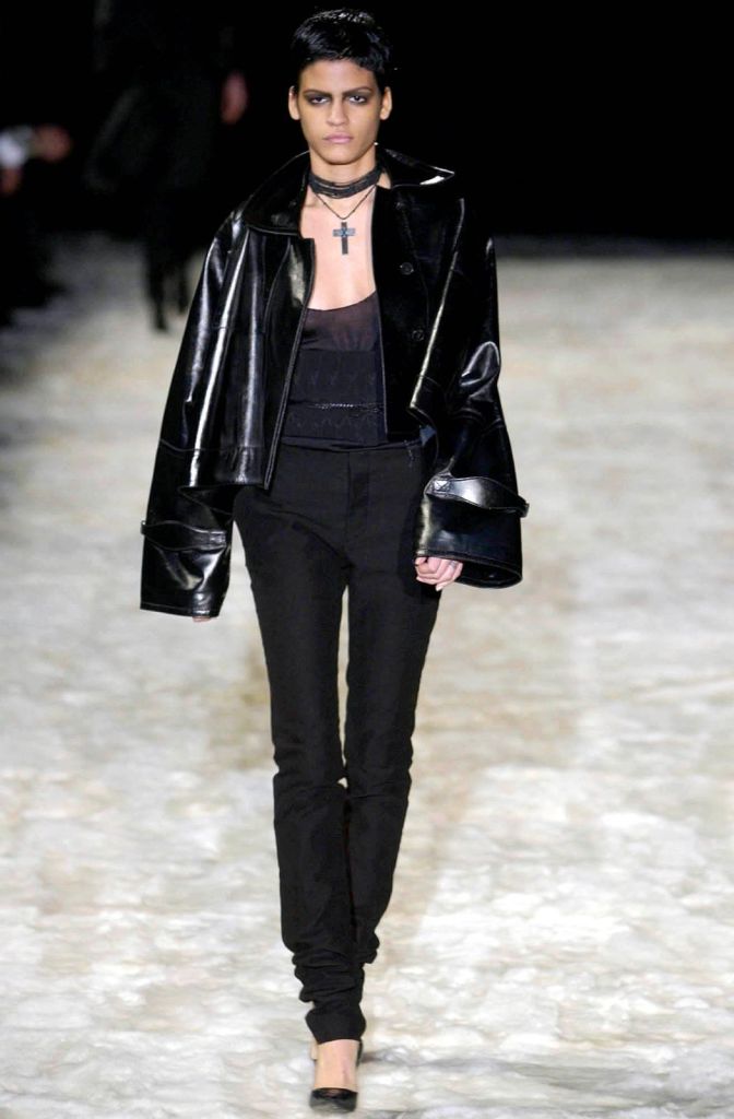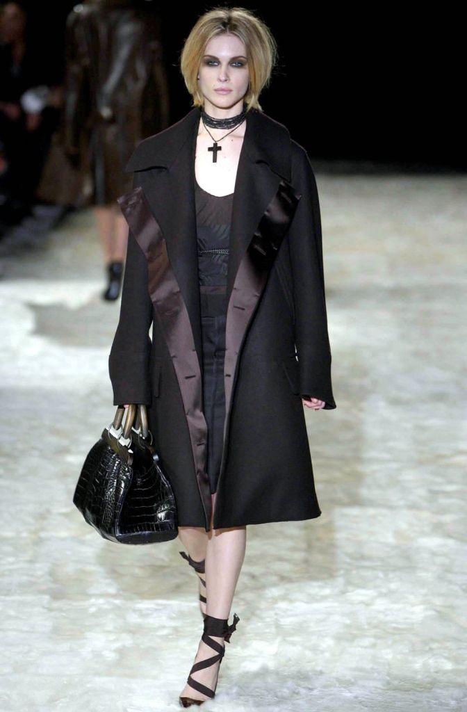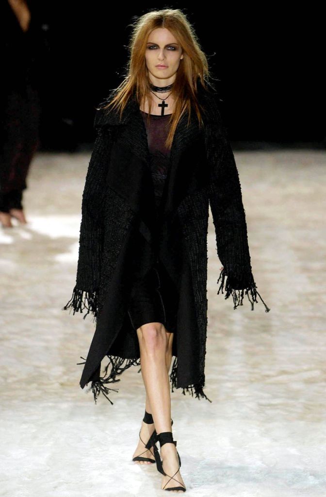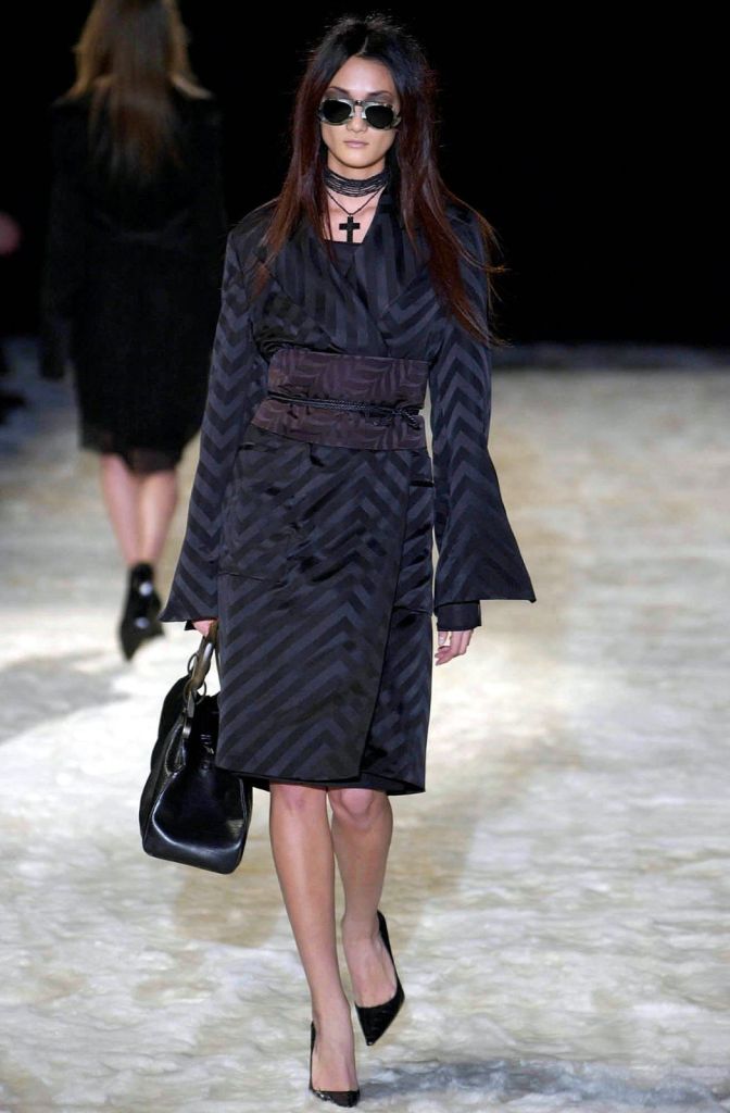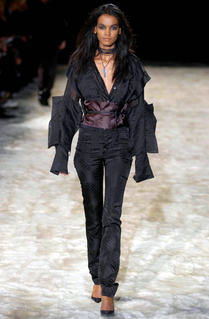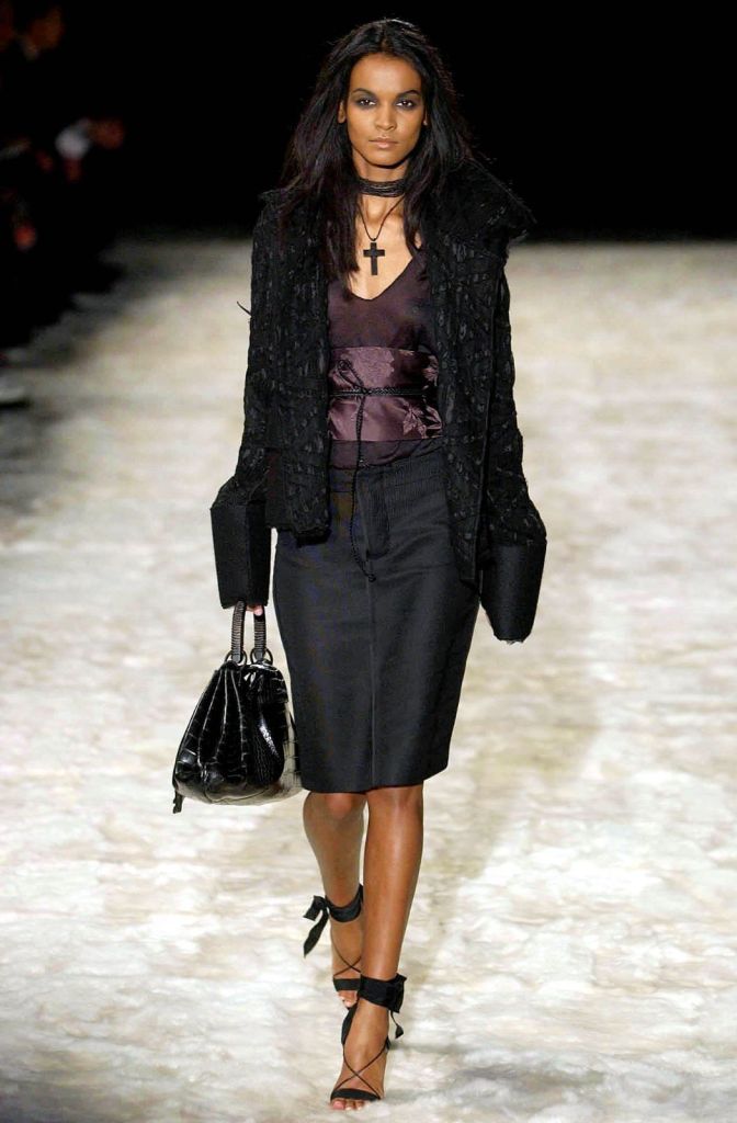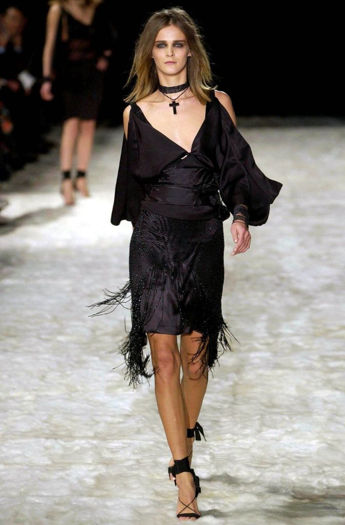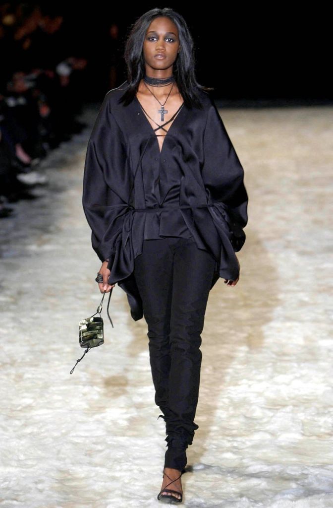 This collection is an exploration of all-black ensembles, exuding a potent blend of dark rock and roll and gothic energy. The collection offers a range of ultra-glam clothes, perfect for those who want to make a striking fashion statement. What stands out is the clever styling, which seamlessly combines various luxe textures, creating an intriguing visual depth. From leather to satin, each piece feels meticulously crafted. Drawing inspiration from vintage Hollywood, Gothic elements, and Japanese kimonos, this collection impresses with intricate detailing. This collection resurrected the fearless rock-chick aesthetic from Tom Ford’s iconic mid-90s era; Love to see it!