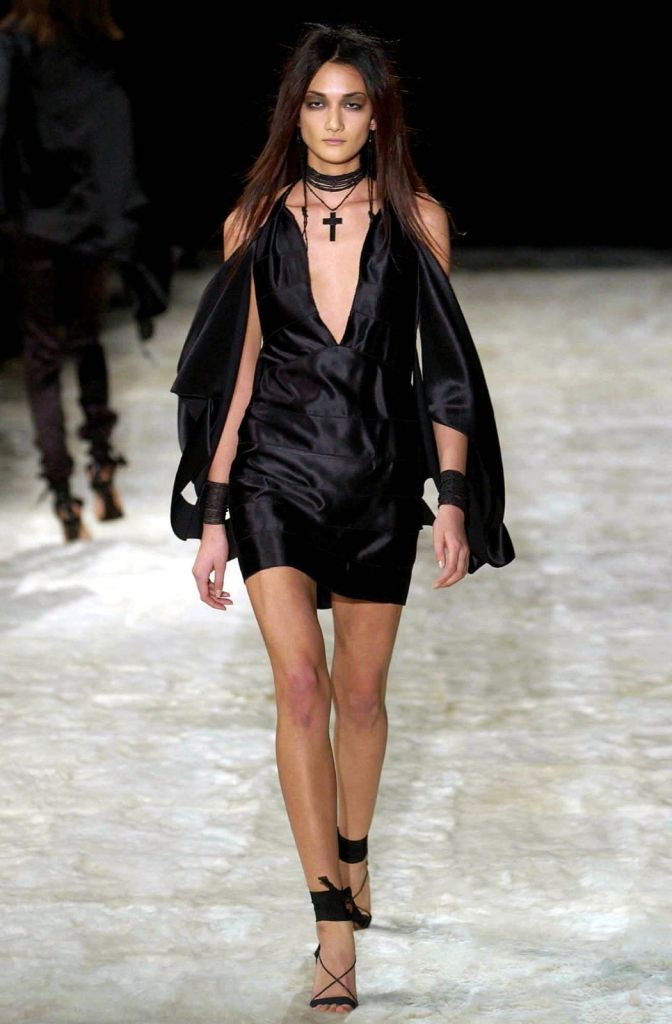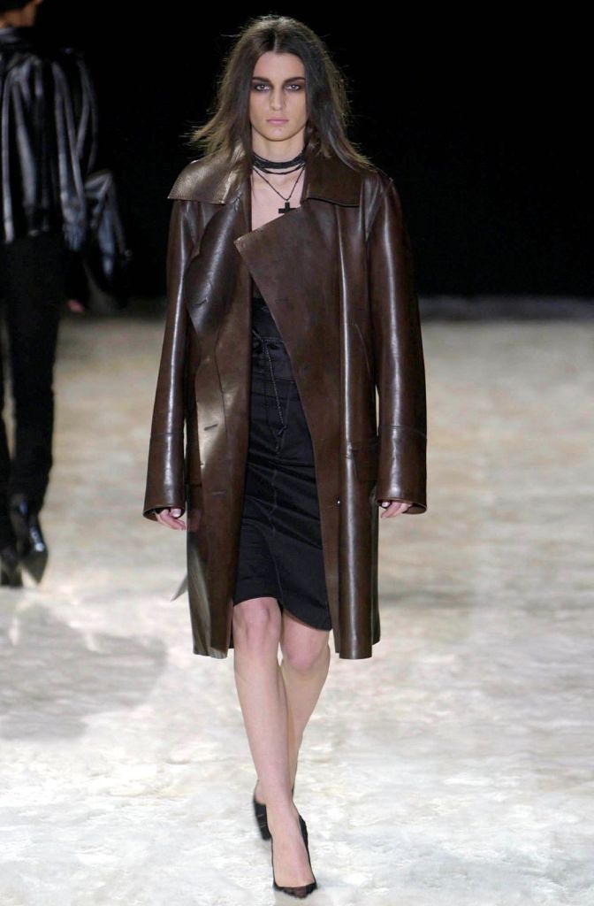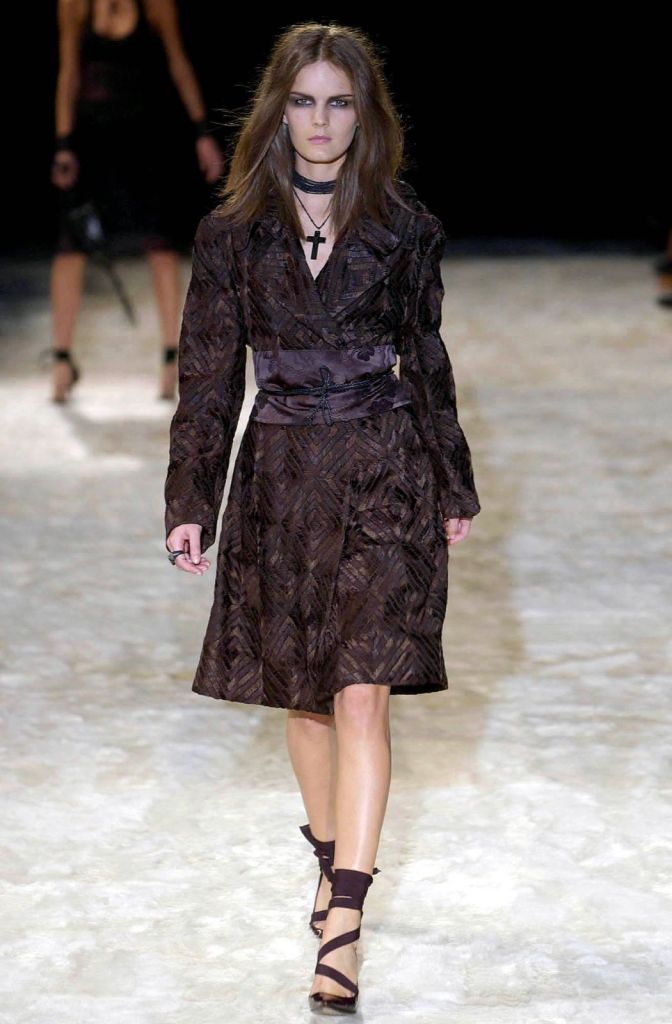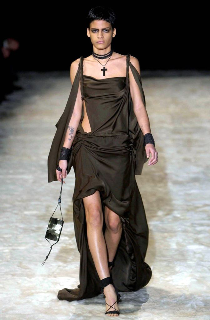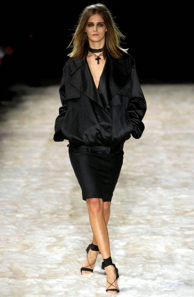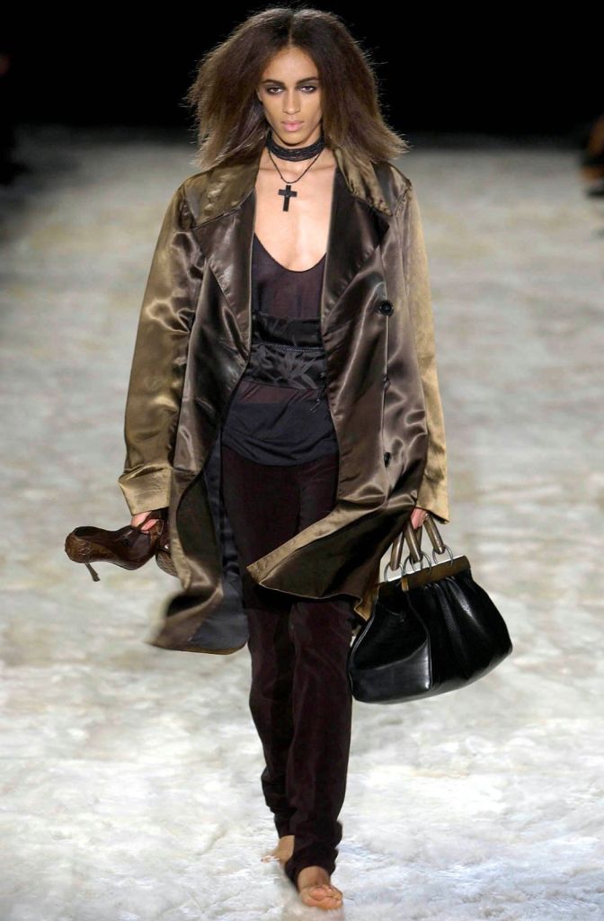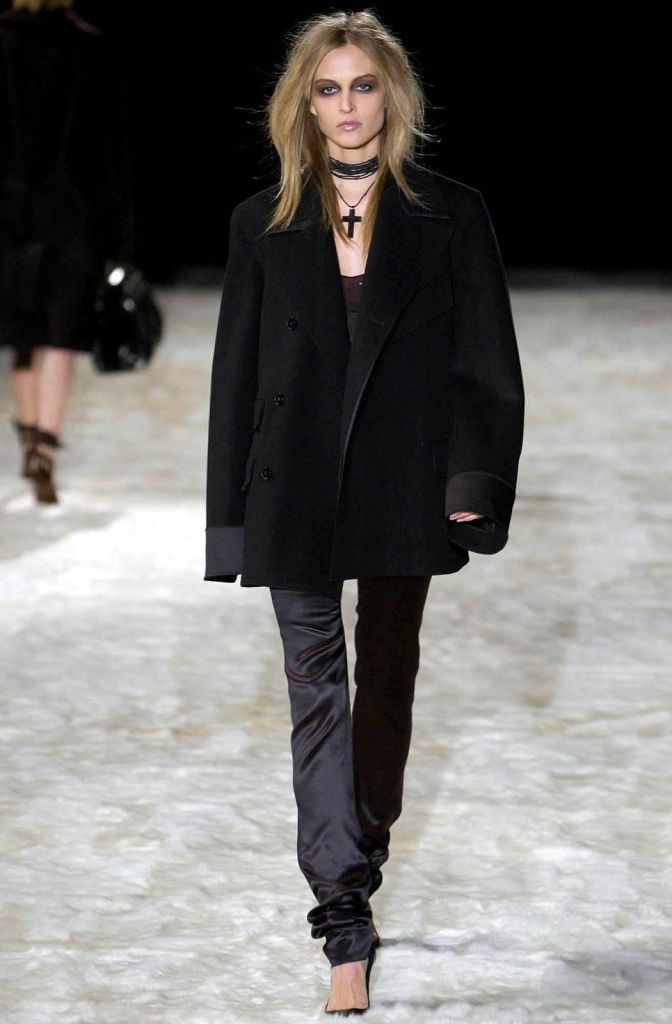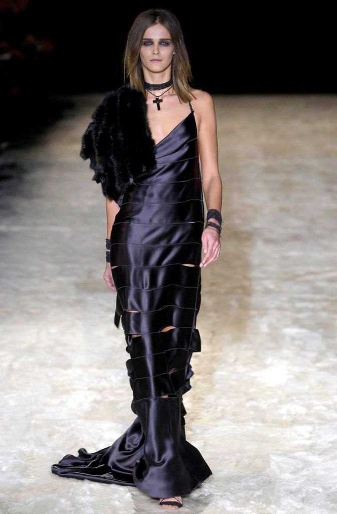 This collection is an exploration of all-black ensembles, exuding a potent blend of dark rock and roll and gothic energy. The collection offers a range of ultra-glam clothes, perfect for those who want to make a striking fashion statement. What stands out is the clever styling, which seamlessly combines various luxe textures, creating an intriguing visual depth. From leather to satin, each piece feels meticulously crafted. Drawing inspiration from vintage Hollywood, Gothic elements, and Japanese kimonos, this collection impresses with intricate detailing. This collection resurrected the fearless rock-chick aesthetic from Tom Ford’s iconic mid-90s era; Love to see it!